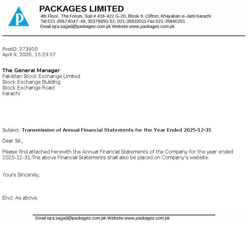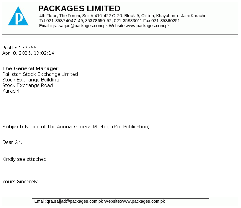 Packages Limited is a public limited company incorporated in Pakistan. It is principally engaged in the manufacture and sale of packaging materials and tissue products. The Company also holds investments in companies.