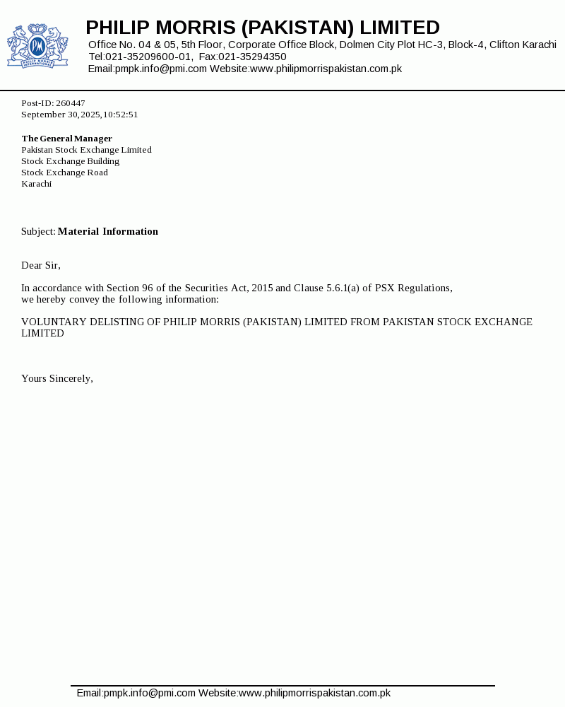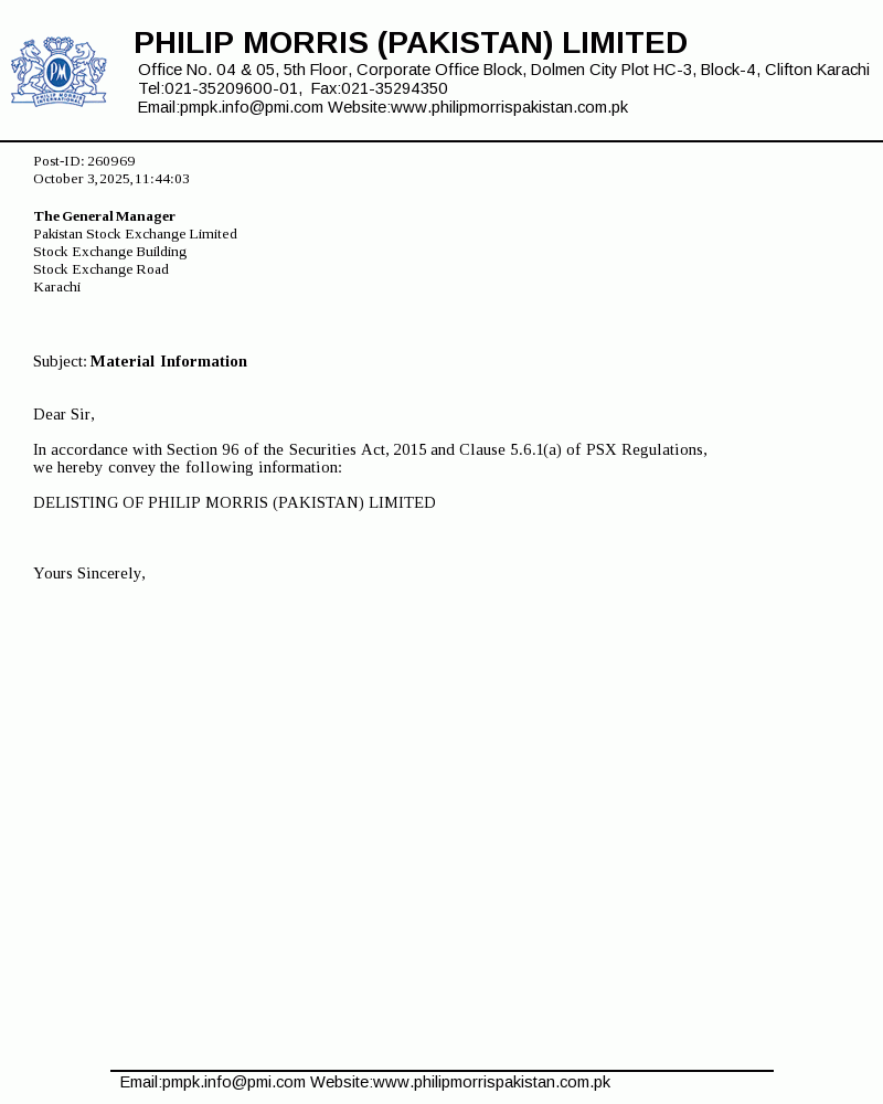 Philip Morris (Pakistan) Limited (PMPKL) is an affiliate of Philip Morris International (PMI). PMPKL acquired Lakson Tobacco Company Limited as a majority shareholder. On February 25, 2011, the name of the Company was changed to Philip Morris (Pakistan) Limited (the Company). The principal activity of the Company is the manufacturing and sale of cigarettes and tobacco products.