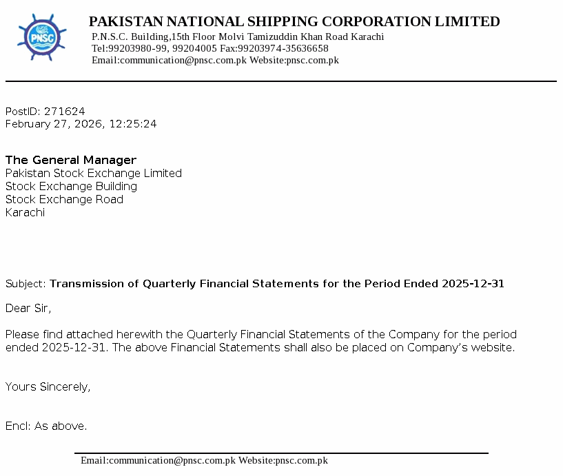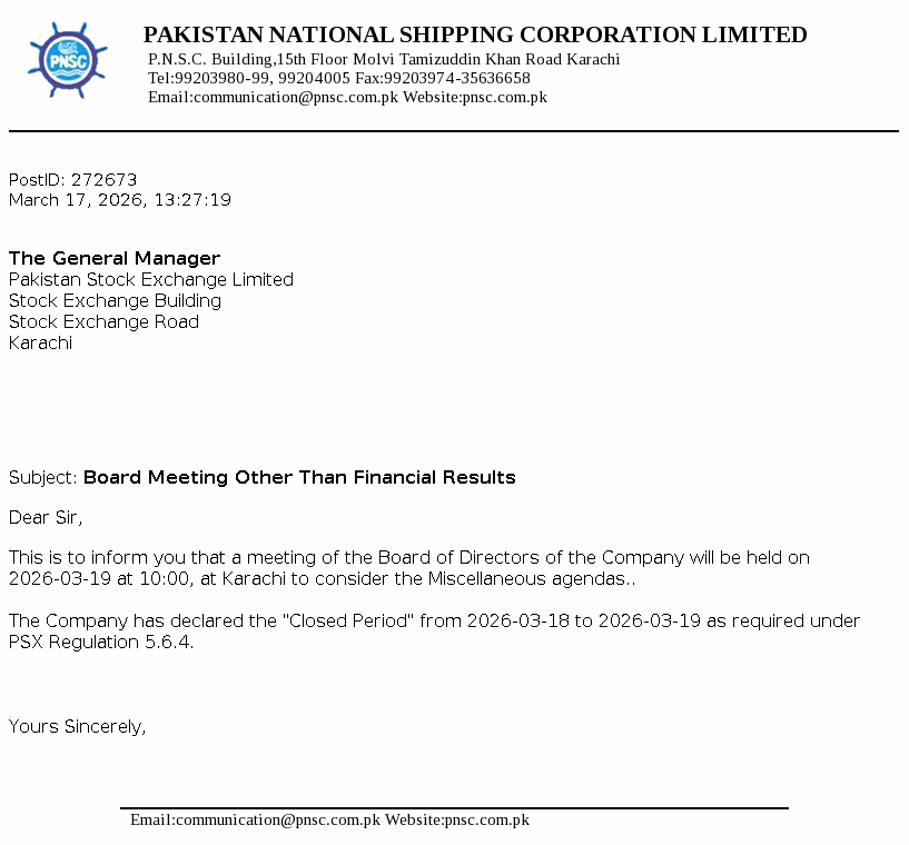 Pakistan National Shipping Corporation was established under the provisions of the Pakistan National Shipping Corporation Ordinance, 1979 and is principally engaged in the business of shipping, including charter of vessels, transportation of cargo and other related services and providing commercial, technical, administrative, financial and other services to its subsidiaries and third parties in relation to the business of shipping. The Corporation is also engaged in renting out its properties to tenants under lease arrangements.
