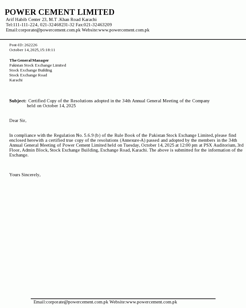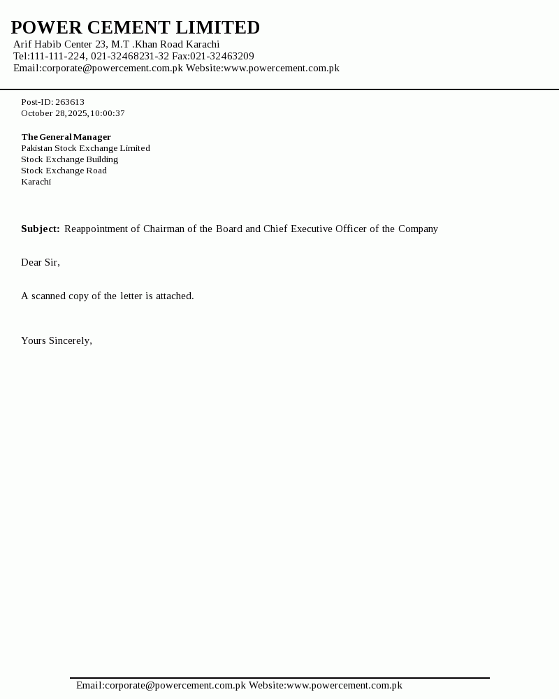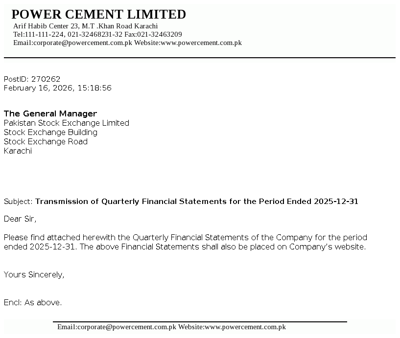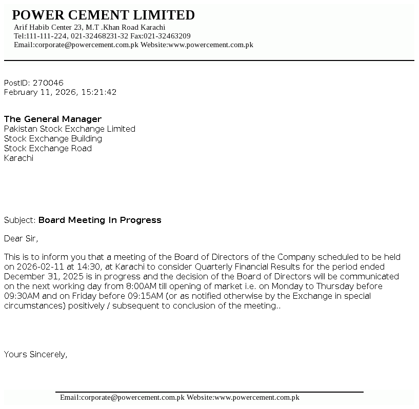 Power Cement Limited was incorporated in Pakistan as a private limited company on December 1, 1981 and was converted into a public limited company on July 9, 1987. The Company's principal activity is manufacturing, selling and marketing of cement.