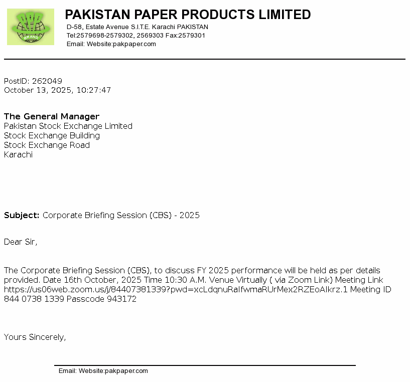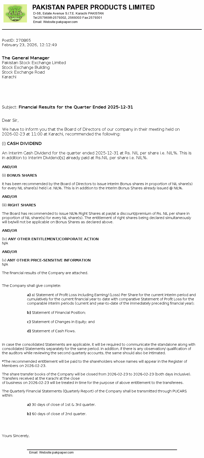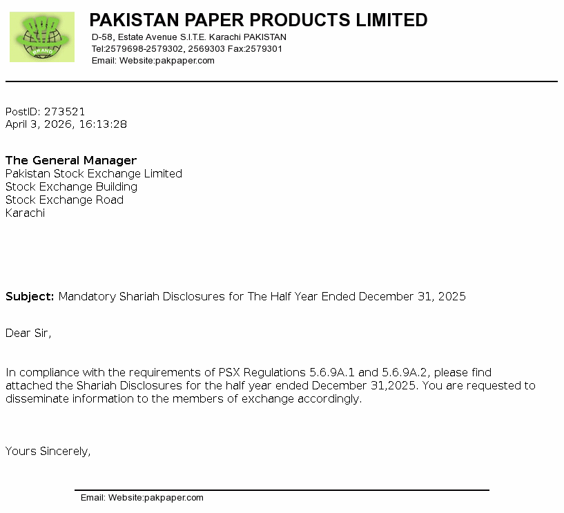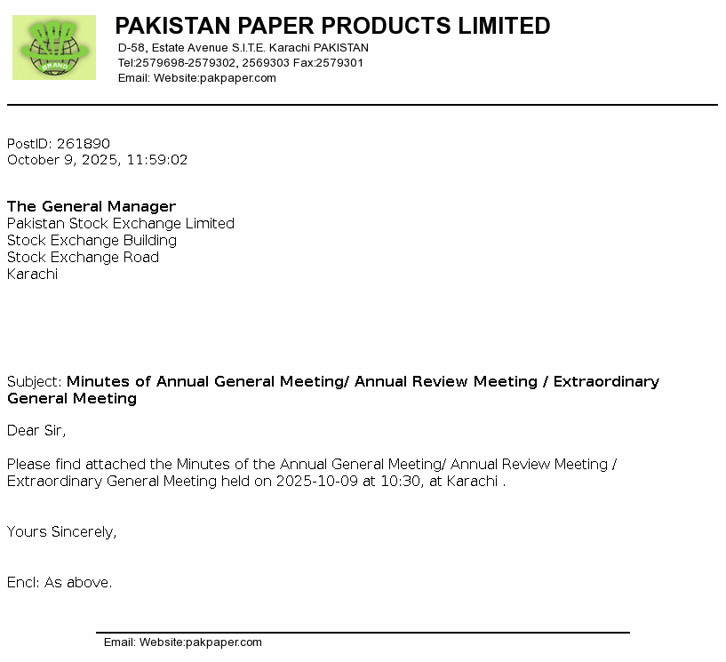 Pakistan Paper Products Limited was incorporated as in July, 1962 as a private limited company and was converted into public limited company in July 1964. The company is principally engaged in the production and sale of exercise books, pro-labels and sensitized papers.