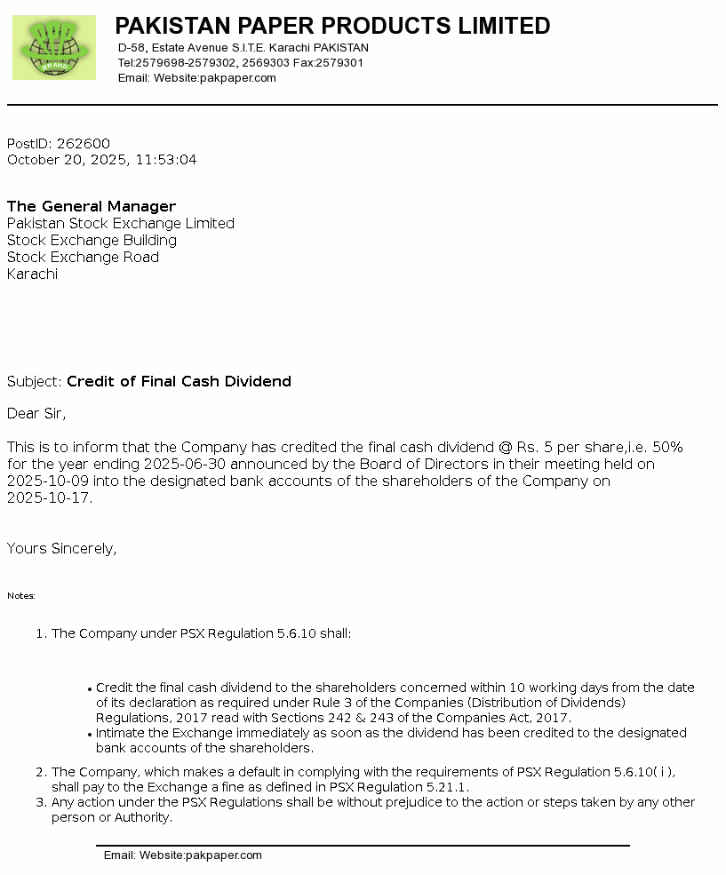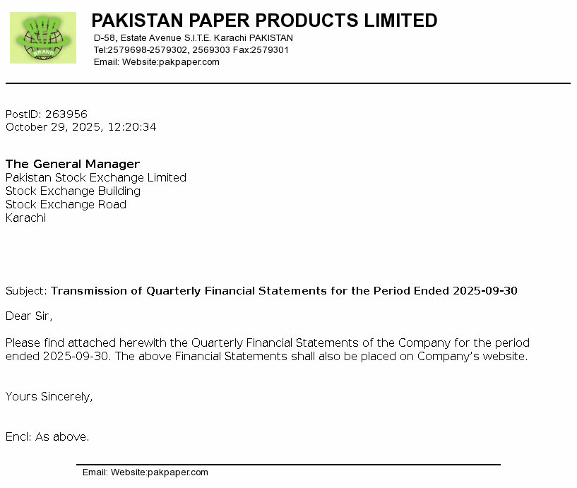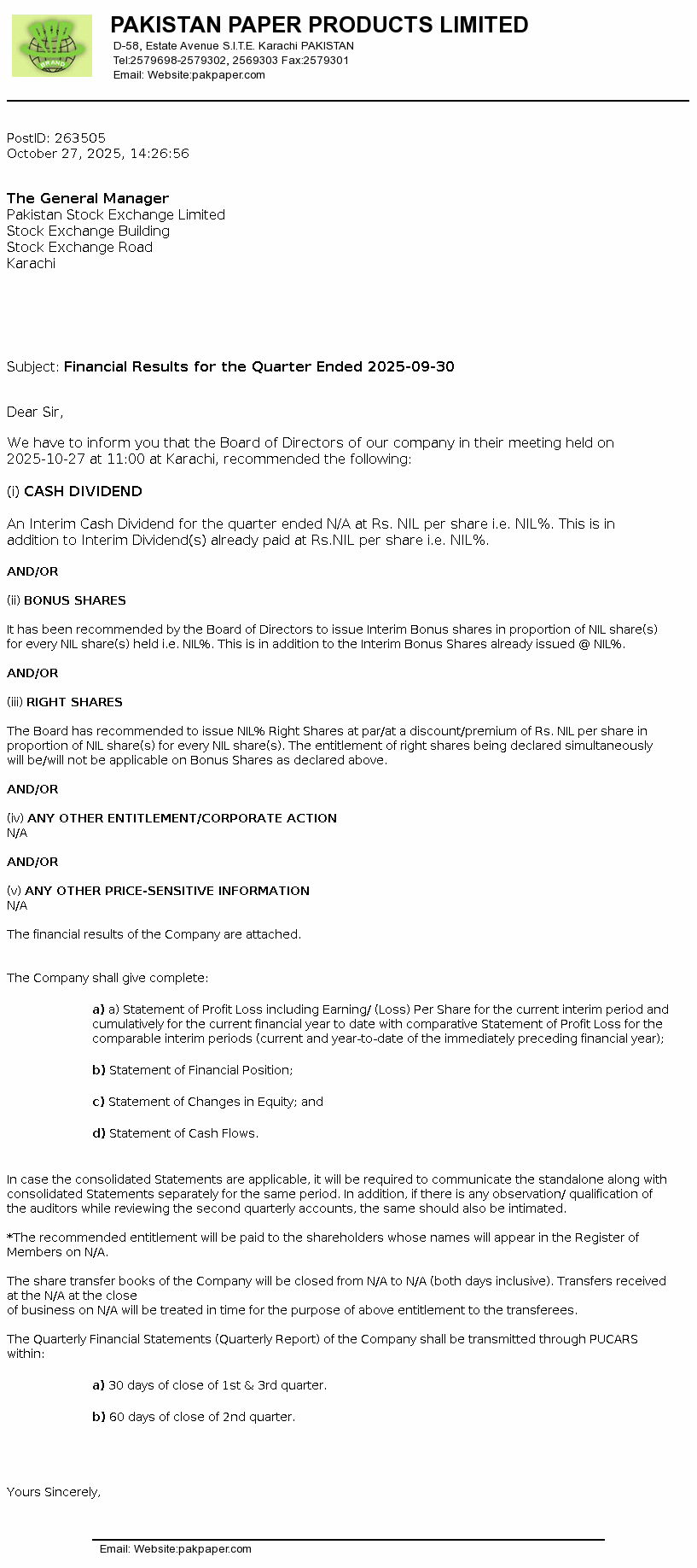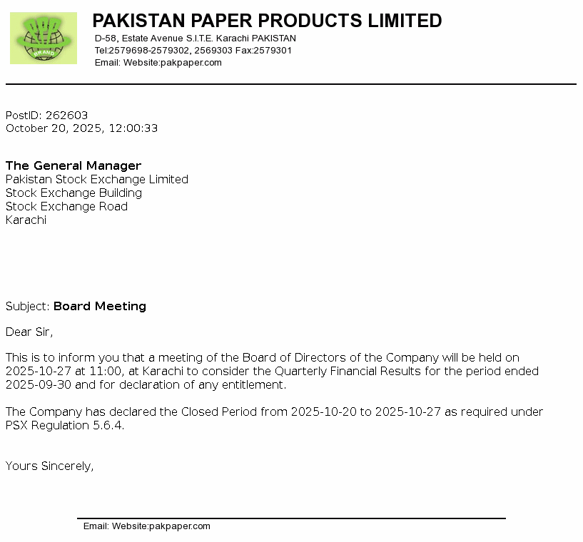 Pakistan Paper Products Limited was incorporated as in July, 1962 as a private limited company and was converted into public limited company in July 1964. The company is principally engaged in the production and sale of exercise books, pro-labels and sensitized papers.