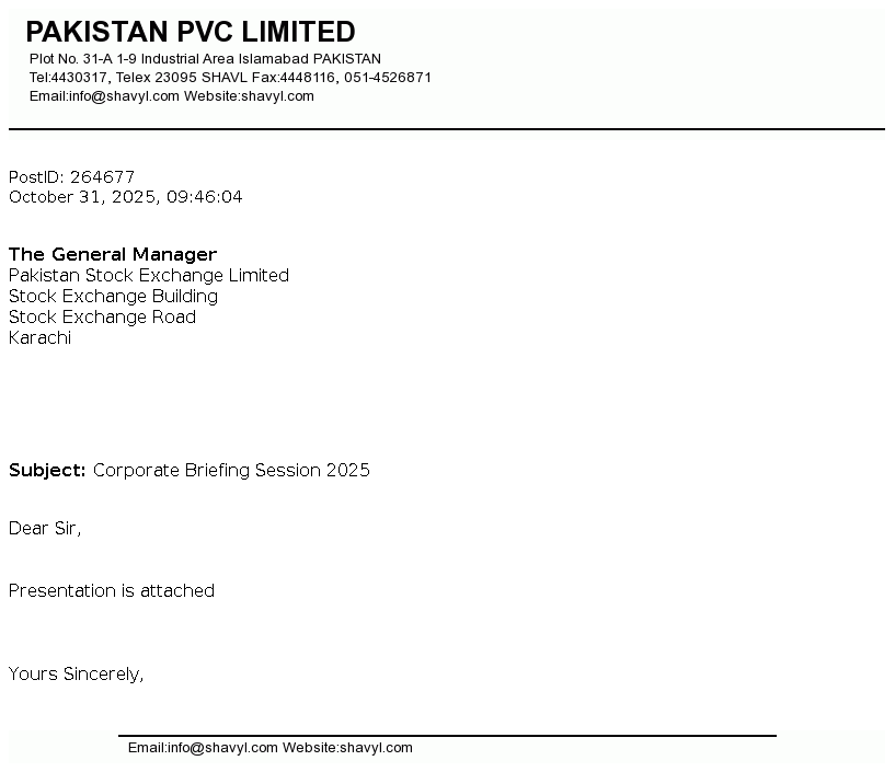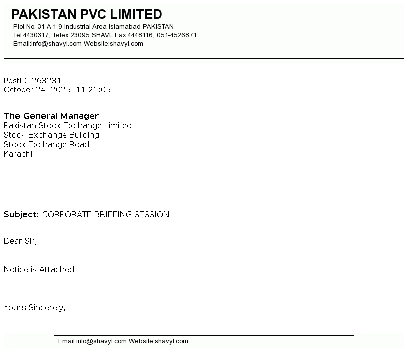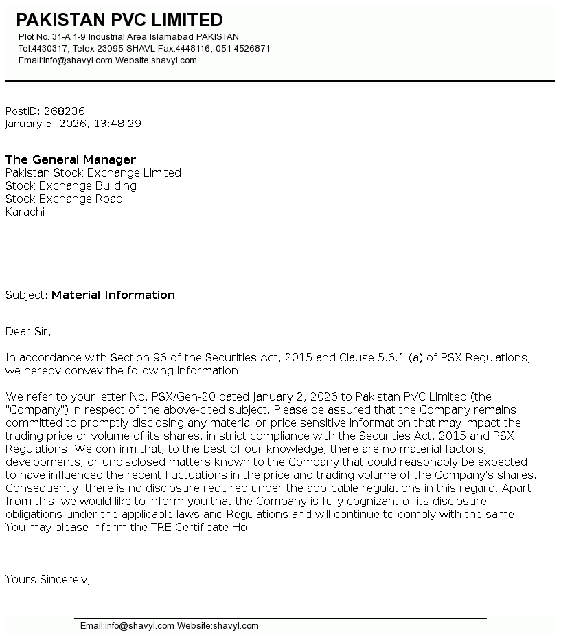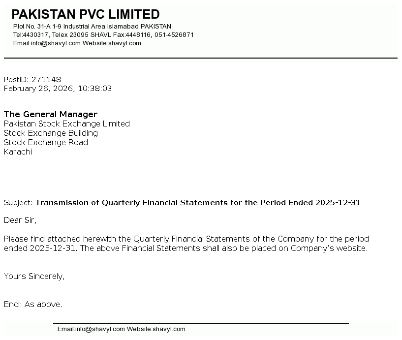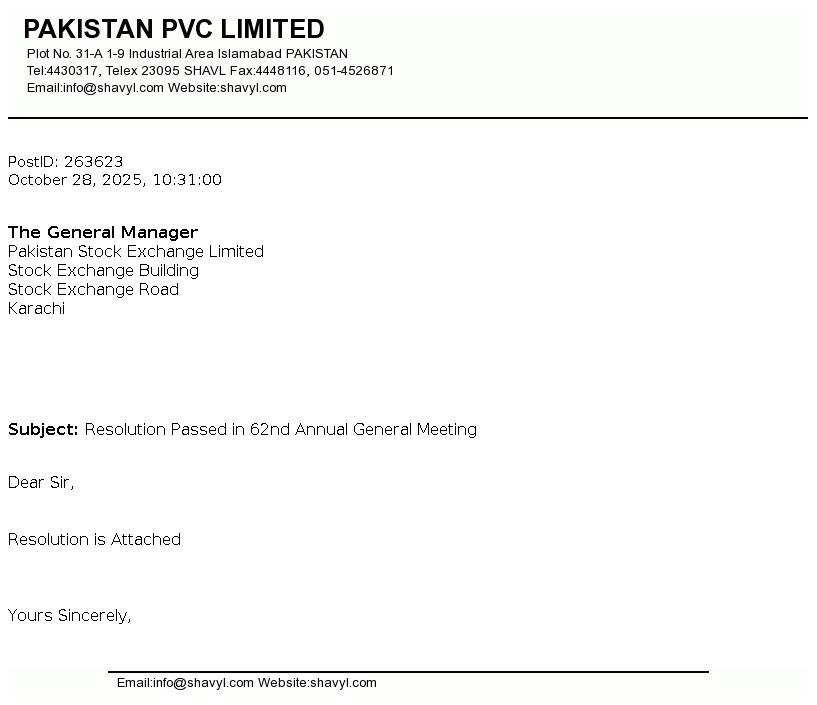 Pakistan PVC Limited is incorporated in Pakistan on October 19, 1963. The company is engaged in production and sale of PVC resin, PVC pipes and fittings, PVC compound and Caustic soda and to Lease (Land, Building and Other Infrastructures).