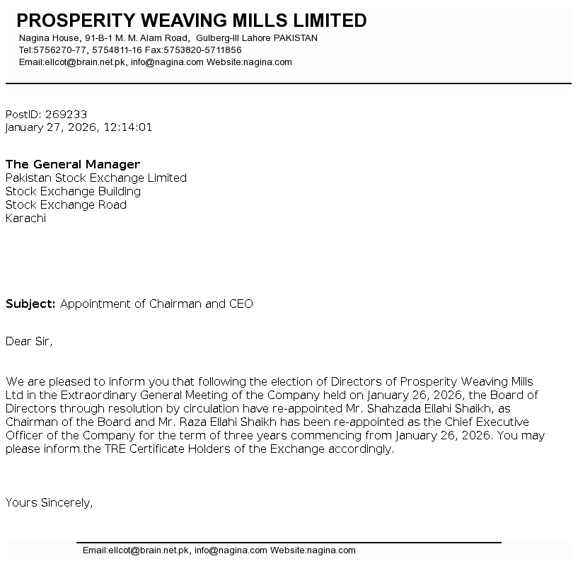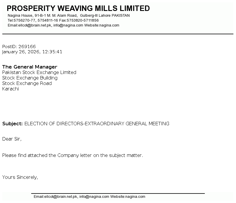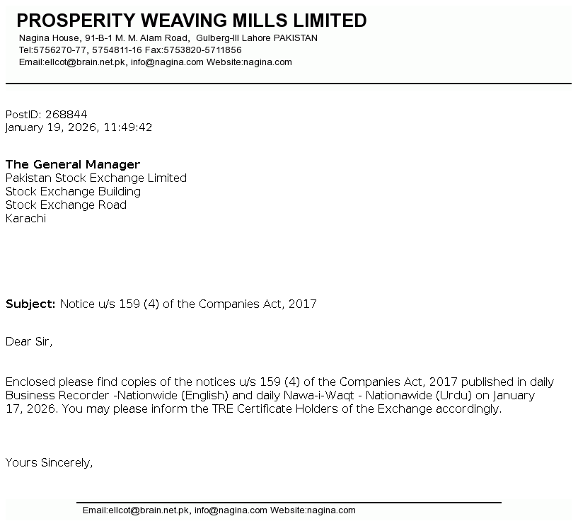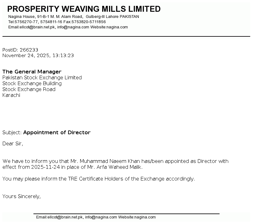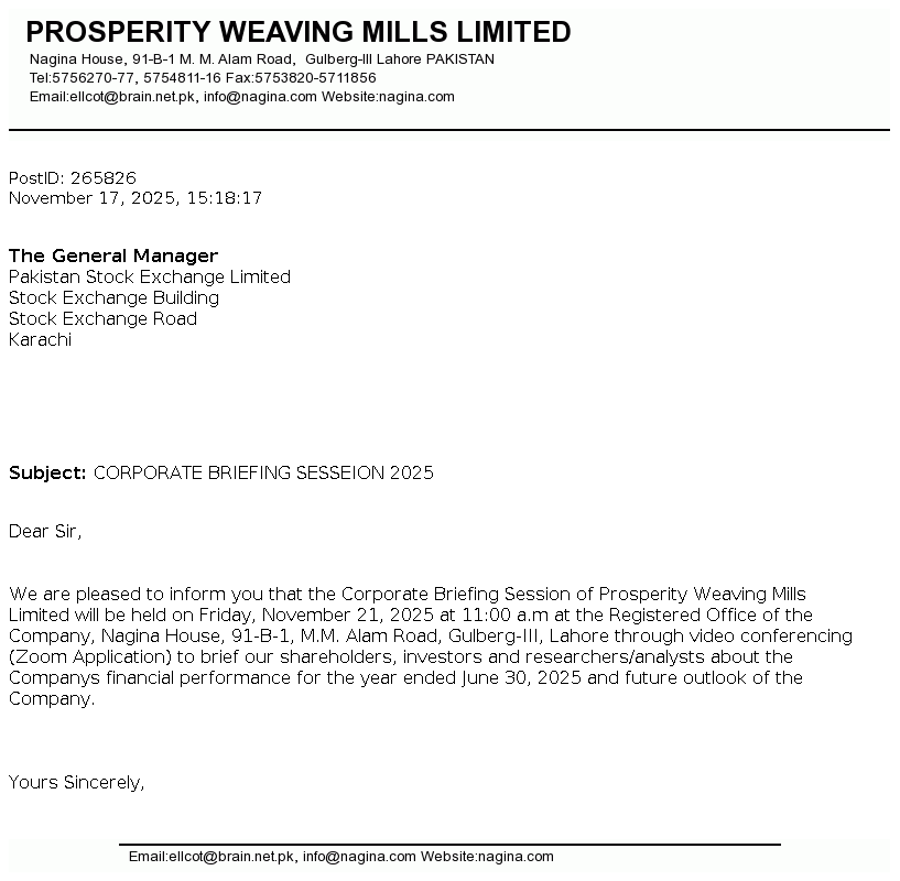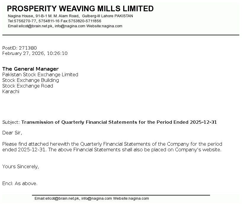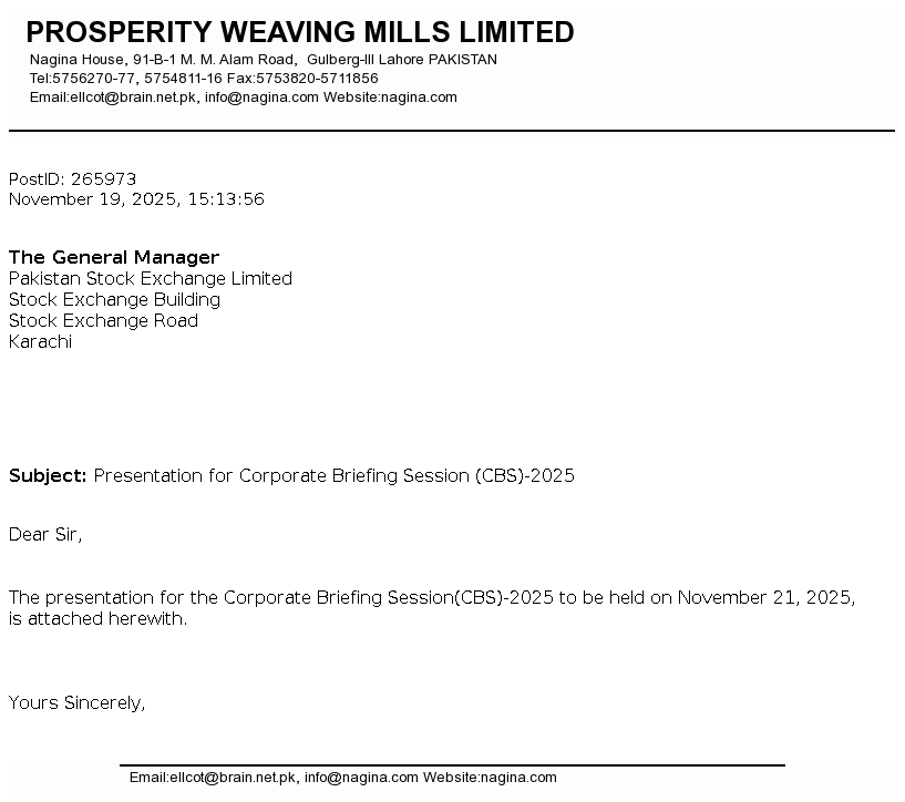 Prosperity Weaving Mills Limited was incorporated in Pakistan on November 20, 1991 as a public limited Company under the repealed Companies Ordinance, 1984 (Now Companies Act 2017). The principal activity of the Company is manufacturing and sale of woven cloth.