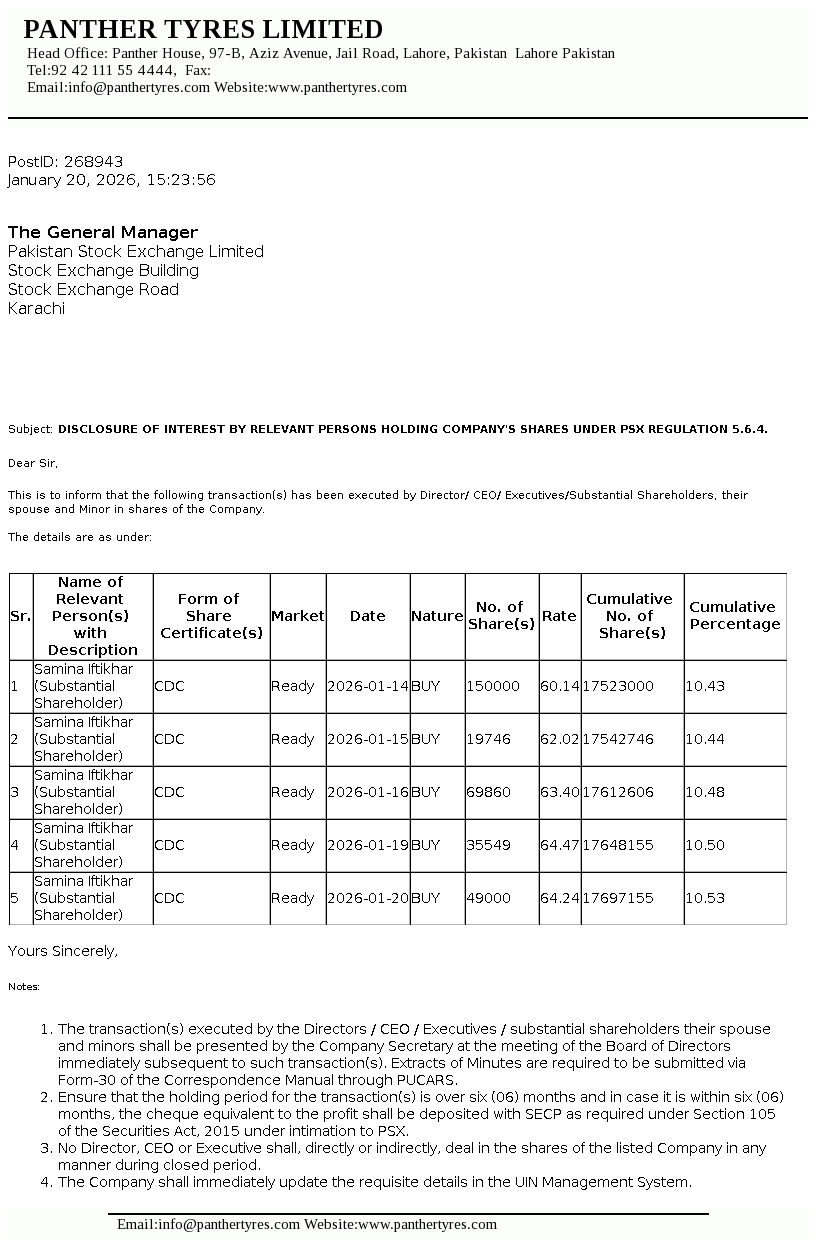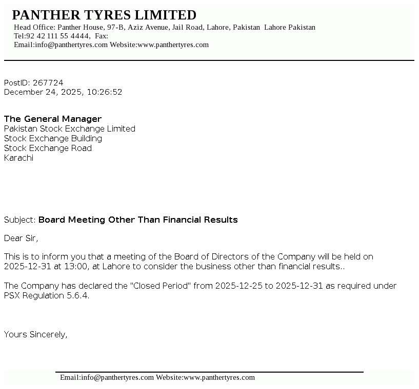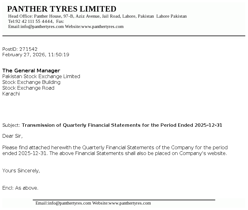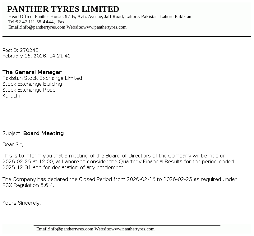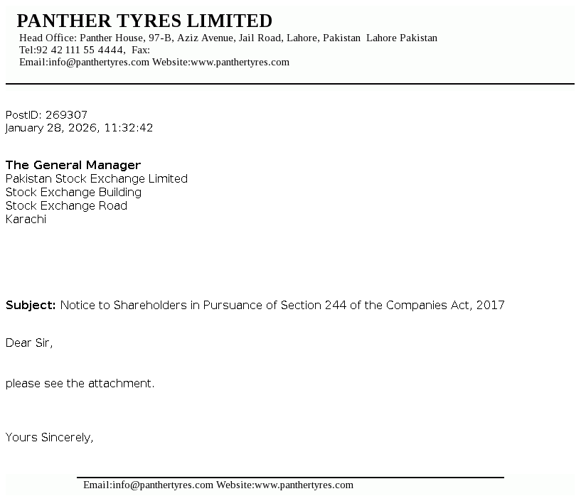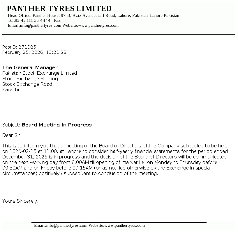 Panther Tyres Limited was incorporated as a private limited company under the Companies Act, 1913 and was converted into a public limited company with effect from 10 October 2003. The Company is principally engaged in the manufacture and sale of tyres and tubes for vehicles.