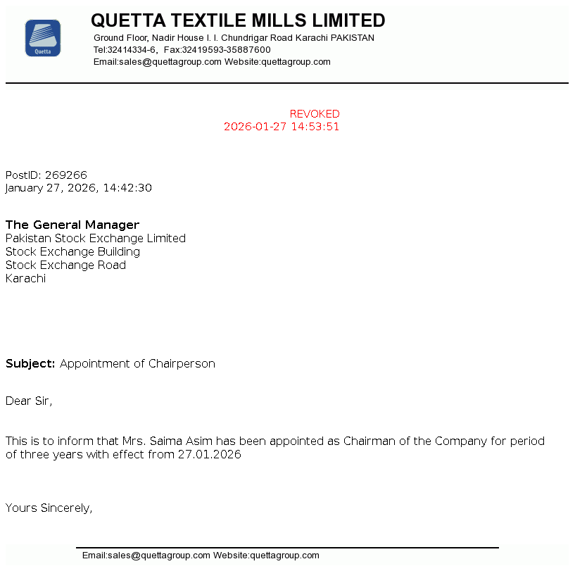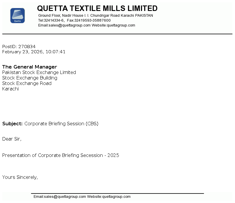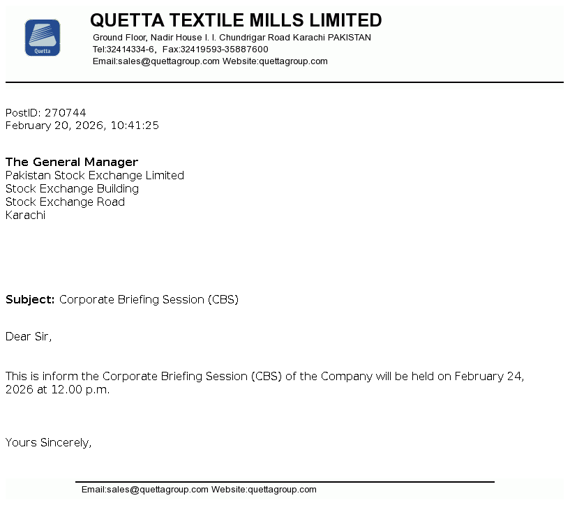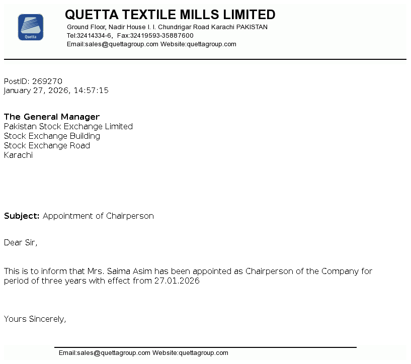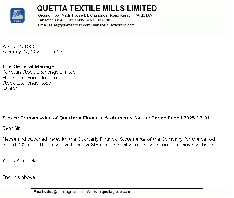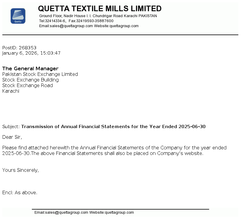 Quetta Textile Mills Limited was incorporated in Pakistan as a Public limited Company on January 29, 1970 under the Companies Ordinance, 1984 (repealed) (now the Companies Act 2017). The company is principally engaged in manufacturing and sale of Yarn and Fabric.