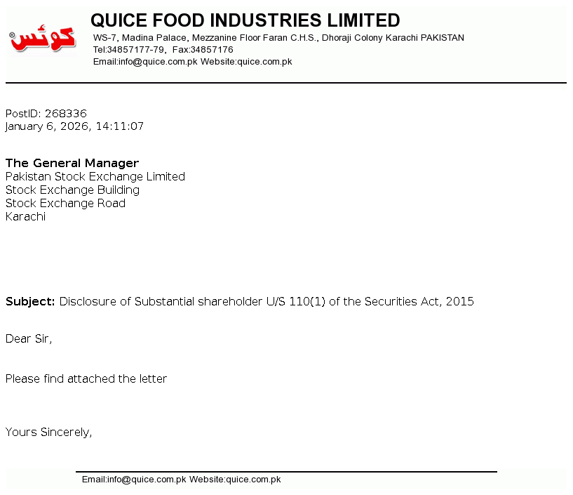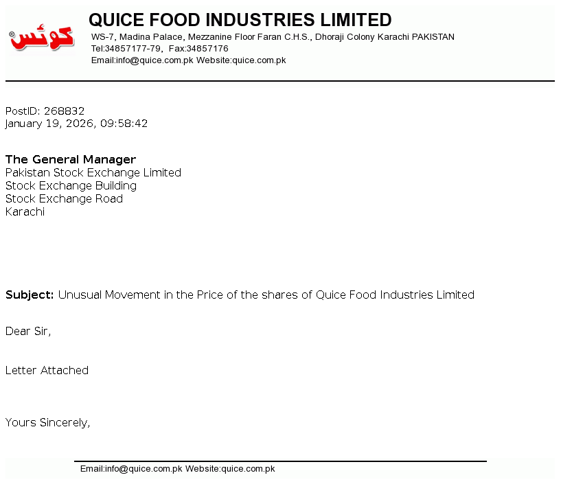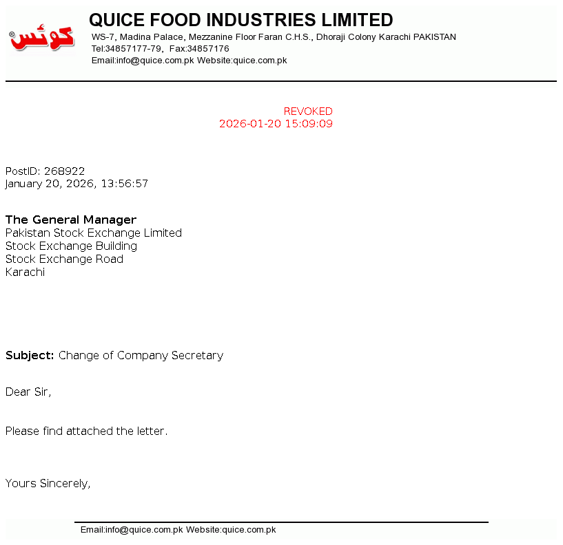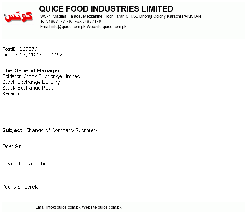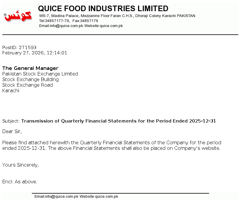 Quice Food Industries Limited was incorporated in Pakistan on 12 March 1990 as a Private Limited Company and was converted into Public Limited Company on 13 December 1993. Principal activities of the Company are manufacturing and sale of Jam, Jelly, Syrups, Custard powder, Pickles, Essence, Juices and Aerated drinks and its Allied Products.