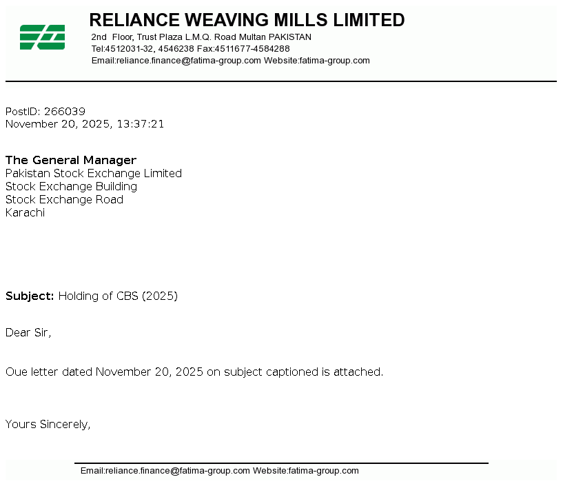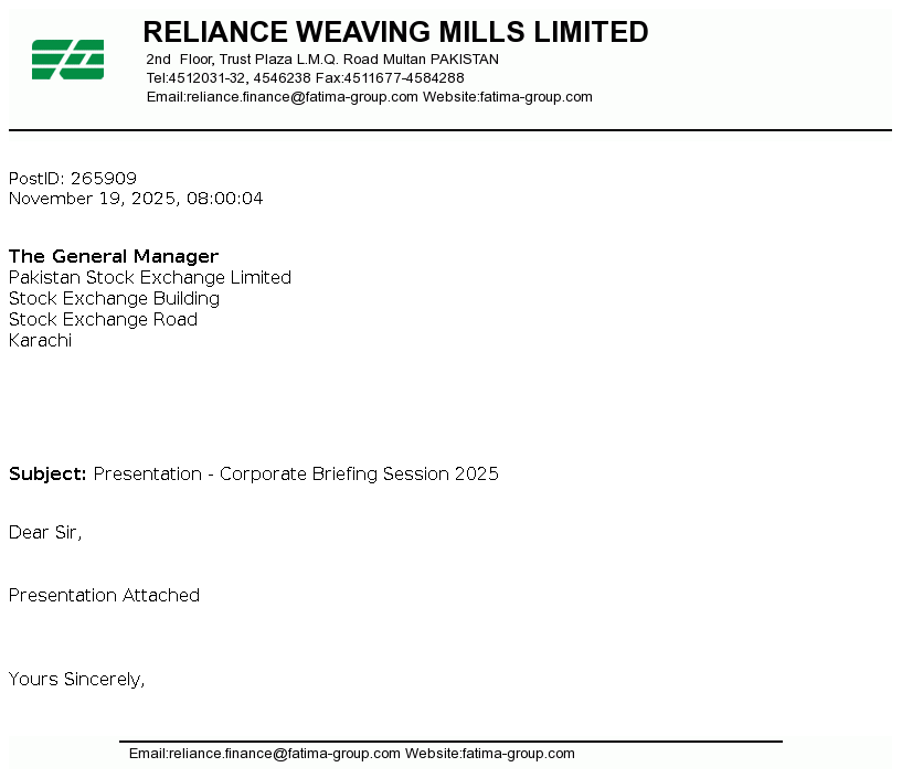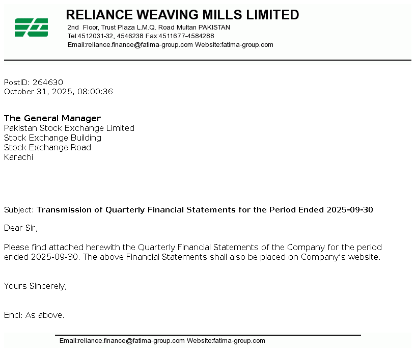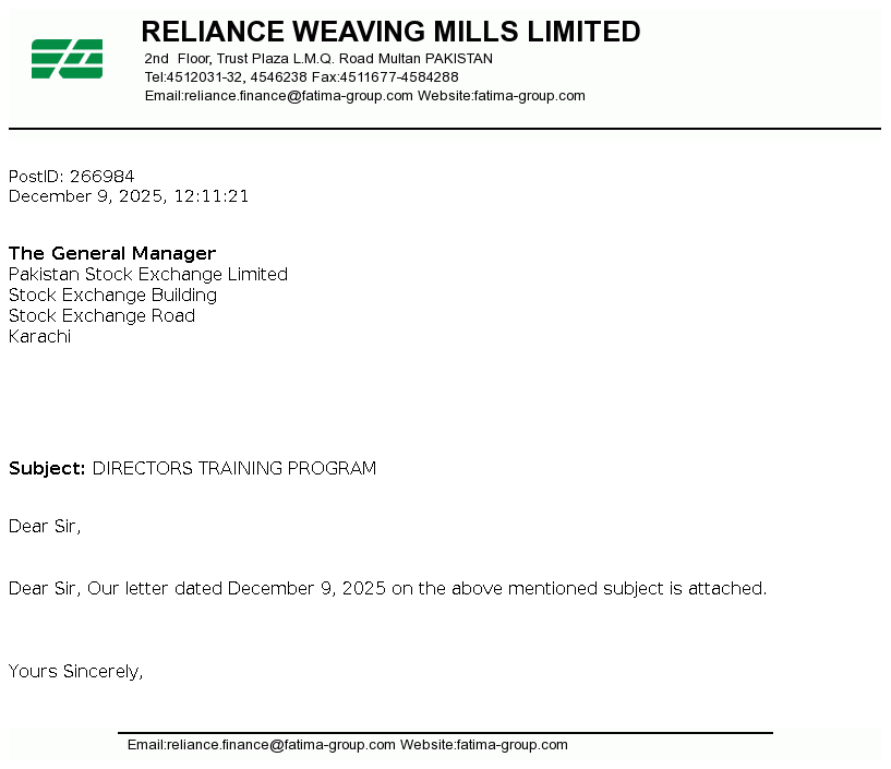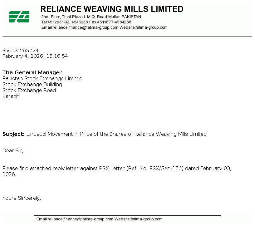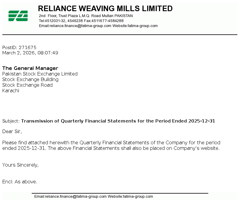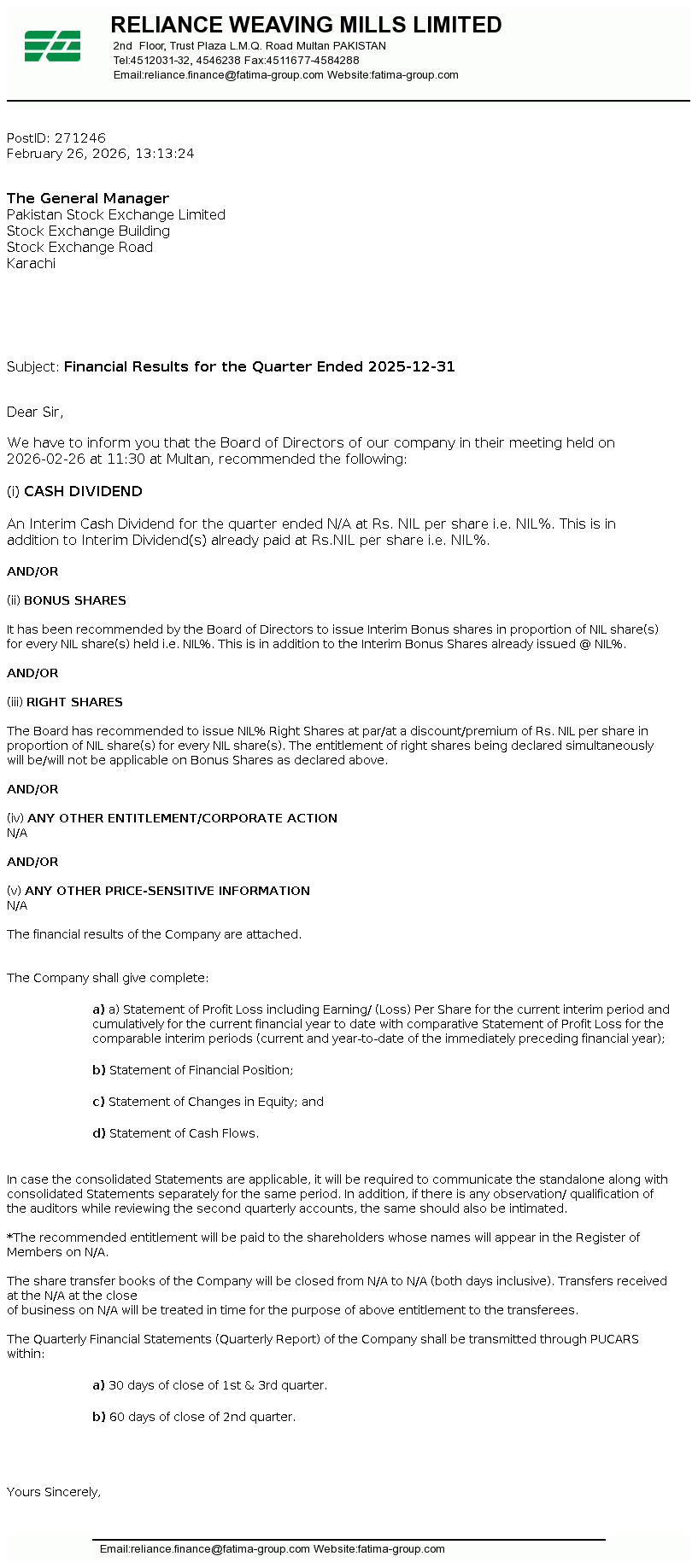 Reliance Weaving Mills Ltd. was incorporated in Pakistan as a public limited company on April 07, 1990 under the Companies Ordinance, 1984 (now the Companies Act, 2017). The Company commenced its operations on May 14, 1990 and is principally engaged in the manufacture and sale of yarn and fabric.