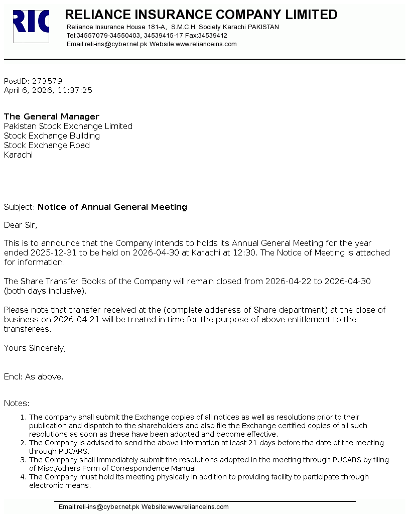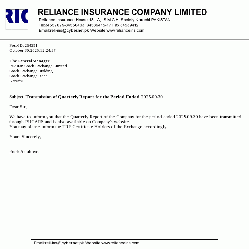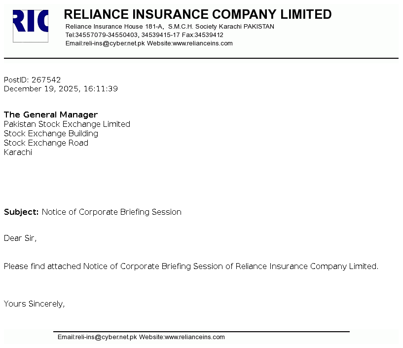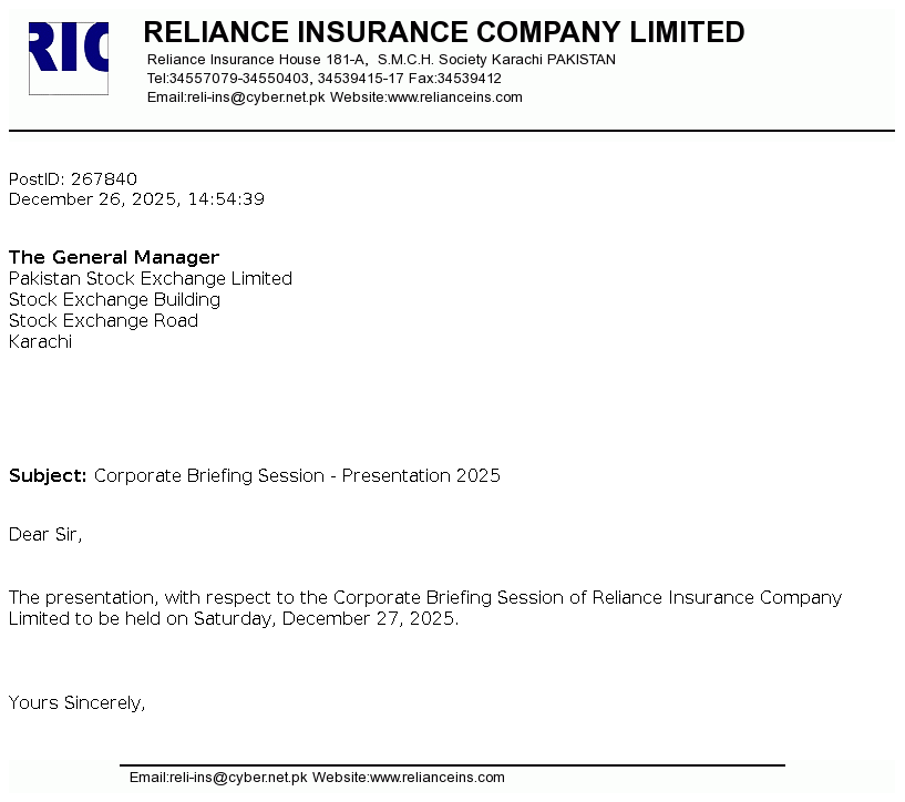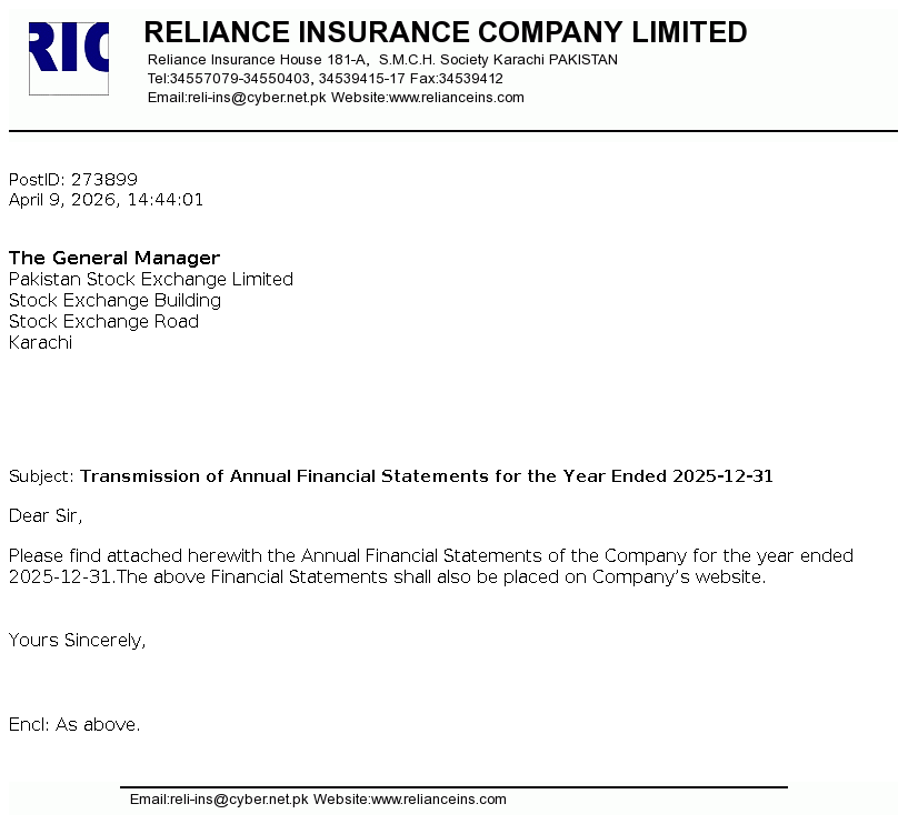 Reliance Insurance Company Limited was incorporated in Pakistan as a public limited company on November 4, 1981 and is engaged in general insurance business and has also been allowed to undertake General Window Takaful operations (WTO) on May 25, 2016 by Securities & Exchange Commission of Pakistan (SECP) under SECP Takaful Rules, 2012.