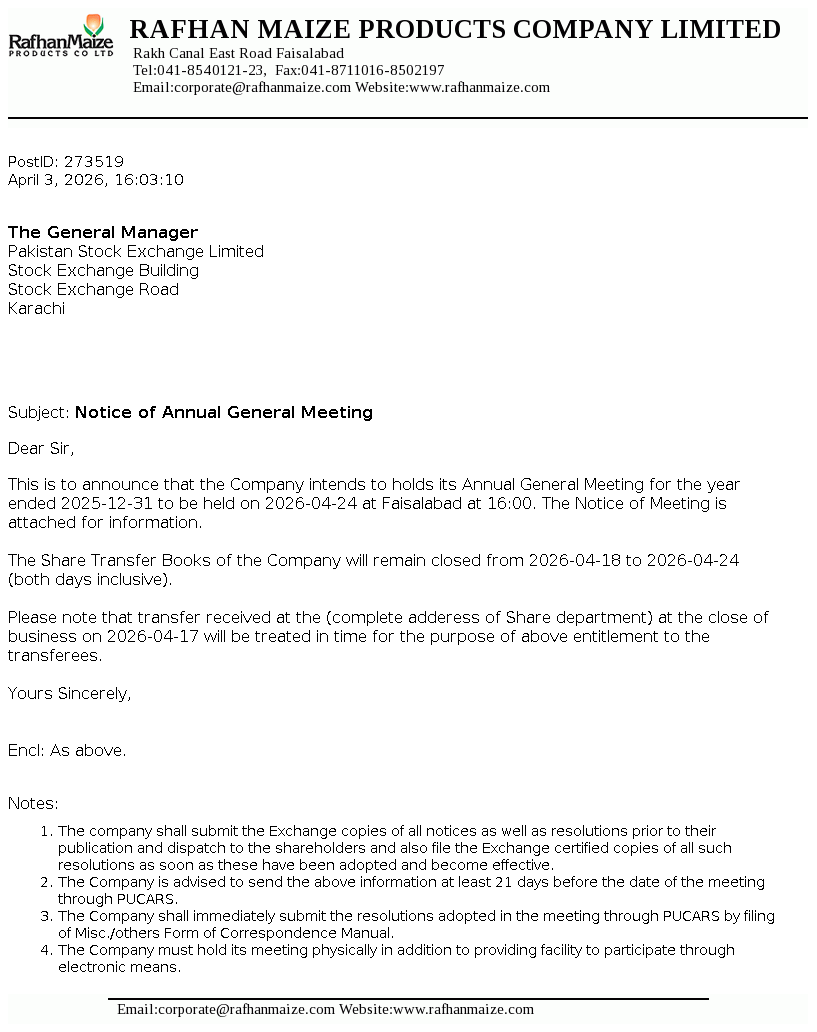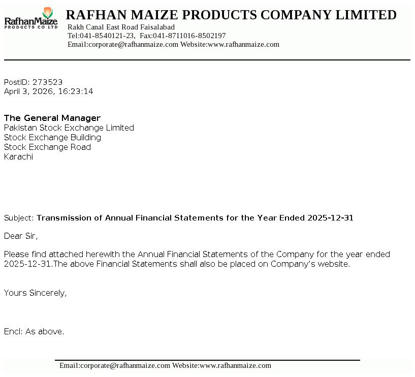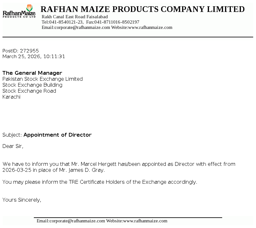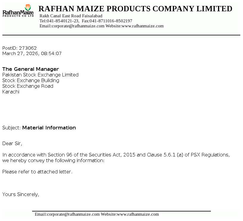 Rafhan Maize Products Company Limited was incorporated in Pakistan. Ingredion Incorporated Chicago. U.S.A., holds majority shares of the Company. The Company uses maize as the basic raw material to manufacture and sell a number of industrial products, principal ones being industrial starches, liquid glucose, dextrose, dextrin and gluten meals.