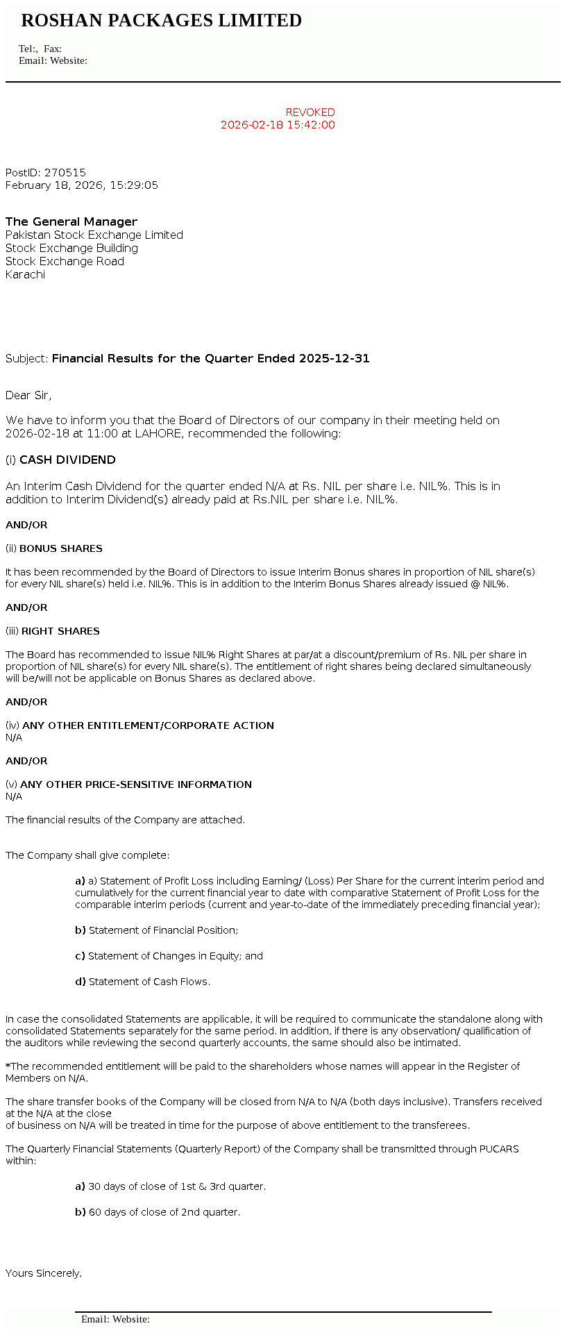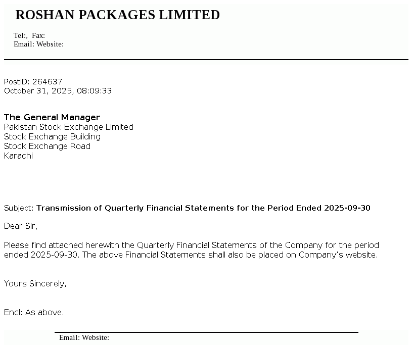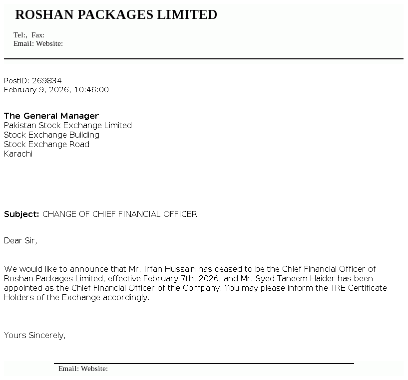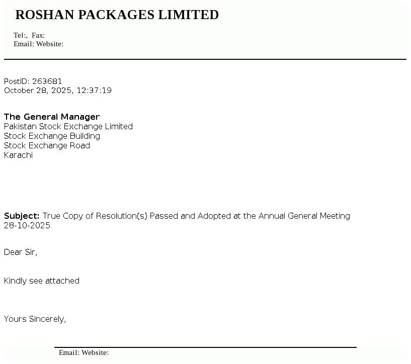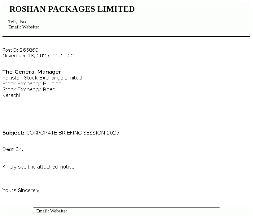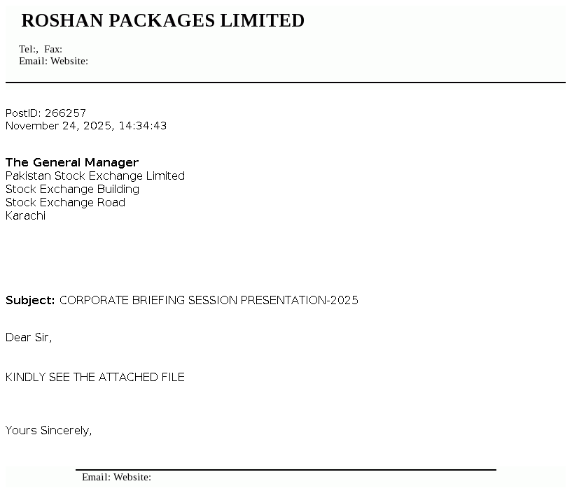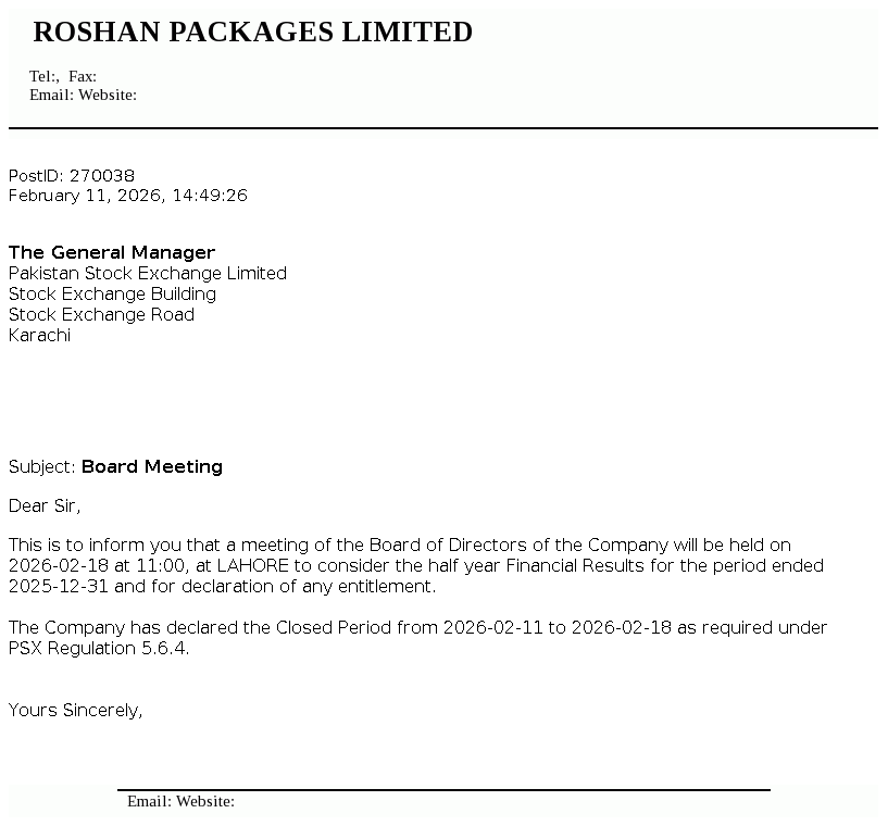 Roshan Packages Limited was incorporated in Pakistan as a private company limited by shares on 13 August 2002 under the Companies Act, 2017 . The Company was converted into a public limited company on 23 September 2016 and got listed on Pakistan Stock Exchange Limited on 28 February 2017. It is principally engaged in the manufacture and sale of corrugation and flexible packaging materials.