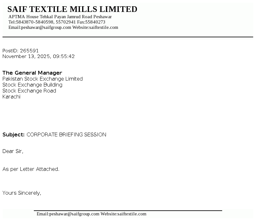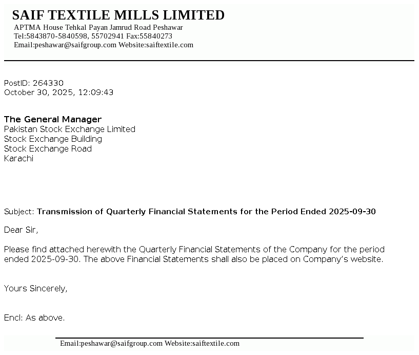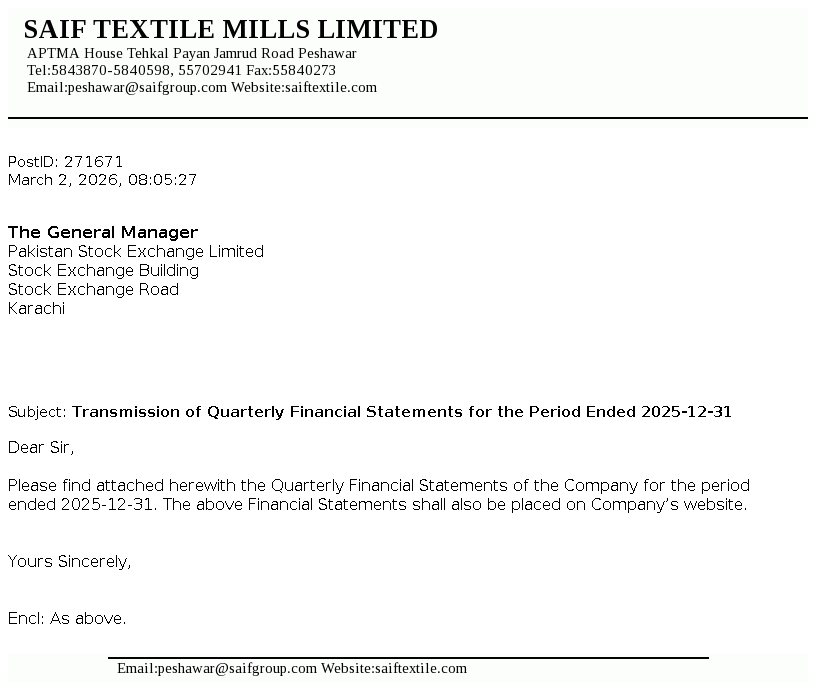 Saif Textile Mills Limited is a Public Limited Company incorporated in Pakistan on December 24, 1989 under the Companies Ordinance,1984 (now the Companies Act, 2017). The Company is principally engaged in manufacture and sale of yarn.