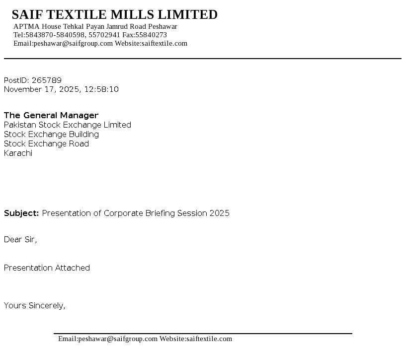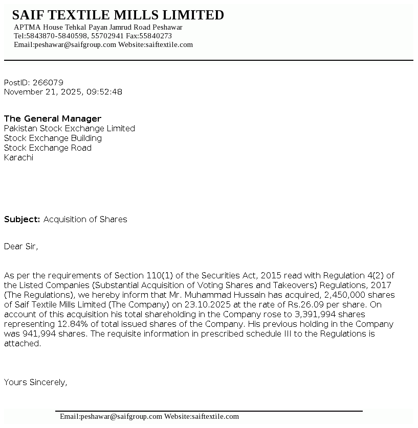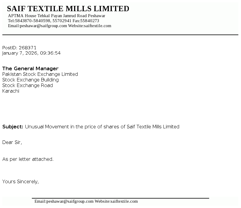 KPTMA House, Tehkal Payan, Jamrud Road, Peshawar Telephone: +92-91-5843870, 5702941 Fax: +92-91-5840273 Email: peshawar@saifgroup.com