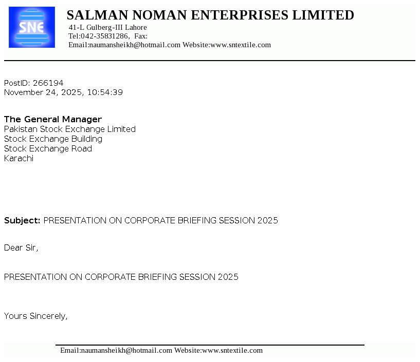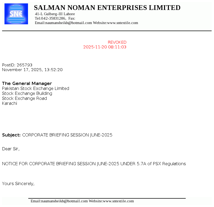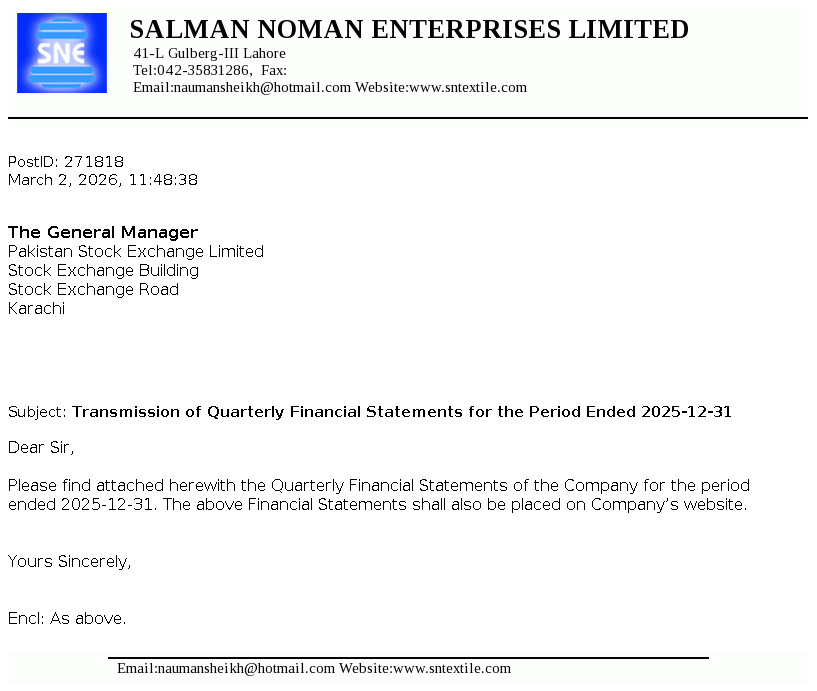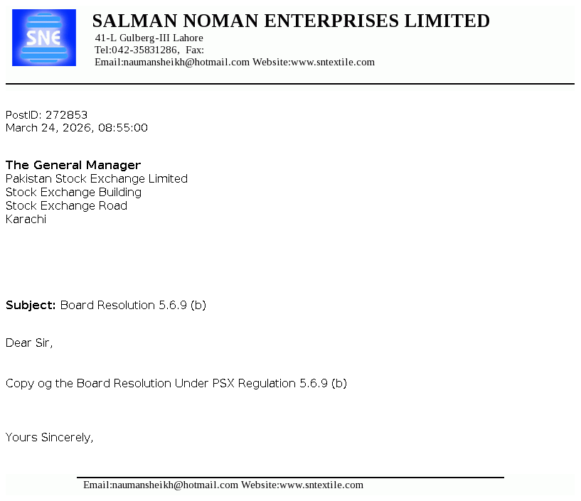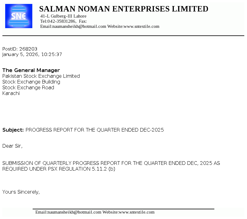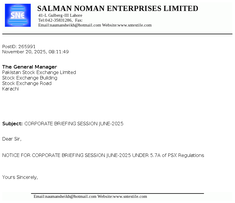 Salman Noman Enterprises Limited was incorporated in Pakistan on November 05,1985 as a Public Limited Company under the companies ordinance, 1984 (Now Companies Act, 2017). The principal business of the company is to manufacturing and sale of yarn. The Company had ceased its operations since February 2018.