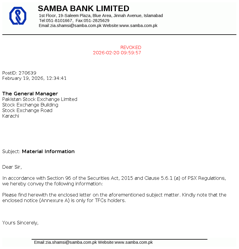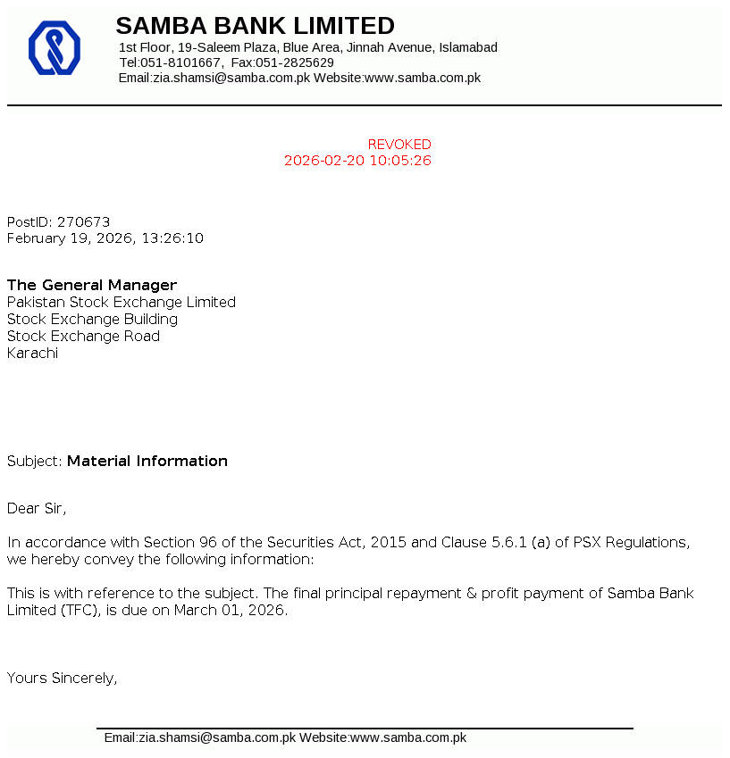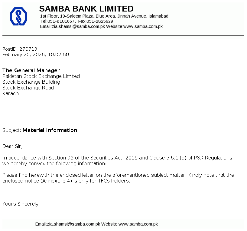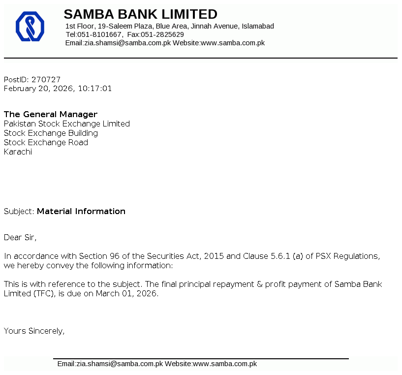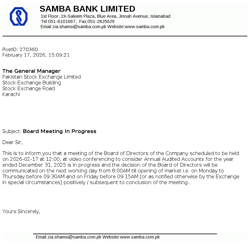 Samba Bank Limited is a banking company incorporated in Pakistan and is engaged in commercial banking and related services. The Bank is a subsidiary of the Saudi National Bank of the Kingdom of Saudi Arabia. The Samba Financial Group was merged into National Commercial Bank, KSA, and the new entity was renamed as Saudi National Bank (“SNB”).