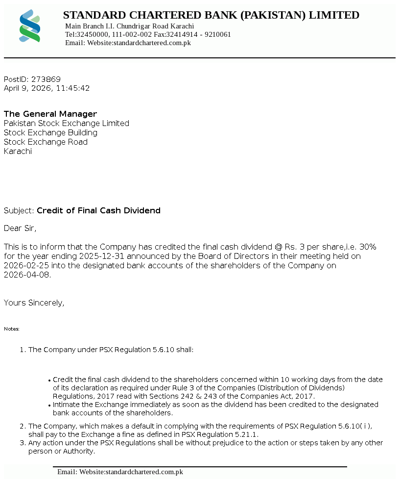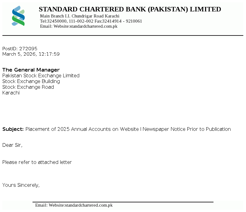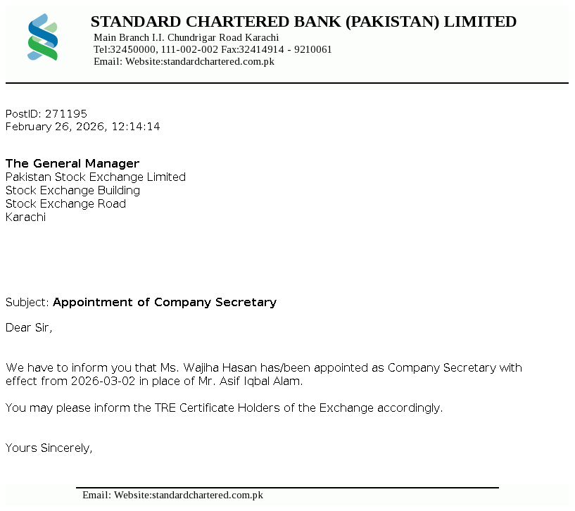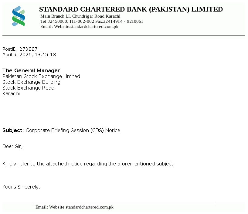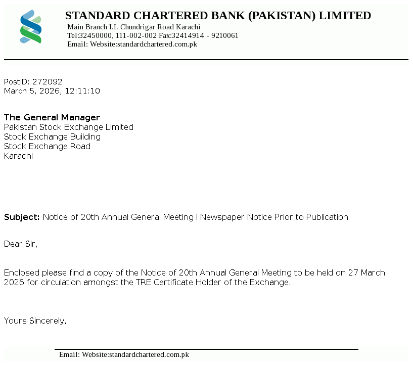Standard Chartered Bank (Pakistan) Limited, P.O. Box No. 5556, I.I. Chundrigar Road, Karachi 74000