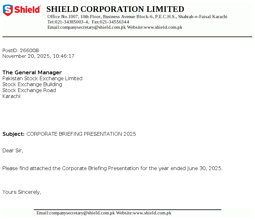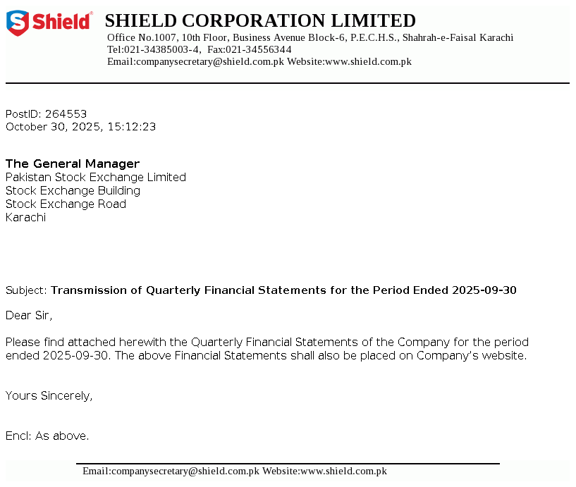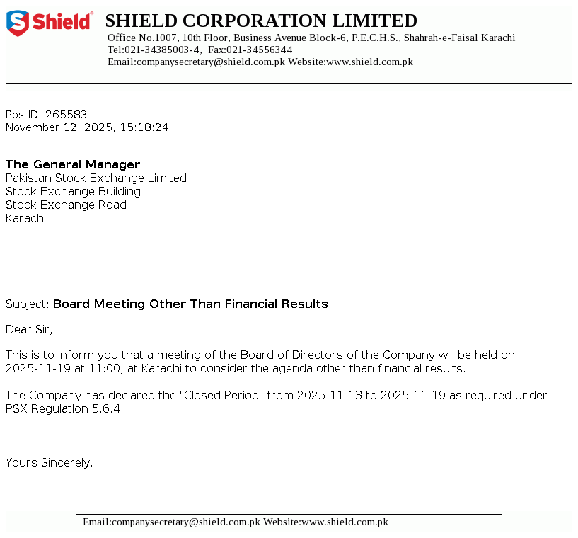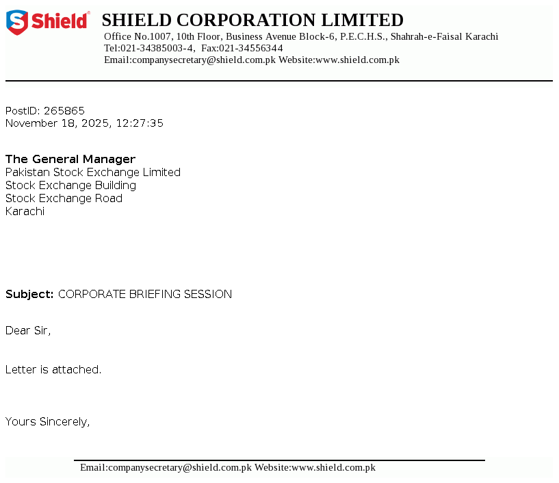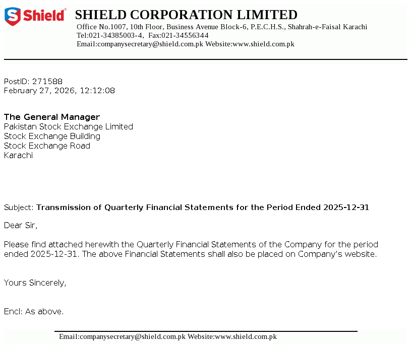 Shield Corporation Limited was incorporated on 10 January 1975 as a public limited company in Pakistan under the Companies Act, 1913 (now Companies Act, 2017). The Company started its commercial production on 26 November 1975 and is mainly engaged in the manufacturing, trading and sales of oral care and baby care products.