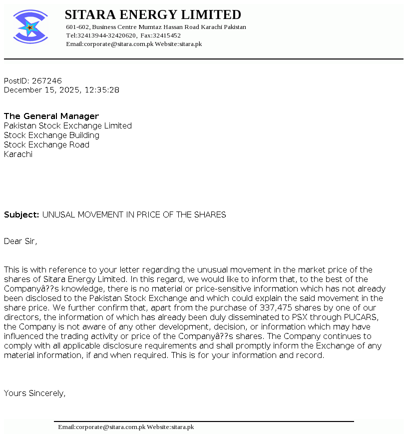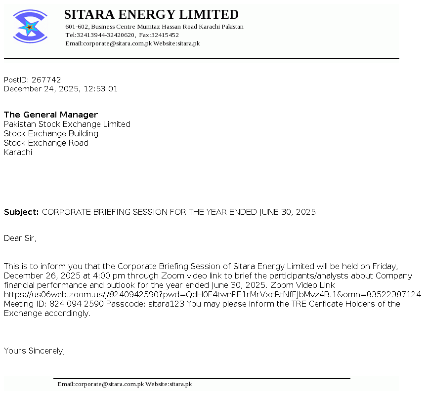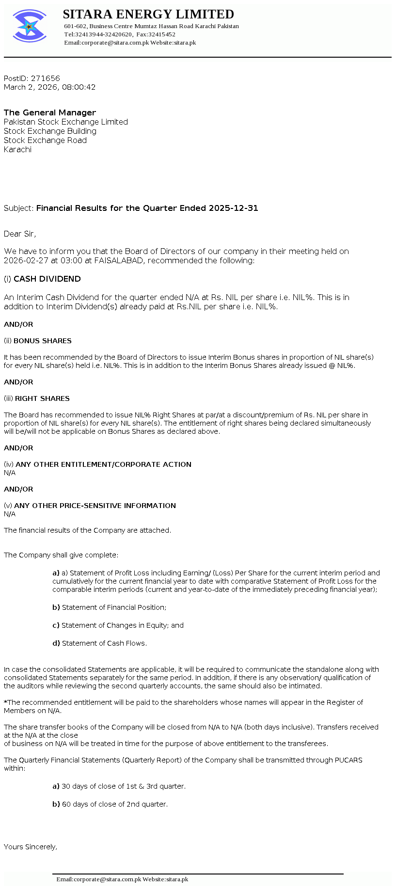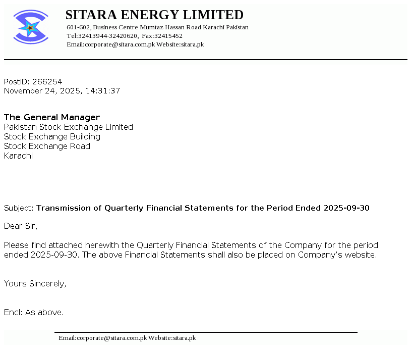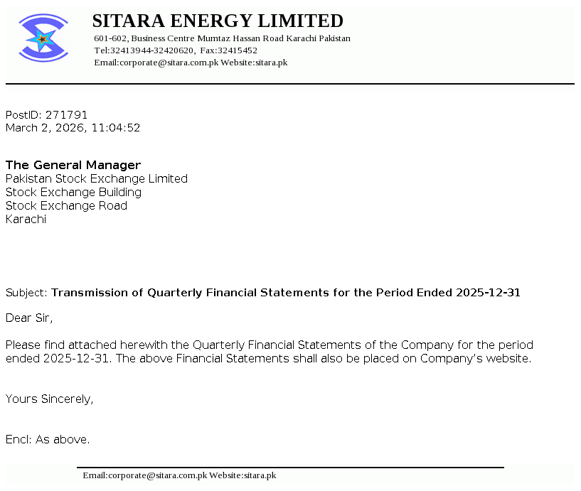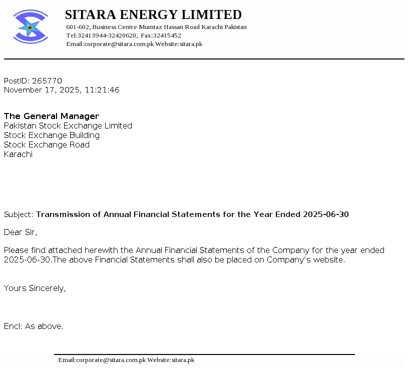 Sitara Energy Limited is incorporated in Pakistan as a public limited Company under the Companies Ordinance, 1984 (Repealed with the enactment of the Companies Act 2017).The main object of the Company is generation and distribution of electricity.