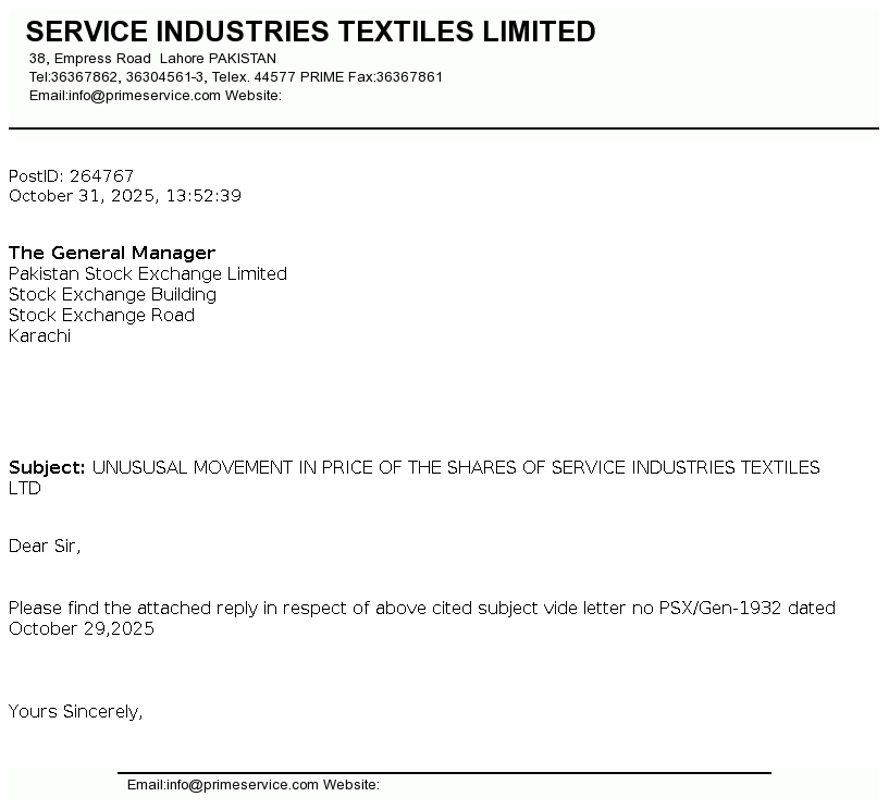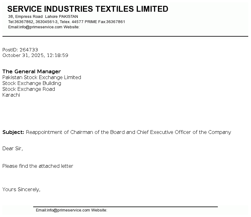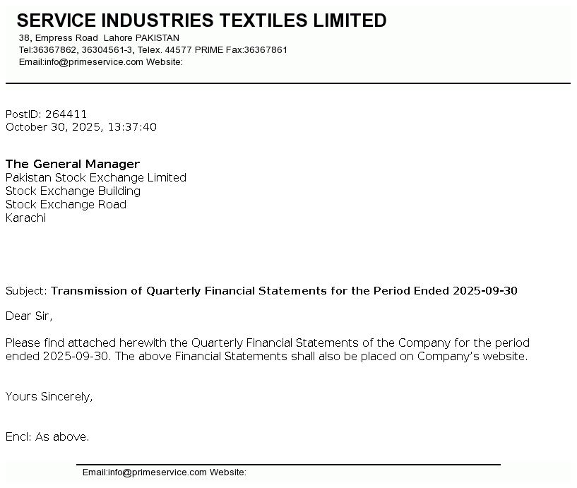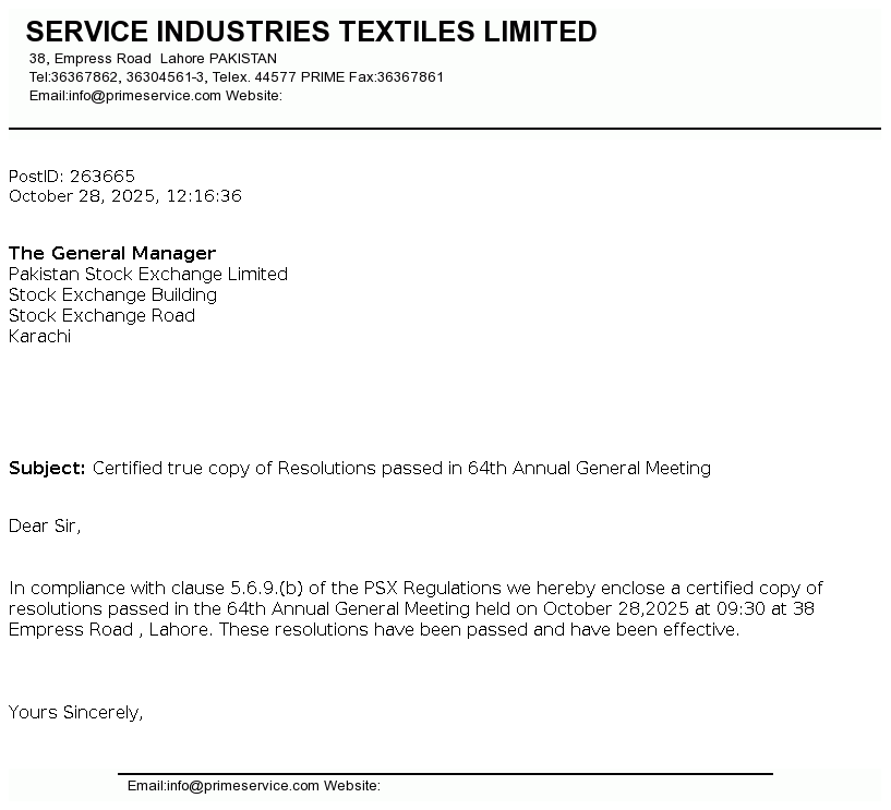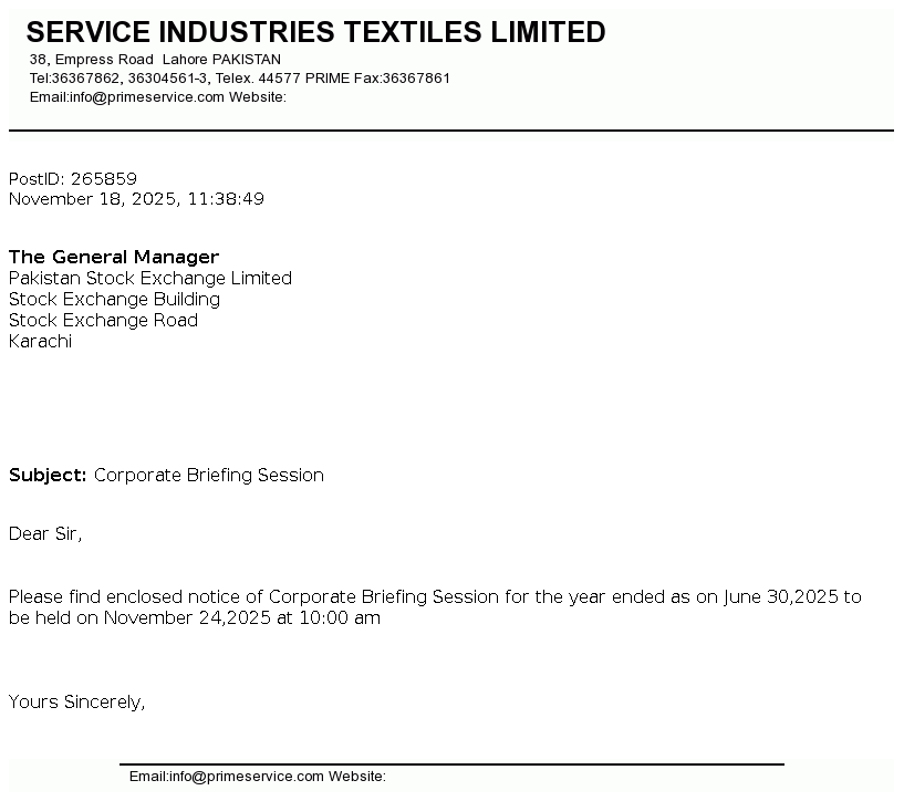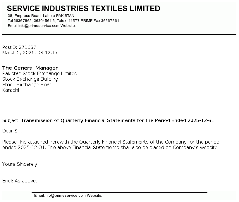 Service Industries Textiles Limited was incorporated in Pakistan in 1962 as a Private Limited Company under the Companies Act 1913, (now the Companies Act, 2017) and was subsequently converted into a Public Limited Company in 1970. The principal activity of the Company is manufacturing and sale of yarn made from raw cotton and synthetic fiber.