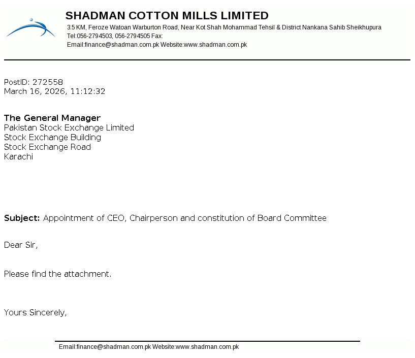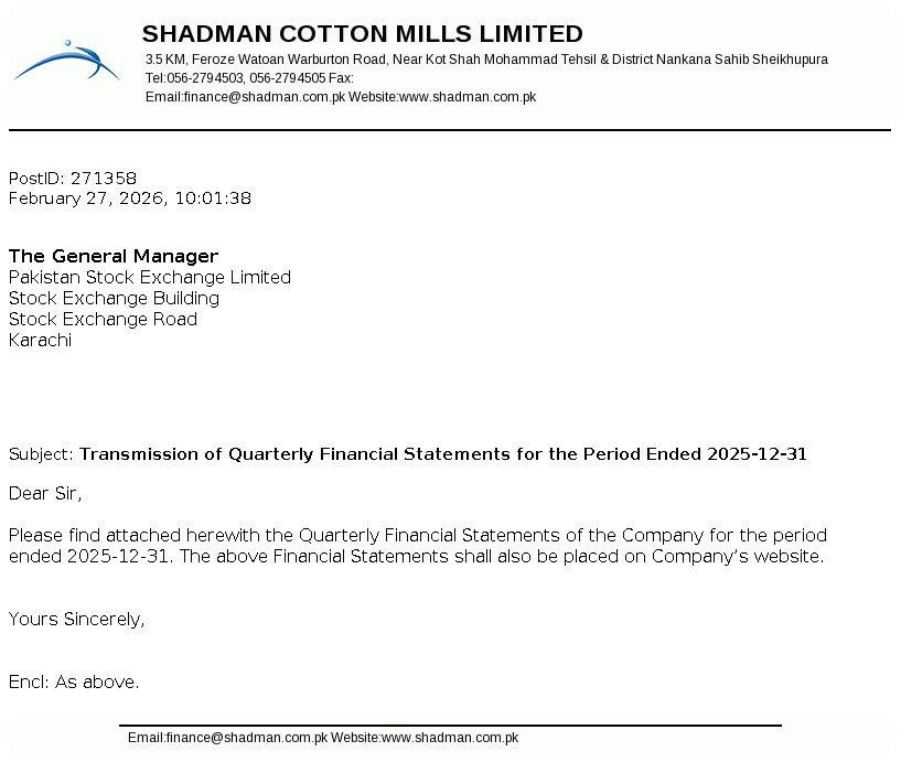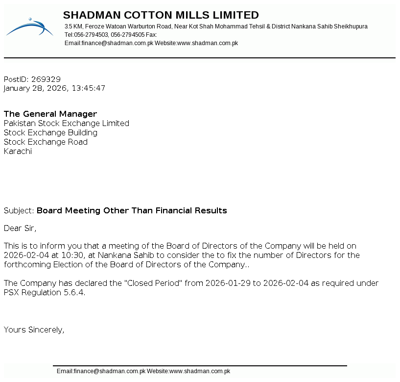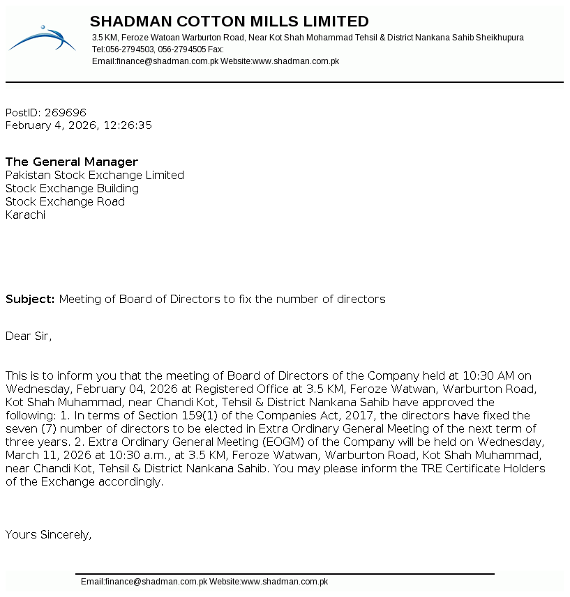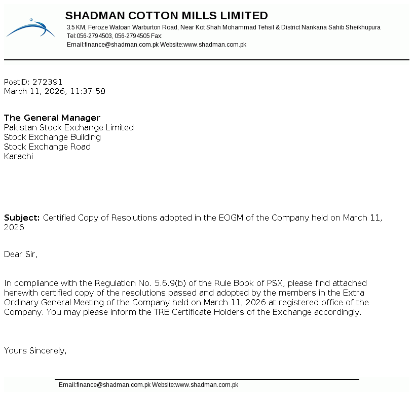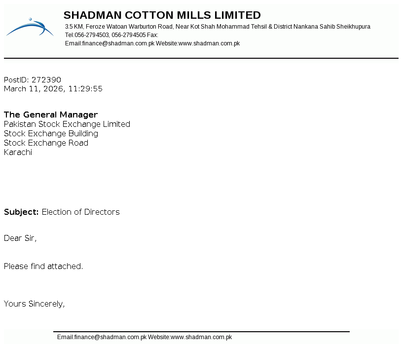 Shadman Cotton Mills Limited was incorporated in Pakistan as a public limited company on November 24, 1979 under the then Companies Act, 1973 (now the Companies Act 2017). The Company is engaged in manufacturing and sale of yarn.