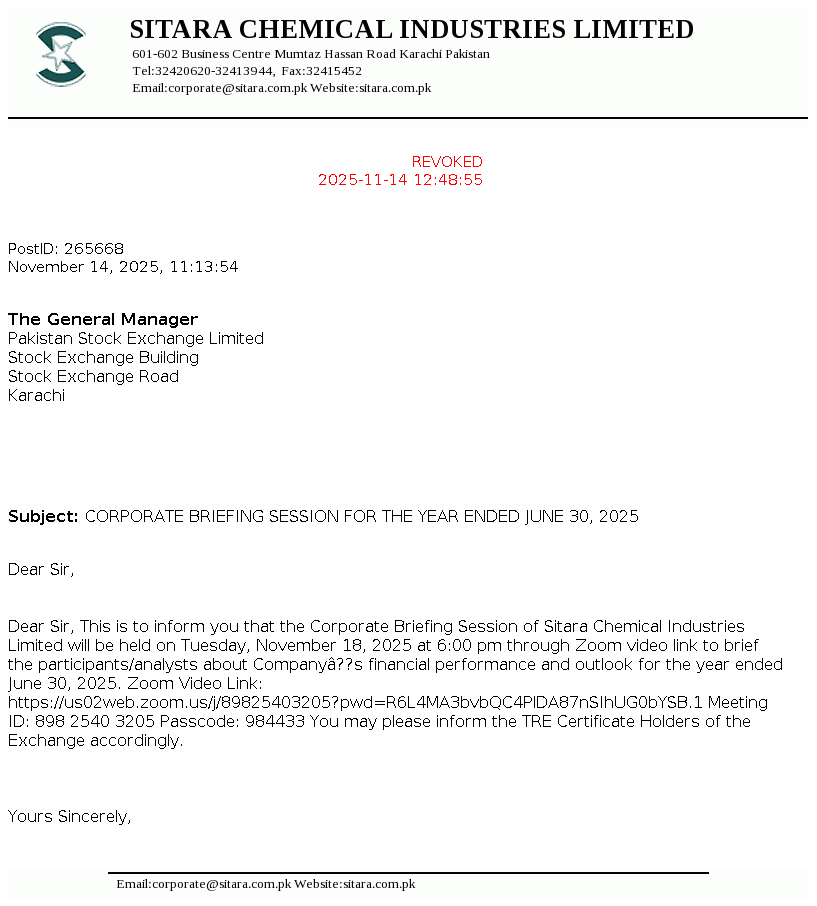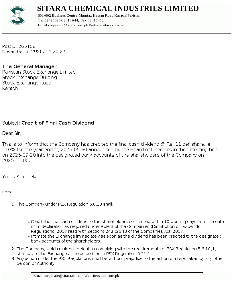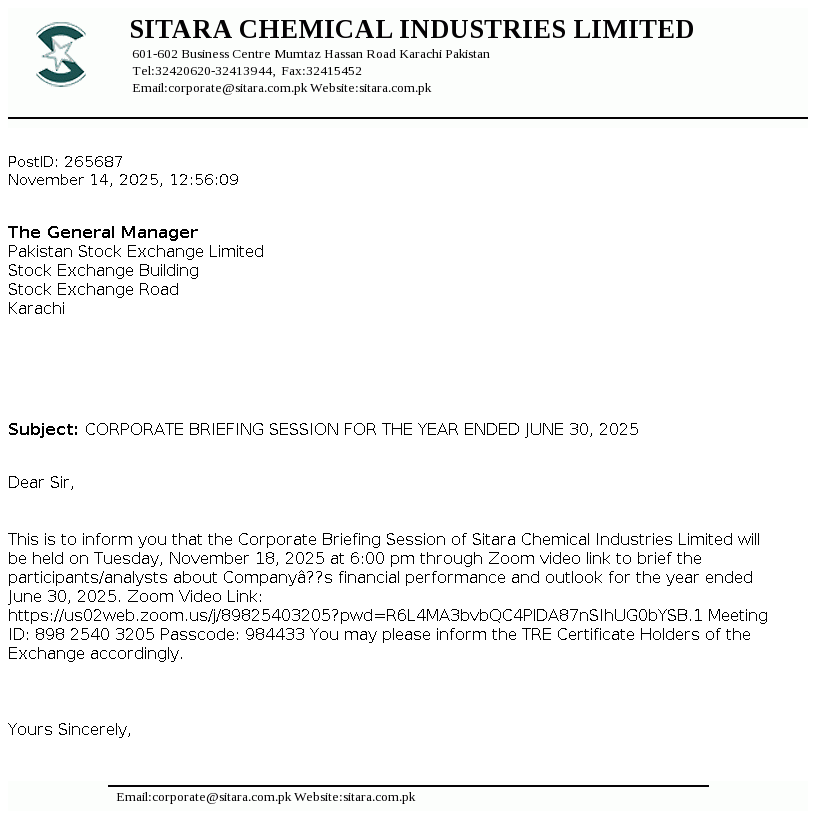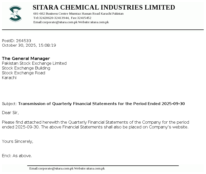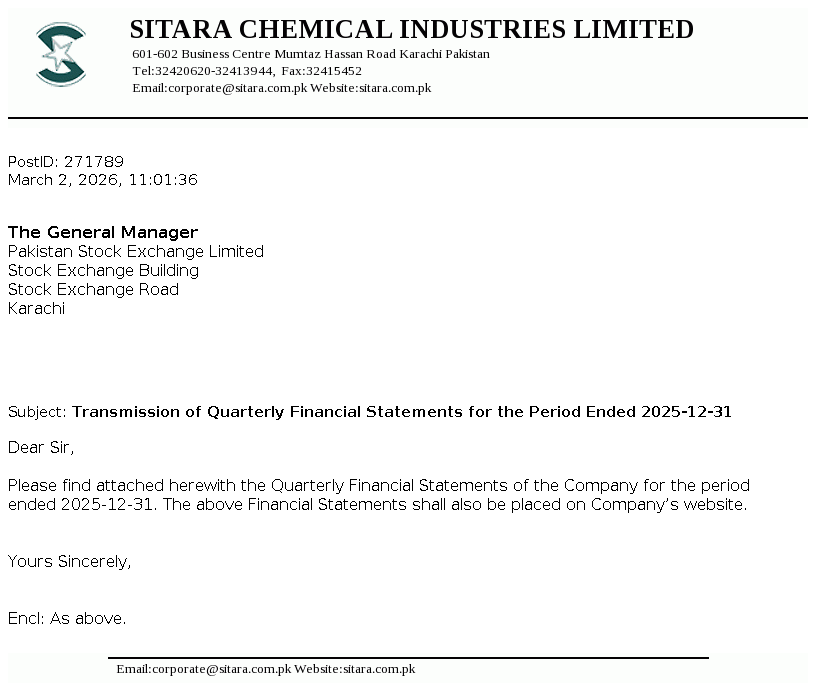 Sitara Chemical Industries Limited was incorporated in Pakistan on September 08, 1981 as a public limited company under the Companies Act, 1913 (now the Companies Act, 2017). The company is a Shariah Compliant Company certified by Securities & Exchange Commission of Pakistan (SECP) under Shariah Governance Regulation 2018. The principal activities of the Company are operating Chlor Alkali plant, Oleo chehmical plant and yarn spinning unit.