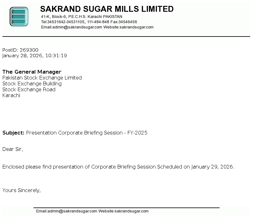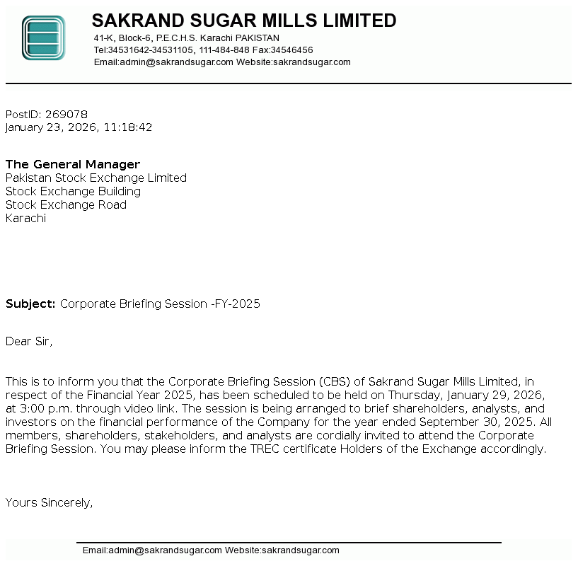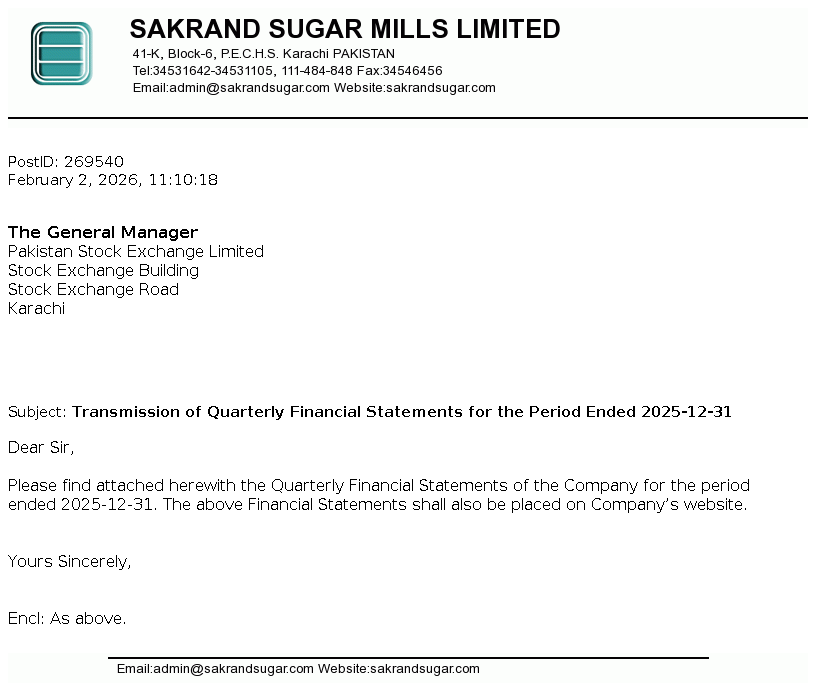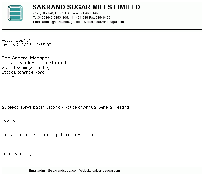 Sakrand Sugar Mills Limited was incorporated in Pakistan as a Public Limited Company under the repealed companies Ordinance, 1984 [Repealed with the enactment of Companies Act, 2017], on March 02,1989. The principal business of the company is to manufacture and sell white sugar.