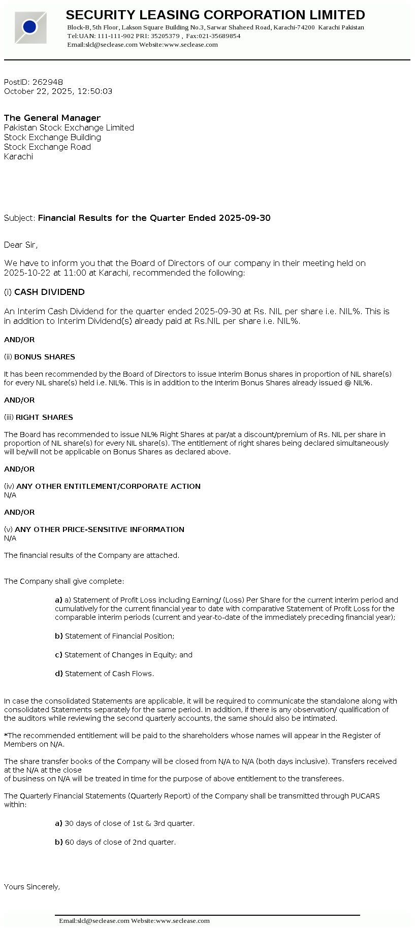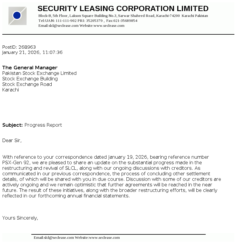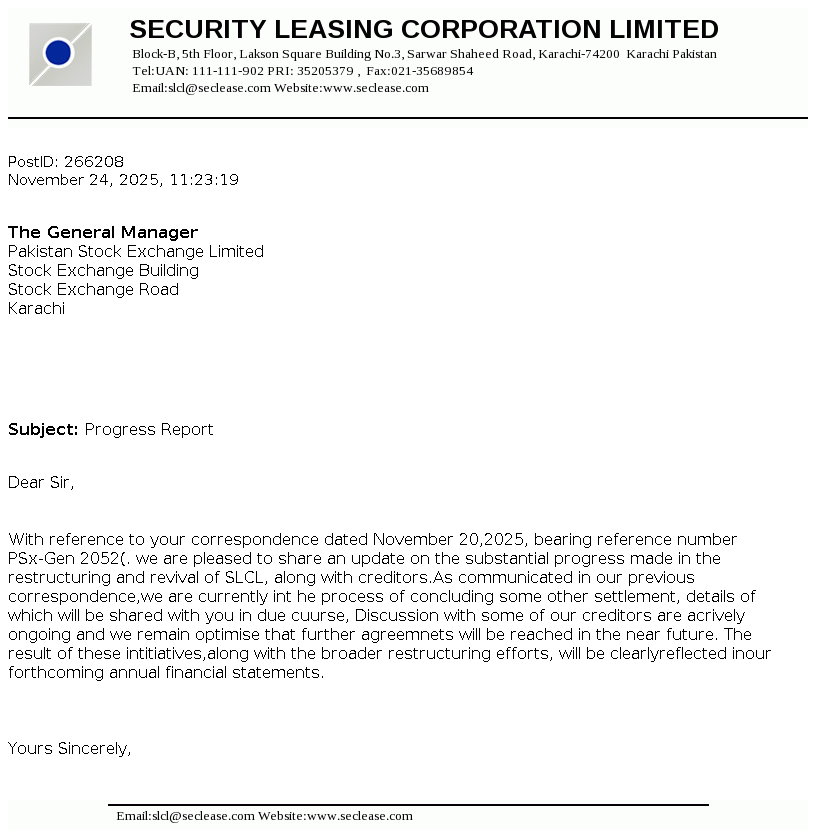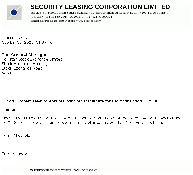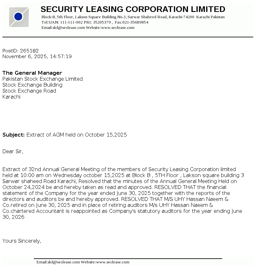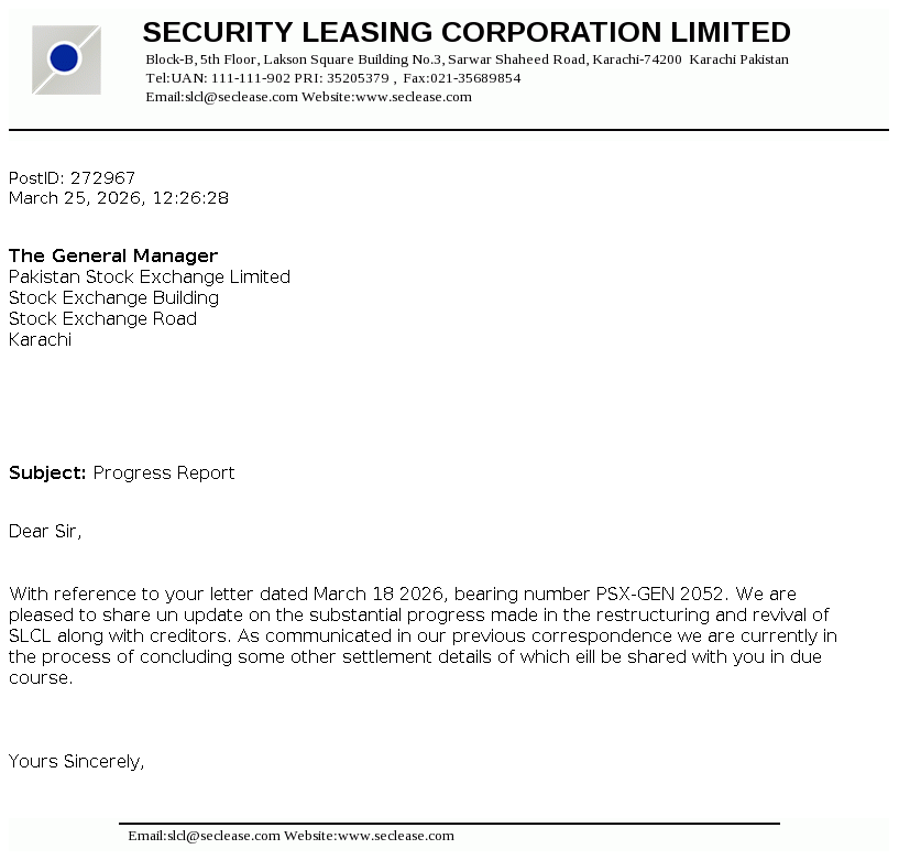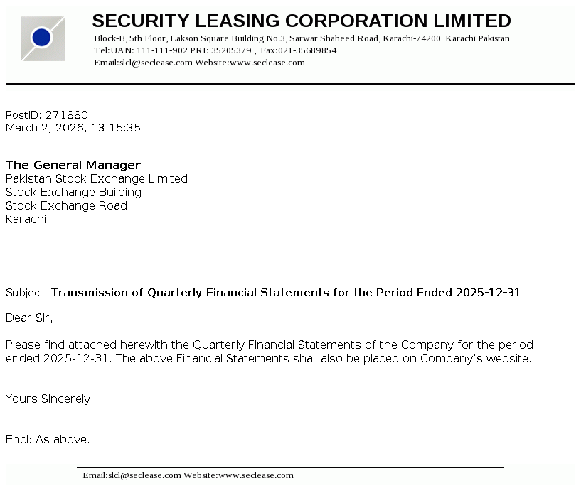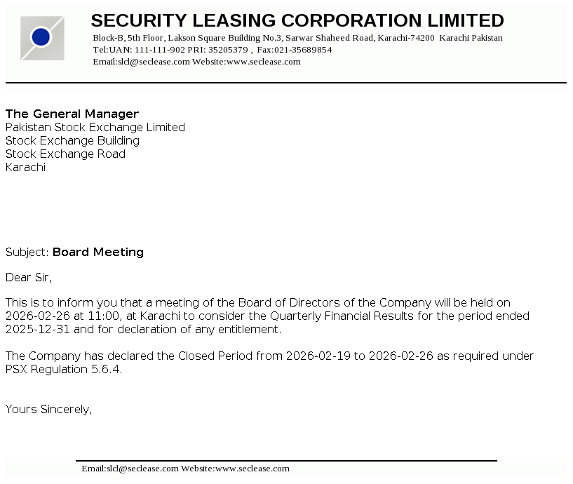 Security Leasing Corporation Limited was incorporated in Pakistan on December 06, 1993 under repealed Companies Ordinance 1984, and commenced its operations on May 21, 1995. The company is Non - Banking Finance Company (NBFC) under Non Banking Finance Companies (Establishment and Regulations) Rules, 2003 and is engaged in the business of leasing .