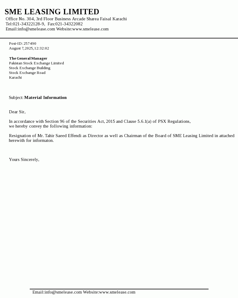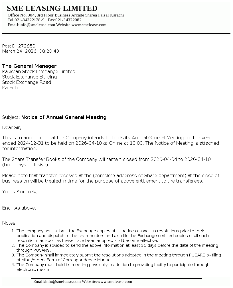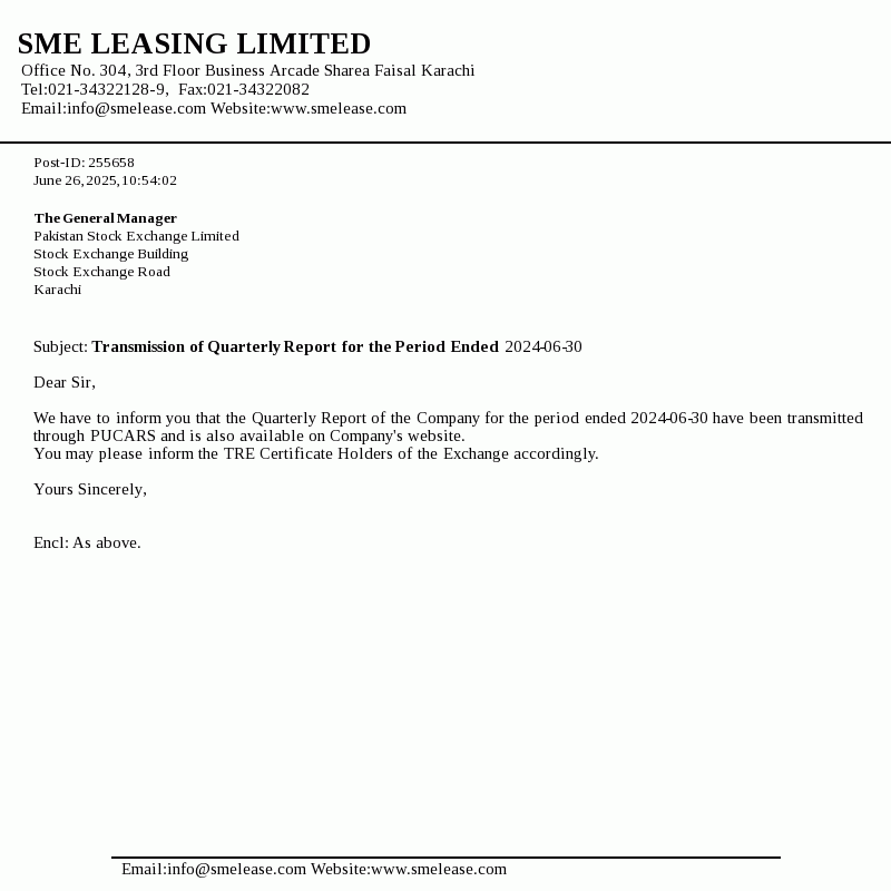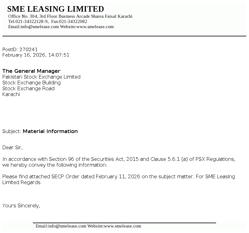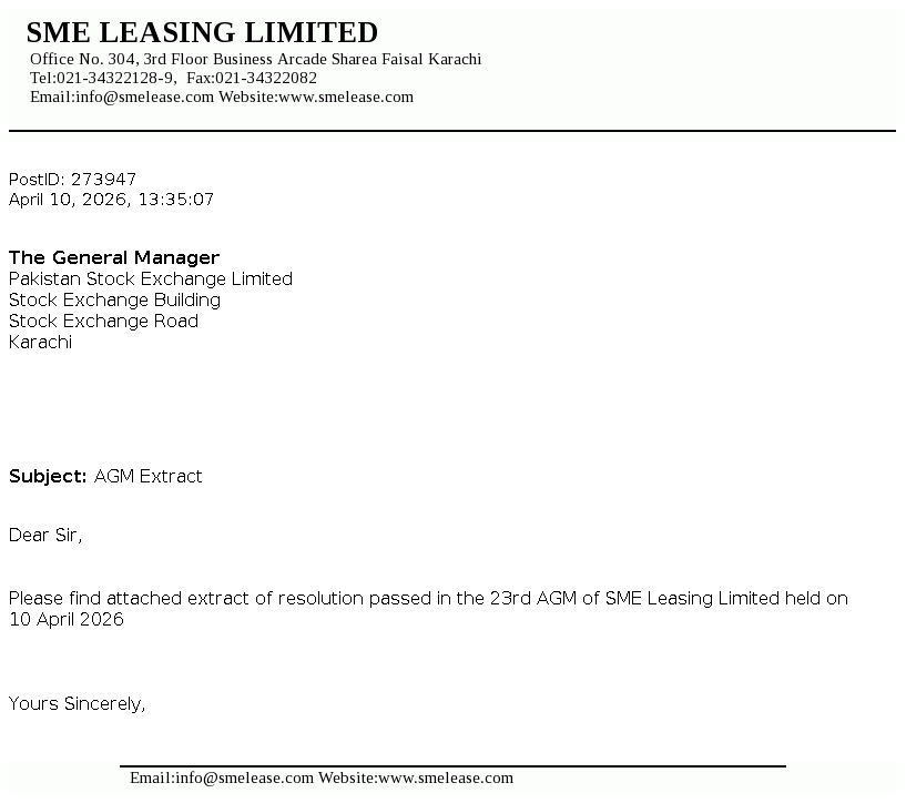 SME Leasing Limited was incorporated in Pakistan on July 12, 2002 as an unlisted public company. The company is a subsidiary of SME Bank Limited. The core objective of the company is to extend lease and working capital financing facilities to small and medium enterprises of the country.