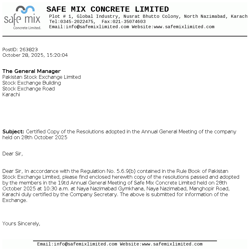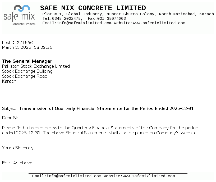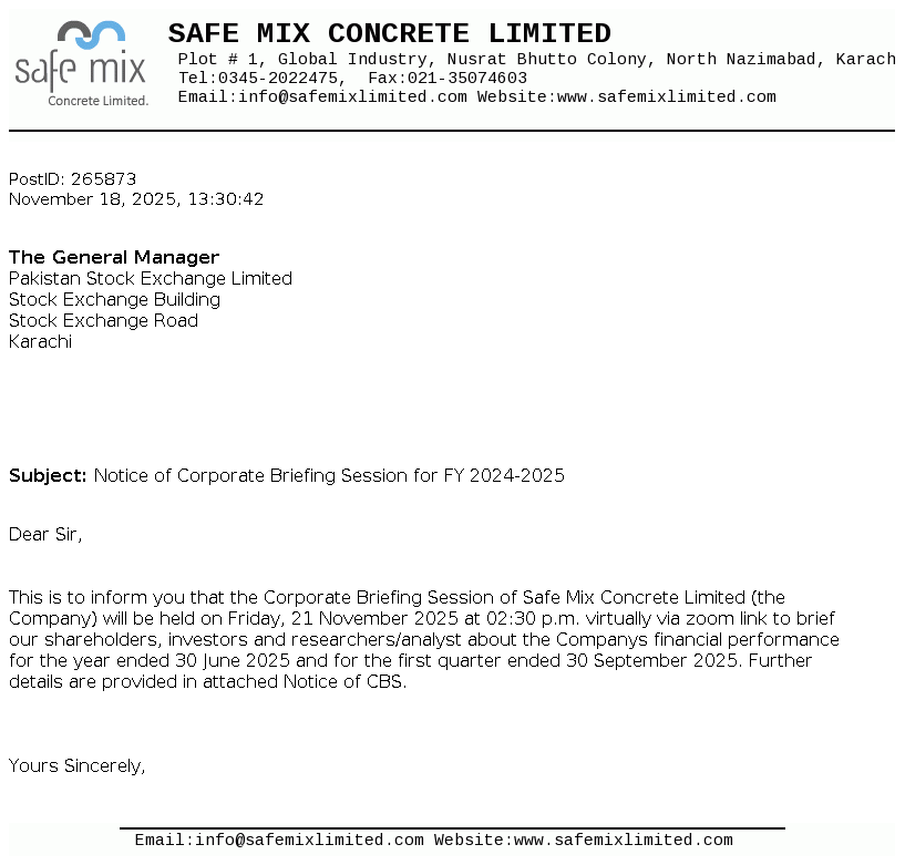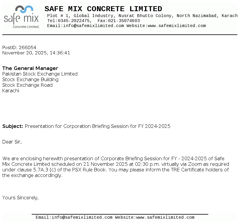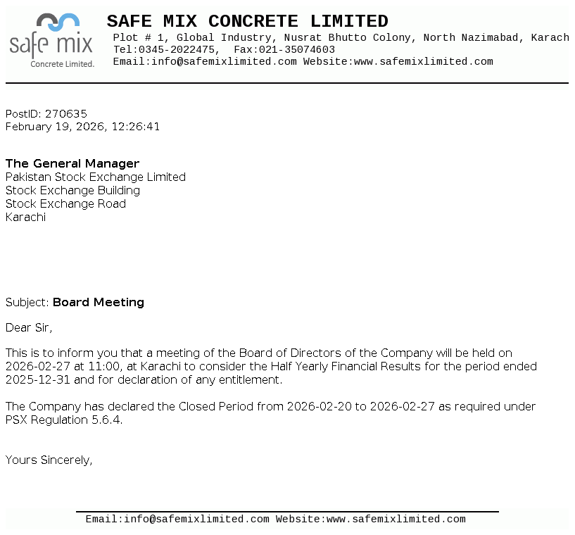 Safe Mix Concrete Limited was incorporated on 04 April 2005 as Private Limited Company. Subsequently, it has been converted into Public Limited Company on 21 February 2007. It is involved in the production and supply of ready mix concrete, building blocks and construction of prefabricated buildings, factories and other construction sites.