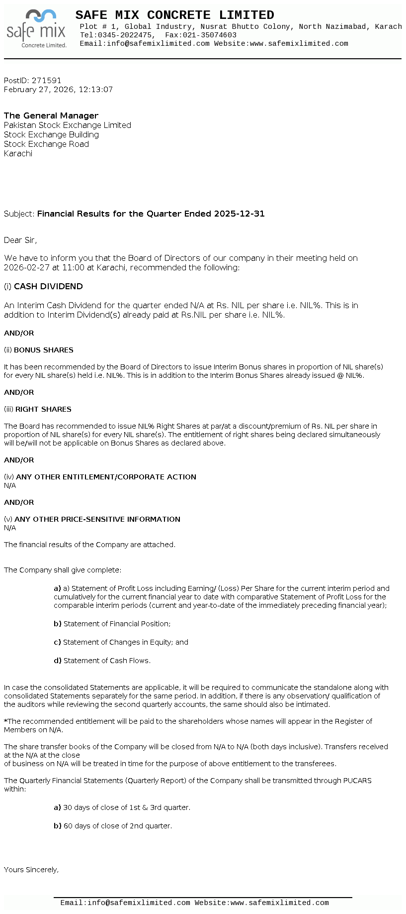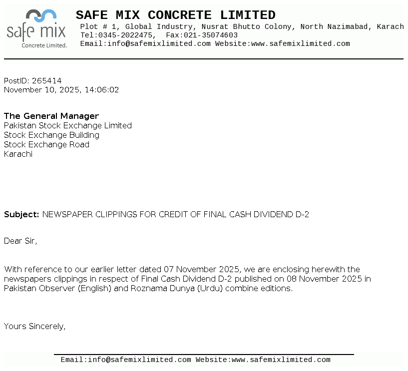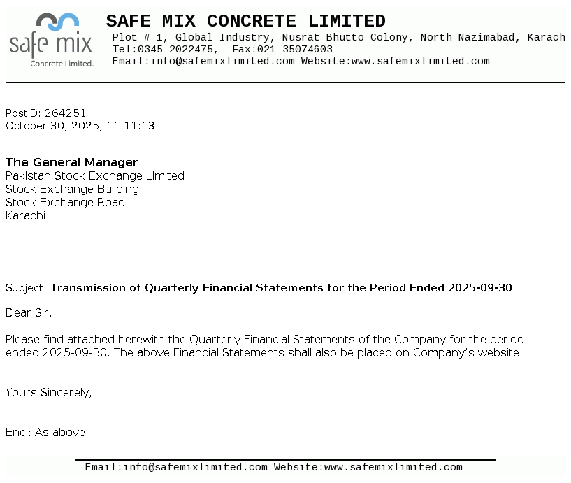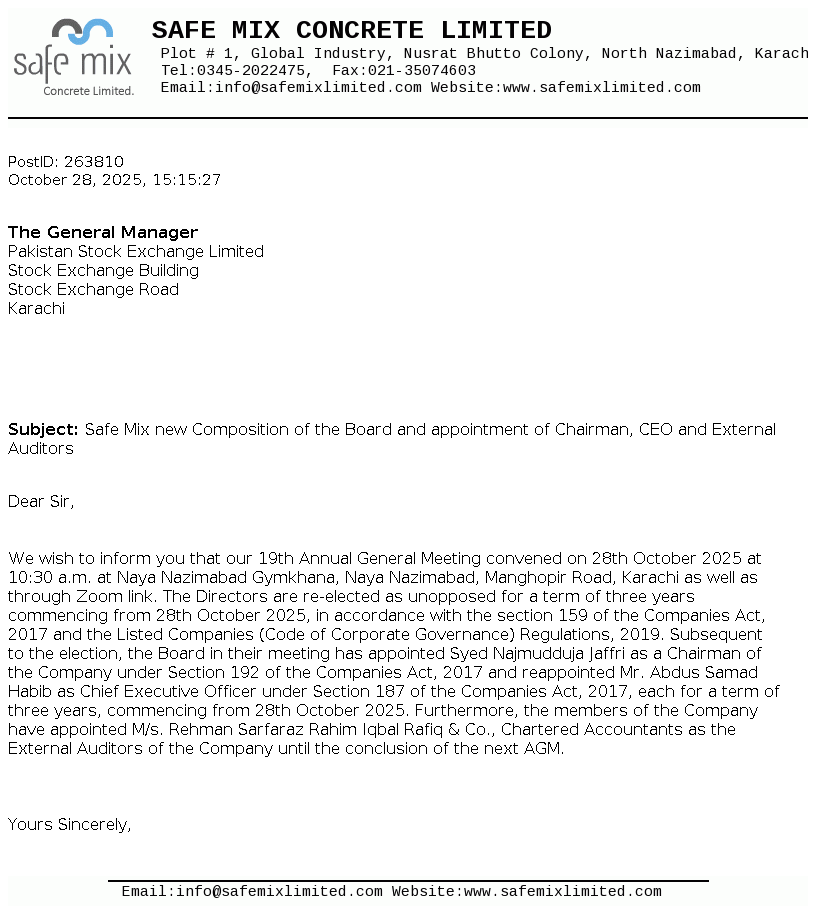 Safe Mix Concrete Limited was incorporated on 04 April 2005 as Private Limited Company. Subsequently, it has been converted into Public Limited Company on 21 February 2007. It is involved in the production and supply of ready mix concrete, building blocks and construction of prefabricated buildings, factories and other construction sites.