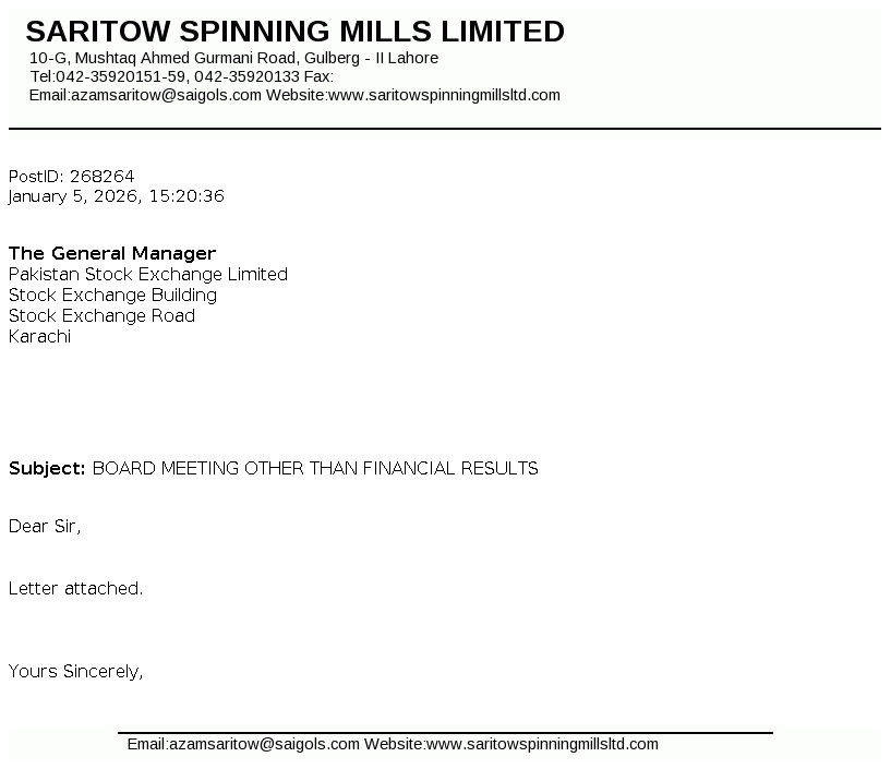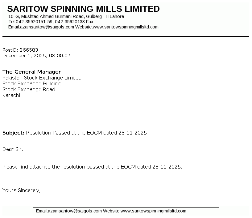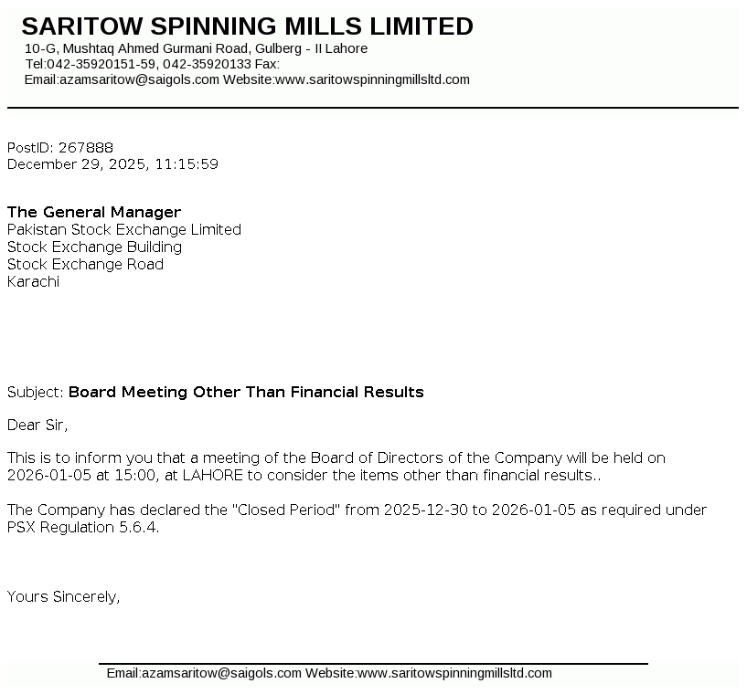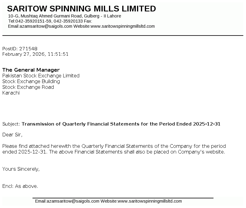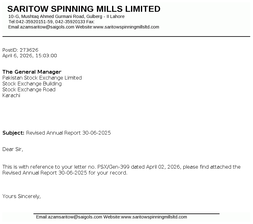 Saritow Spinning Mills Limited was incorporated in Pakistan on March 10, 1987 as Public Limited Company under the Companies Ordinance, 1984. The principal activity of the Company is manufacturing and sale of yarn.