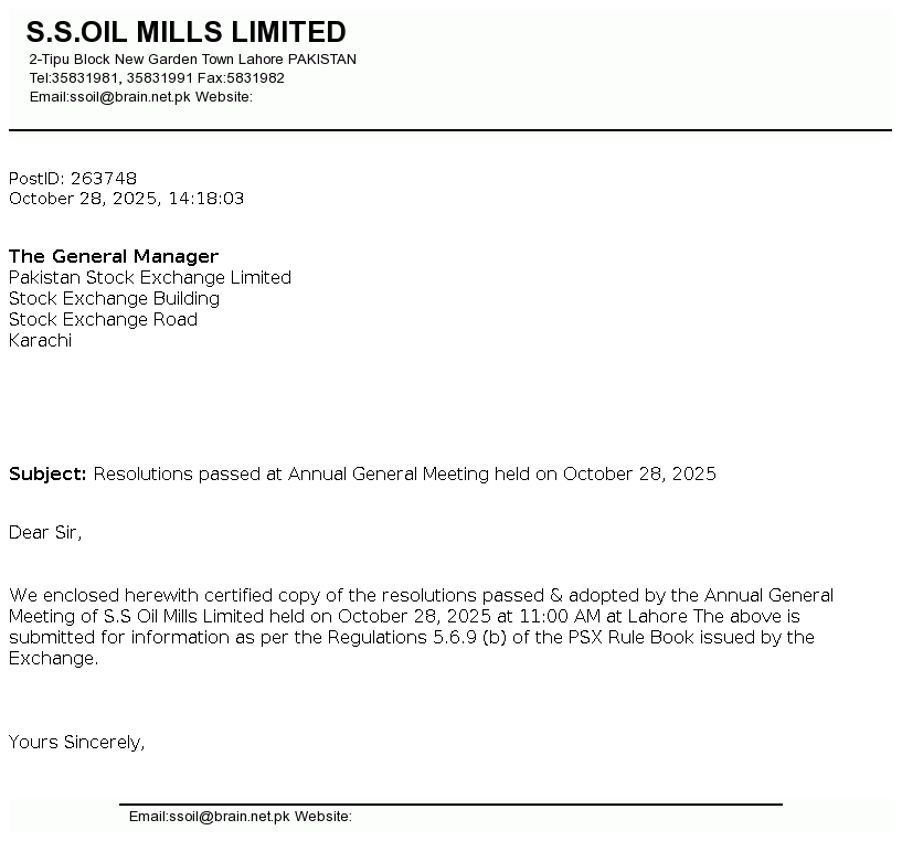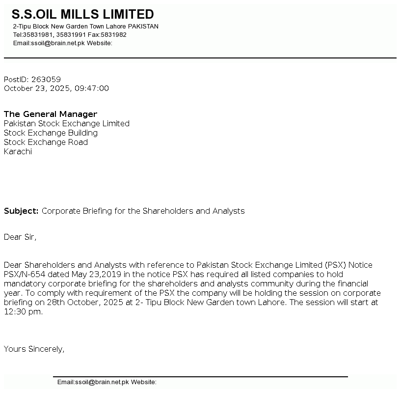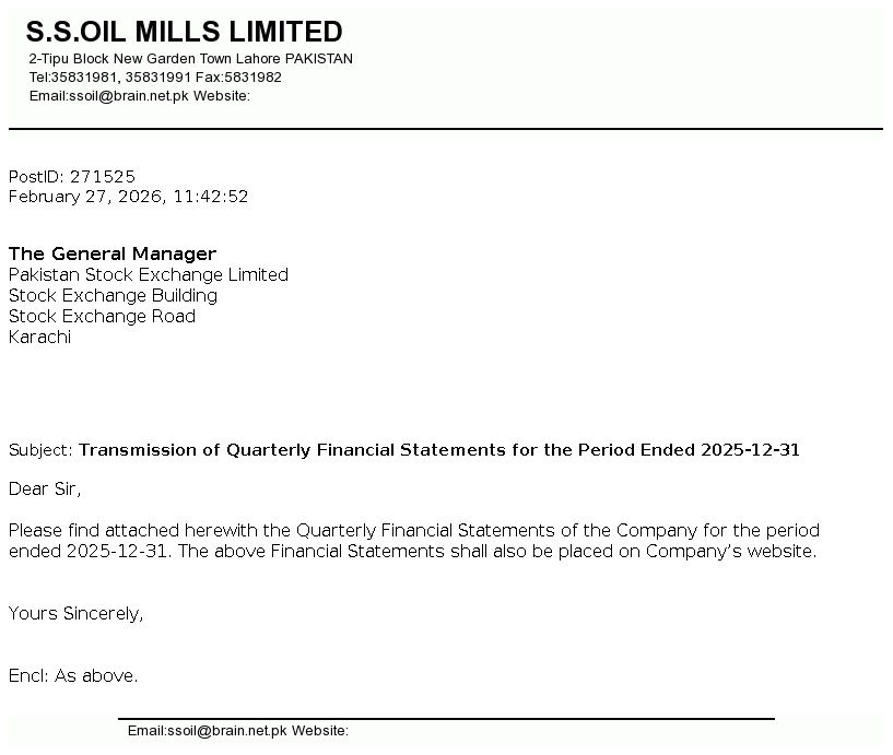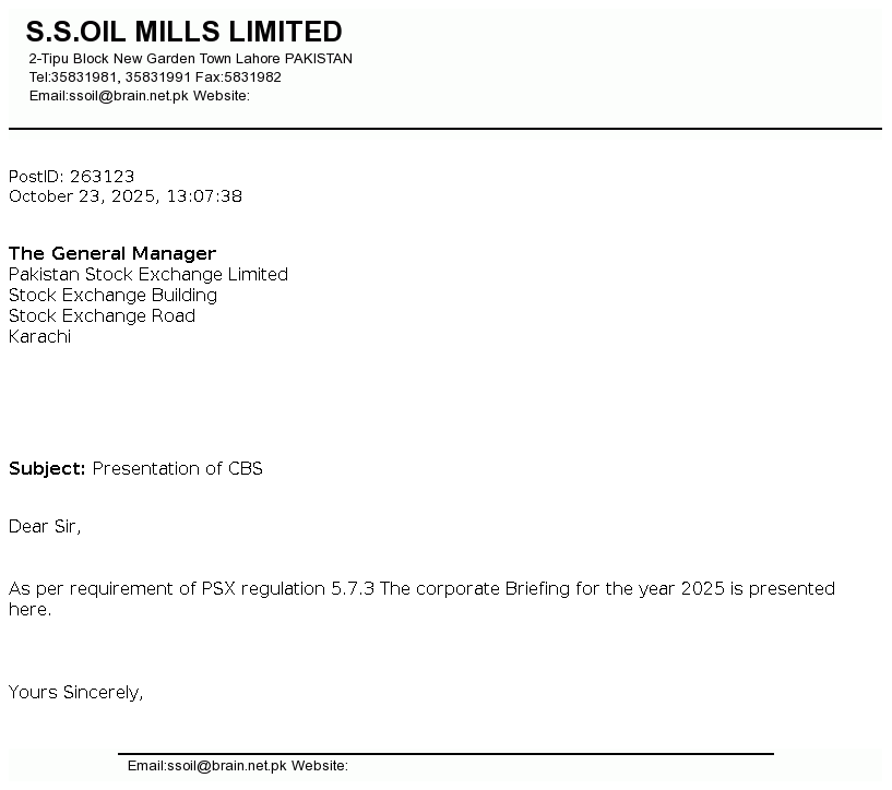 S.S. OIL MILLS LTD was incorporated in Pakistan in August 21, 1990 as a Public Limited Company under the repealed companies ordinance, 1984. The company is engaged in Solvent Extraction (Edible Oil, Meal).The principal object of the company is to carry on the business of extracting, refining, processing and sale of semi refined washed oil and meal on competitive prices.