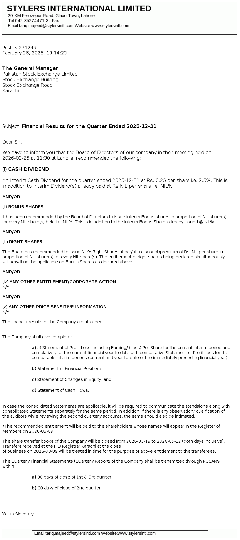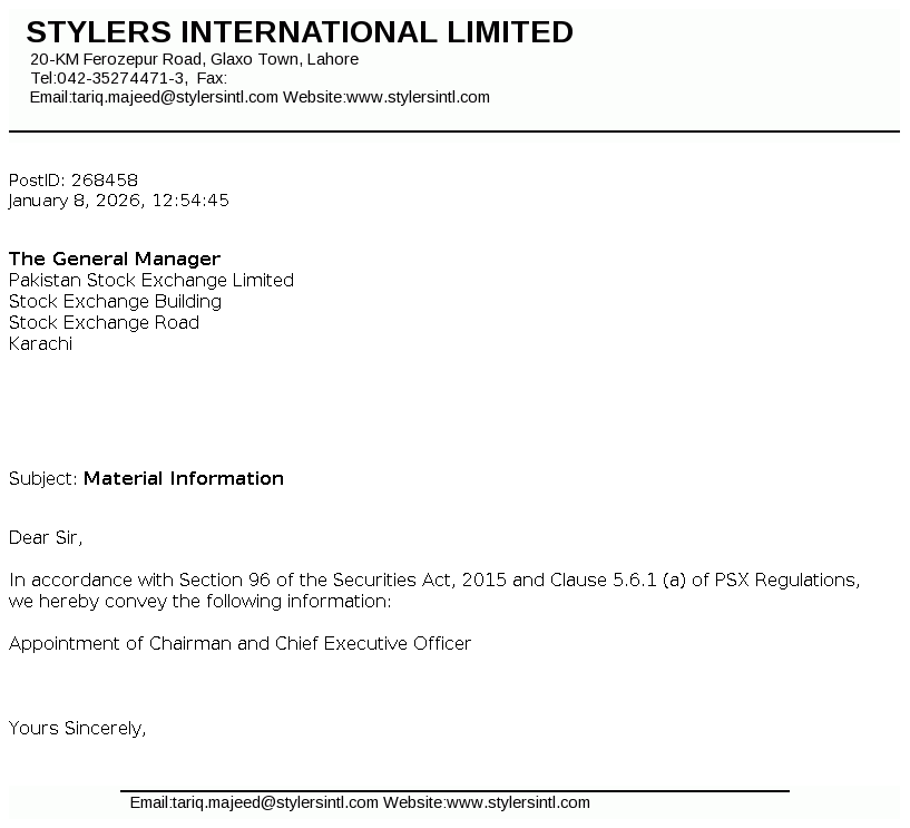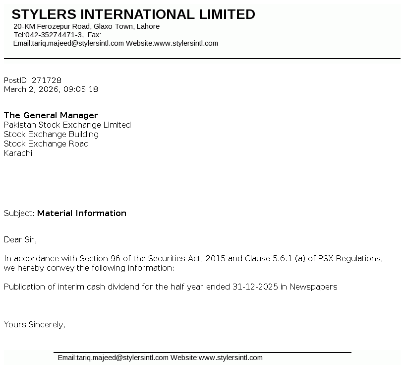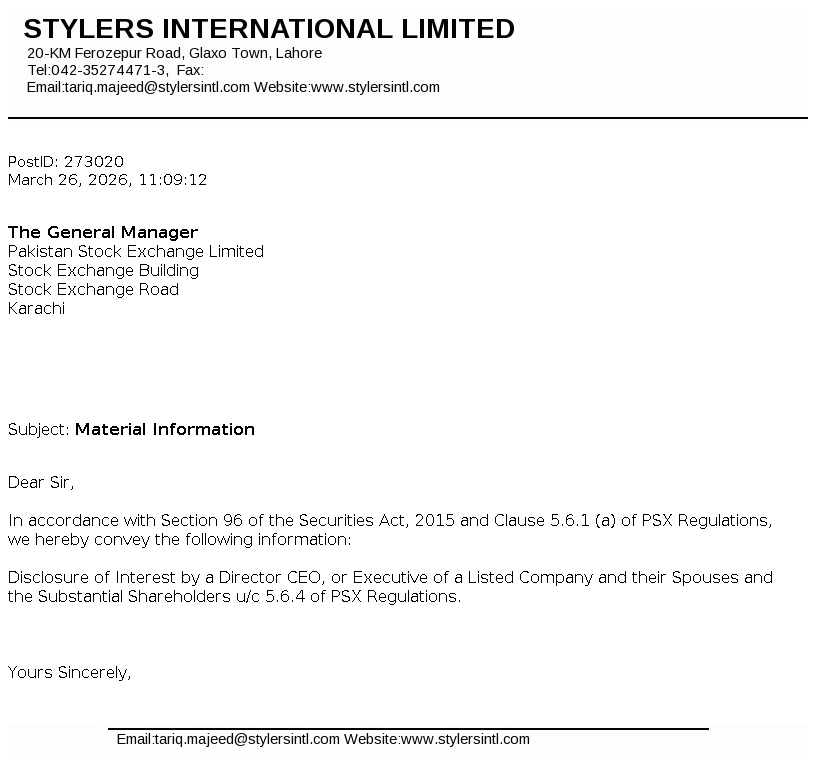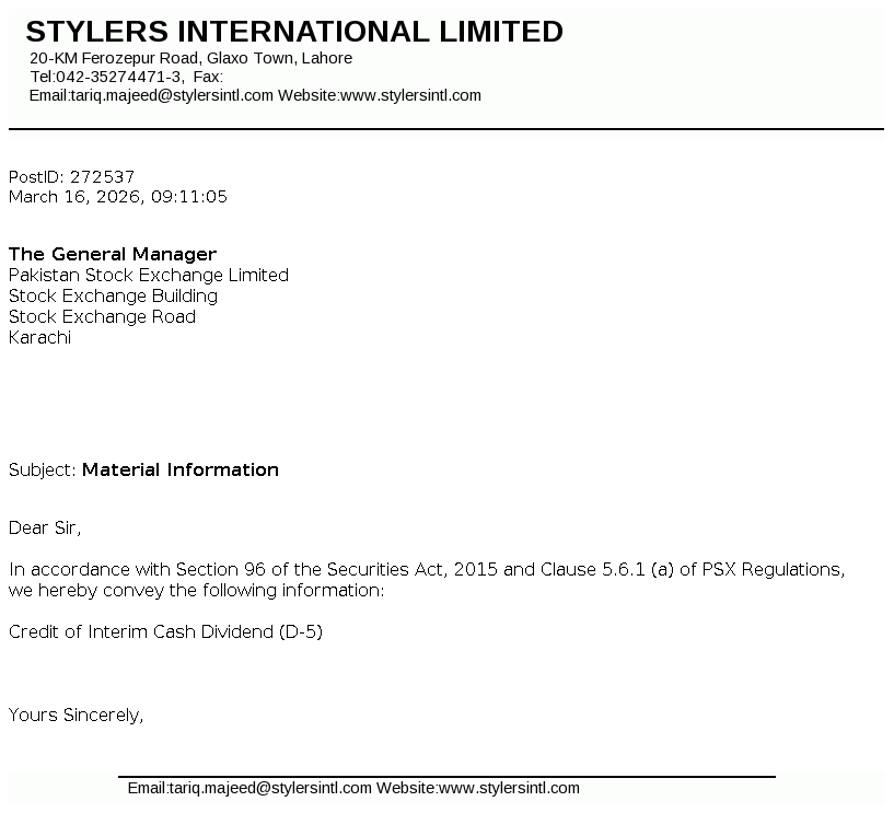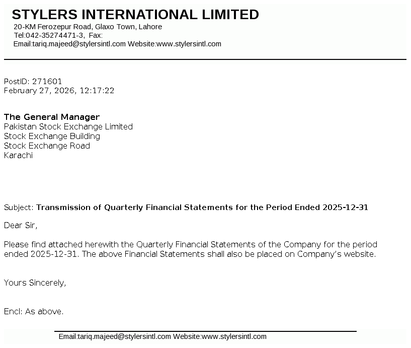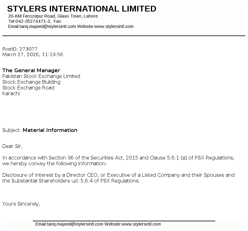 Stylers International Limited got listed on the exchange pursuant to the Scheme of Arrangement for merger/ amalgamation of AEL Textiles Limited (AEL). STYLERS was incorporated in Pakistan as a private limited company under the repealed Companies Ordiance, 1984 (now Companies Act, 2017) on 27 Nov, 1991 and was converted into public limited company from 21 May, 2021. The company is principally engaged in carrying out manufacturing, marketing and export of ready-made garments.