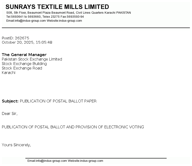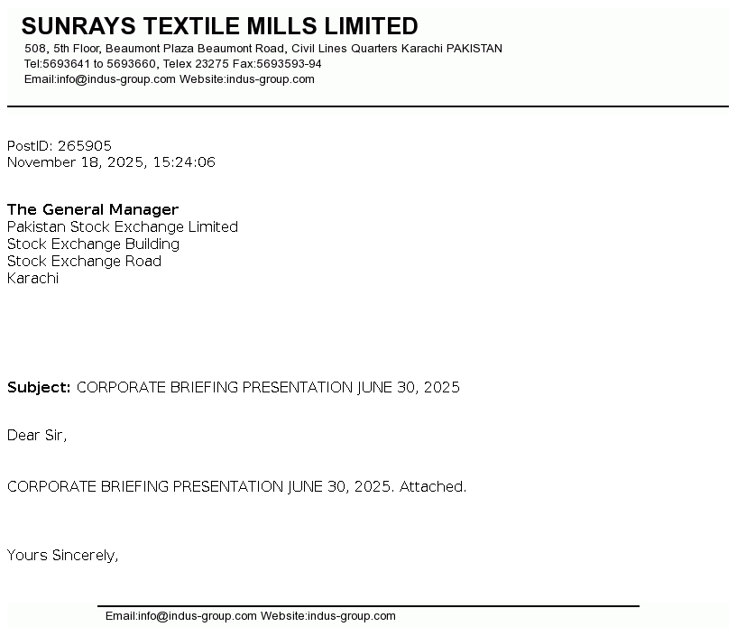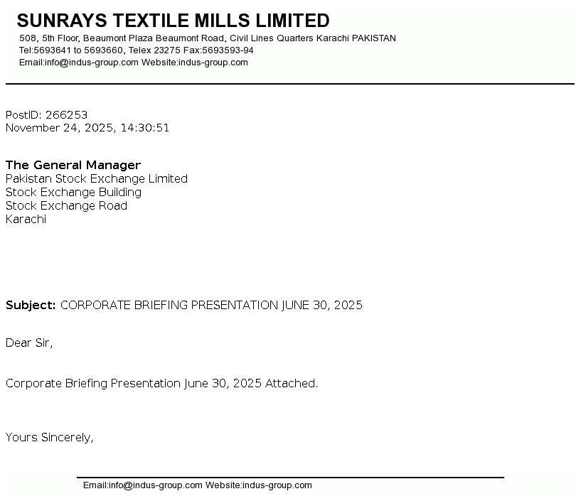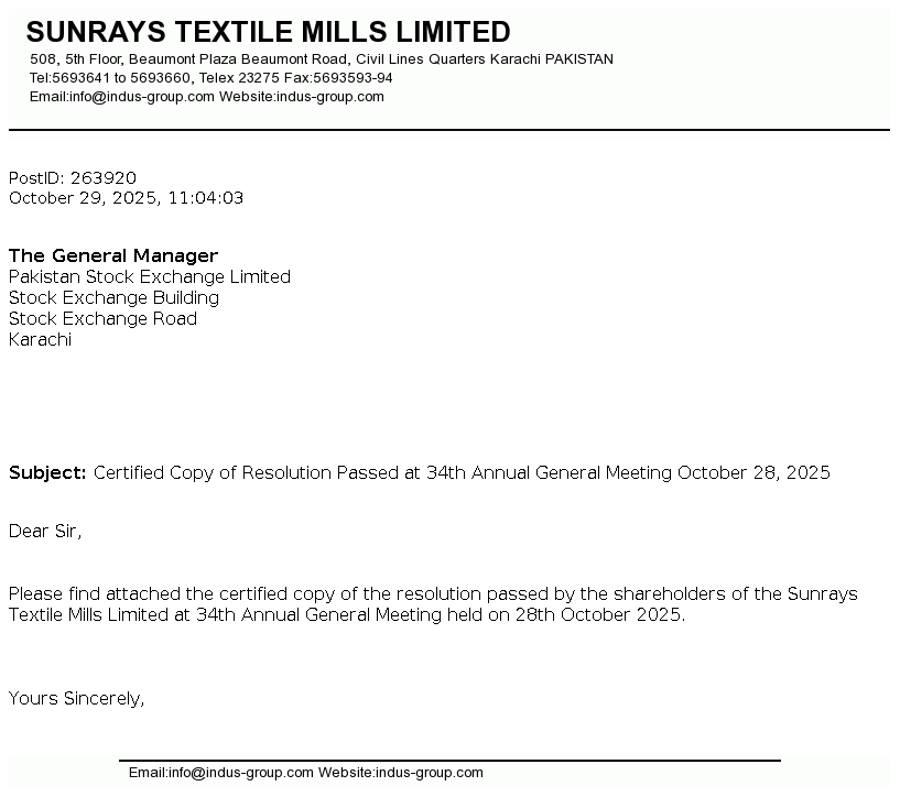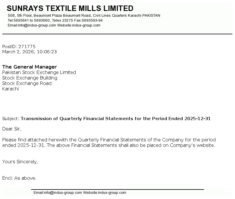 Sunrays Textile Mills Limited was incorporated in Pakistan on August 27, 1987 as a public limited company under the Companies Ordinance, 1984. The Company is principally engaged in trade, manufacture and sale of yarn.