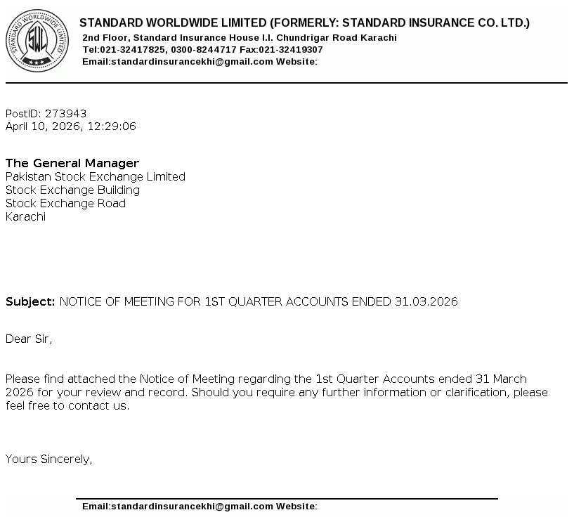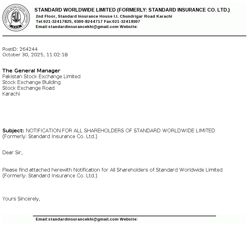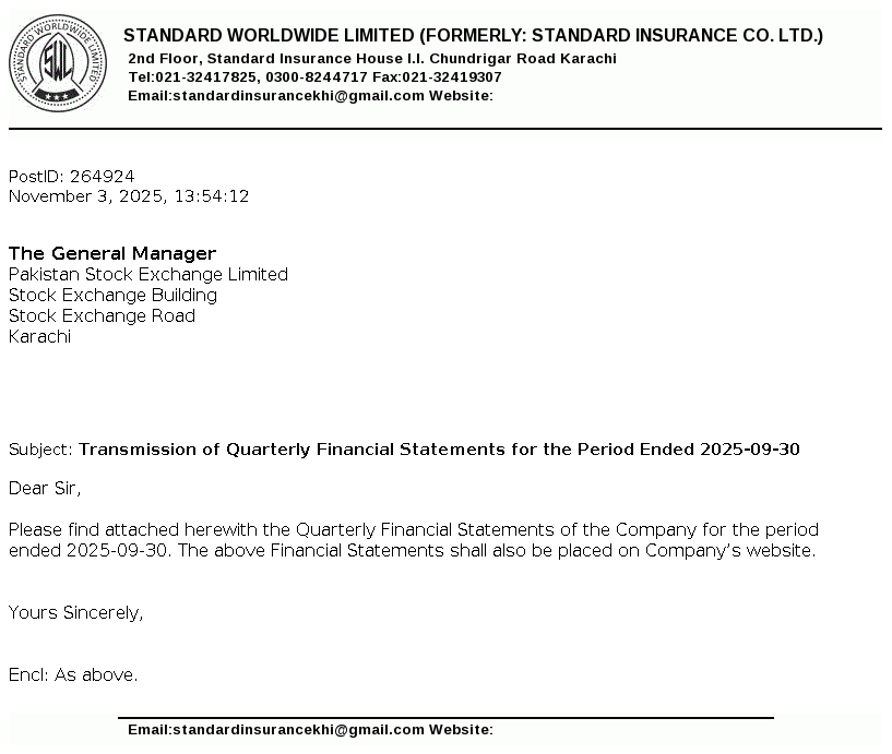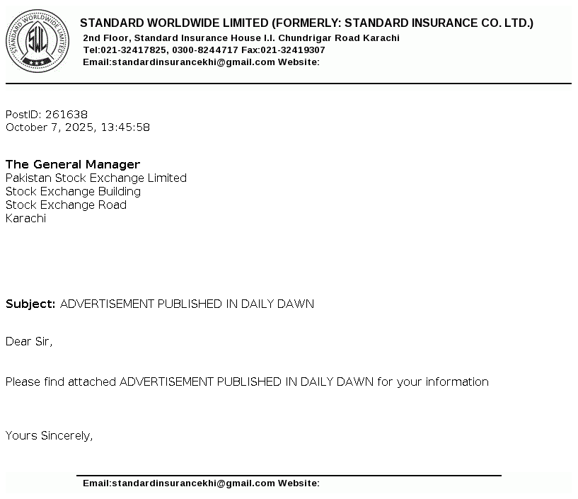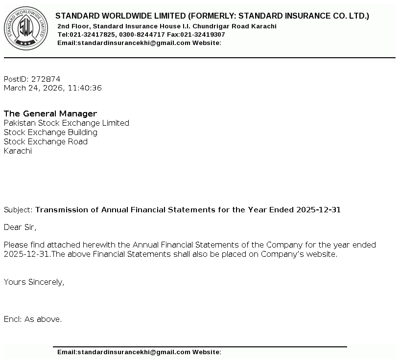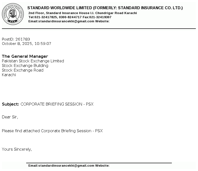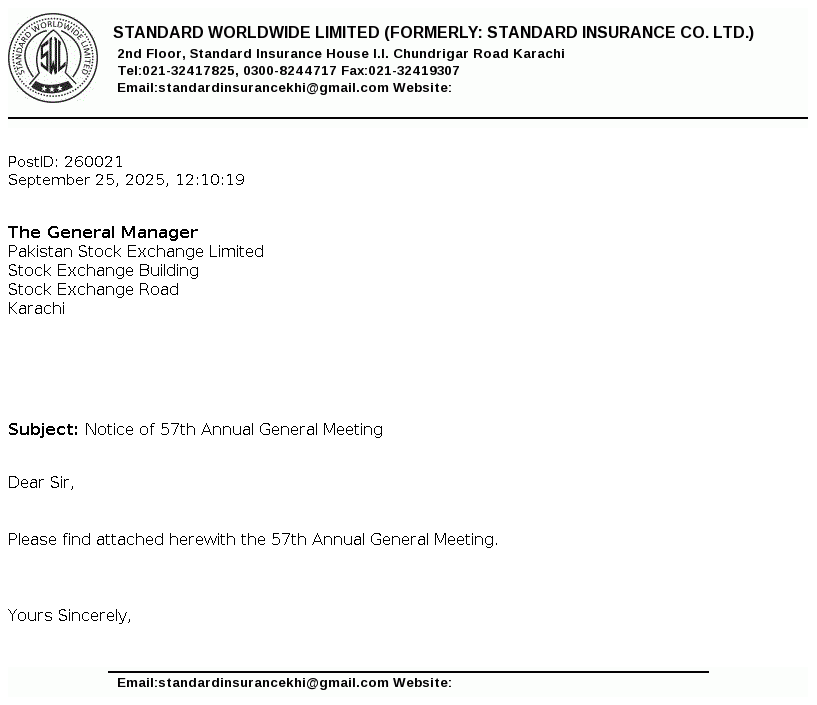 Standard Worldwide Limited, formerly Standard Insurance Company is a public limited company incorporated in Pakistan under the Companies Act, 1913 (now the Companies Act, 2017). The principal line of business of the Company is to undertake all types of real estate business.