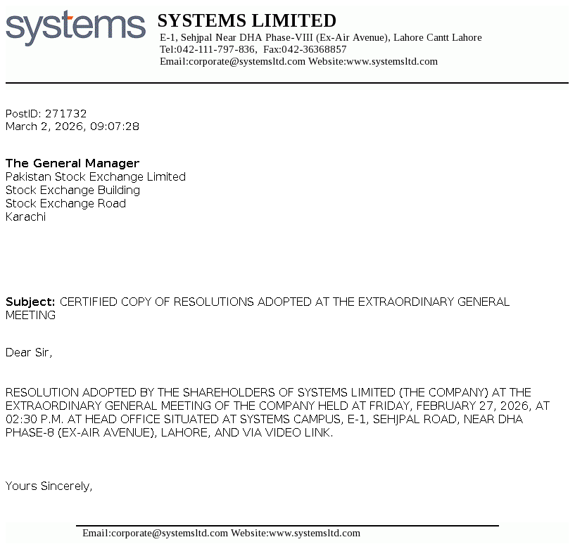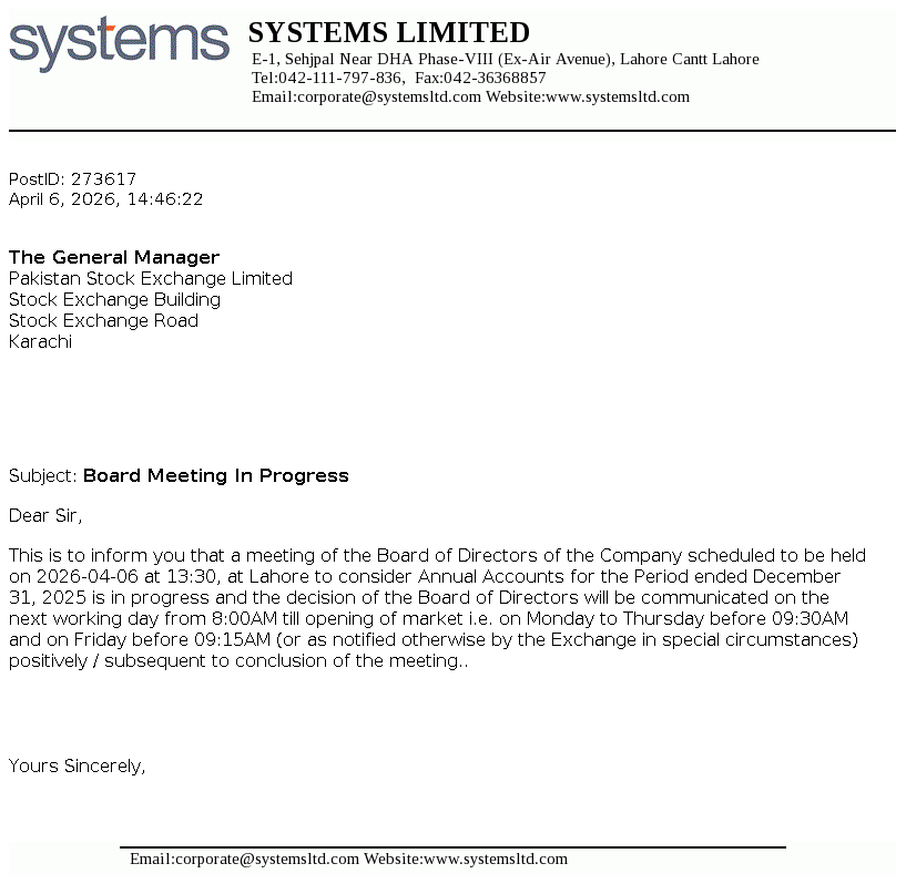 Systems Limited is a public limited company incorporated in Pakistan under the Companies Act, 2017. The Company is principally engaged in the business of software development, trading of software and business process outsourcing services.
