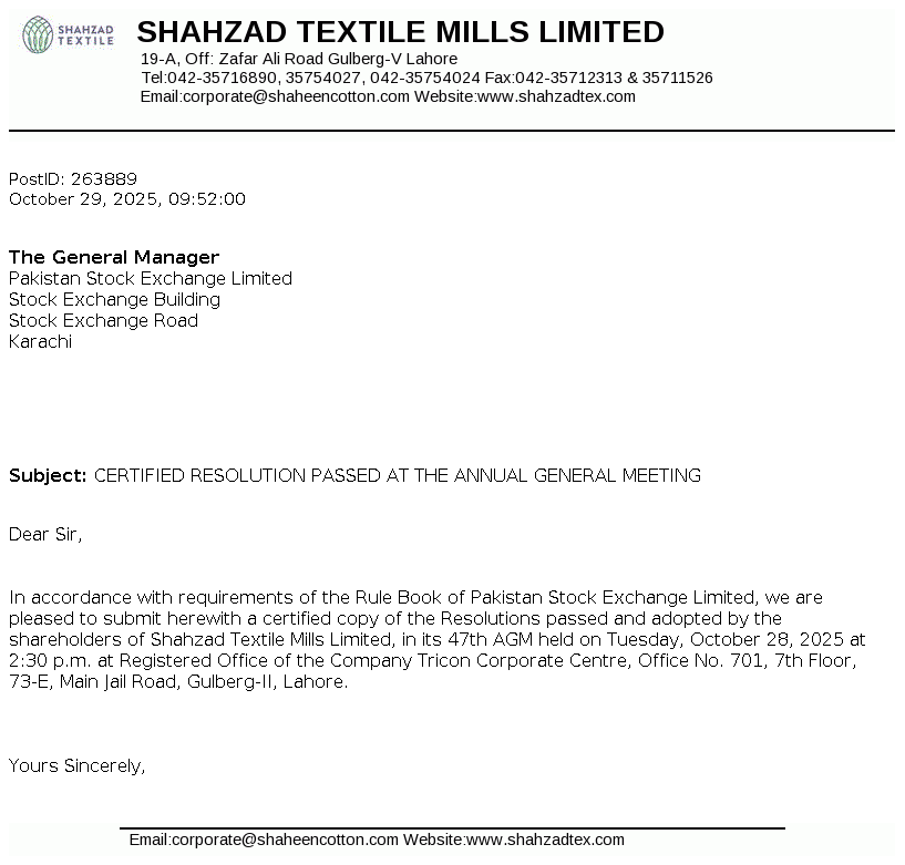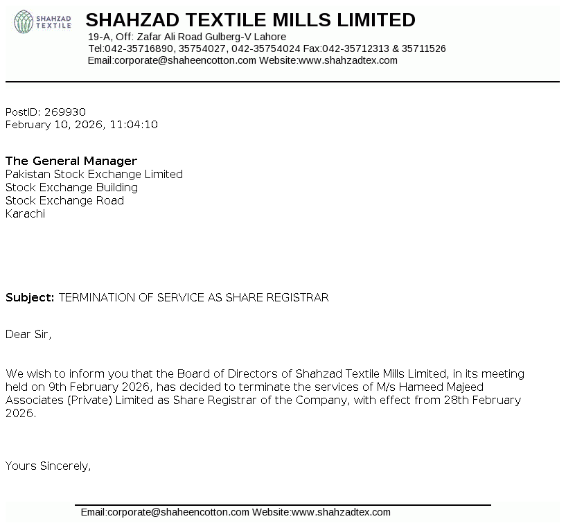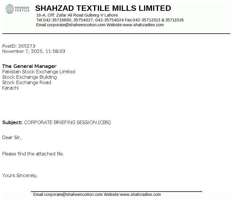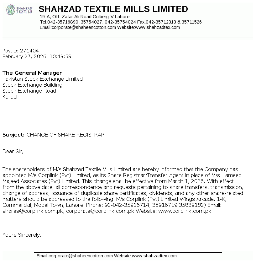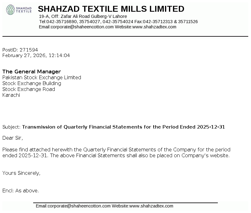 Shahzad Textile Mills Limited was incorporated in Pakistan on October 24, 1978 as a Public Limited Company under the Companies Act, 1913. The Company is domiciled in Pakistan and principle business of the Company is to manufacture and deal in all types of yarn.