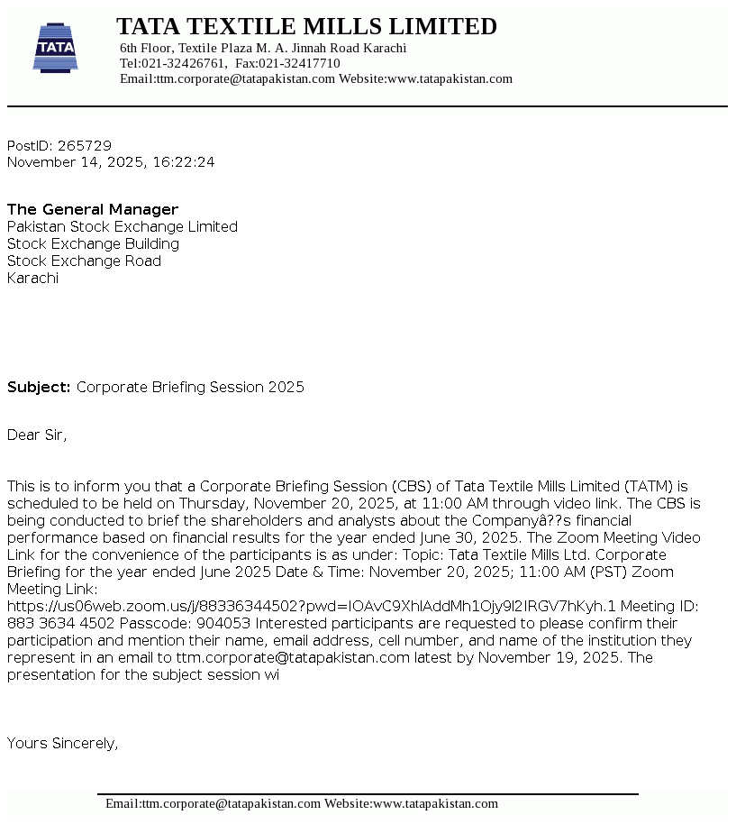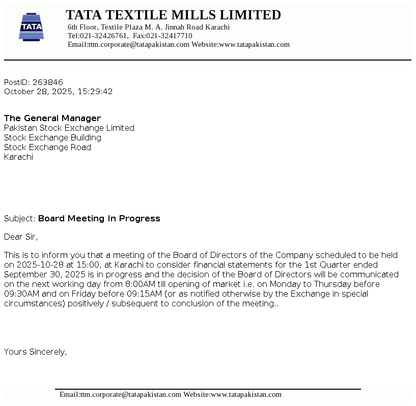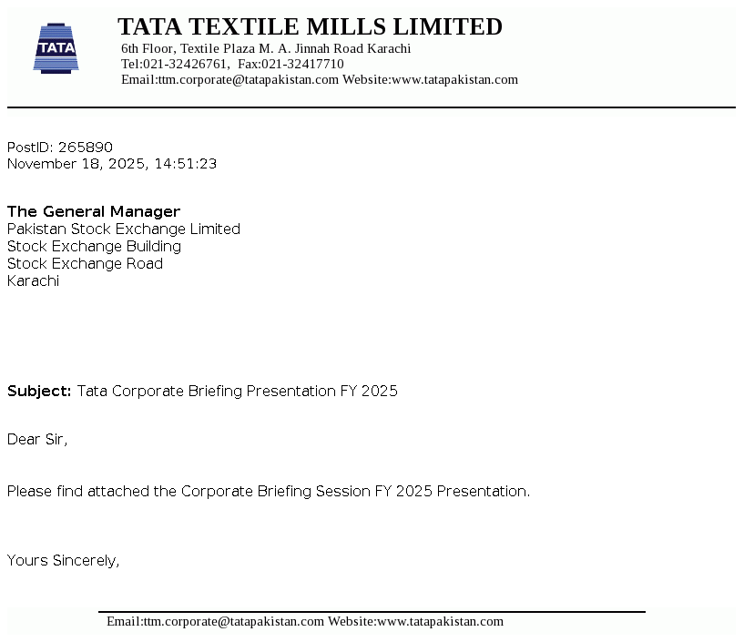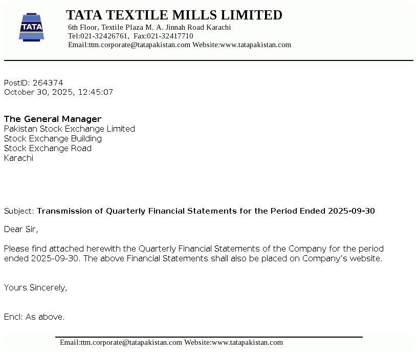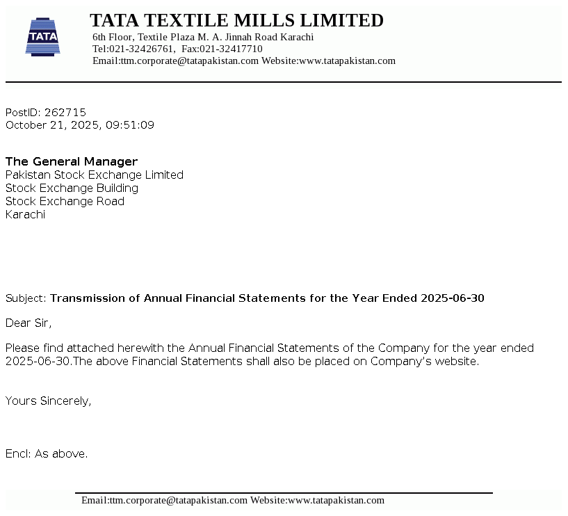 Tata Textile Mills Limited is a public limited company incorporated in Pakistan on April 15, 1987 under the Companies Ordinance, 1984 (repealed by The Companies' Act 2017). The principal activity of the Company is manufacturing and sale of yarn.