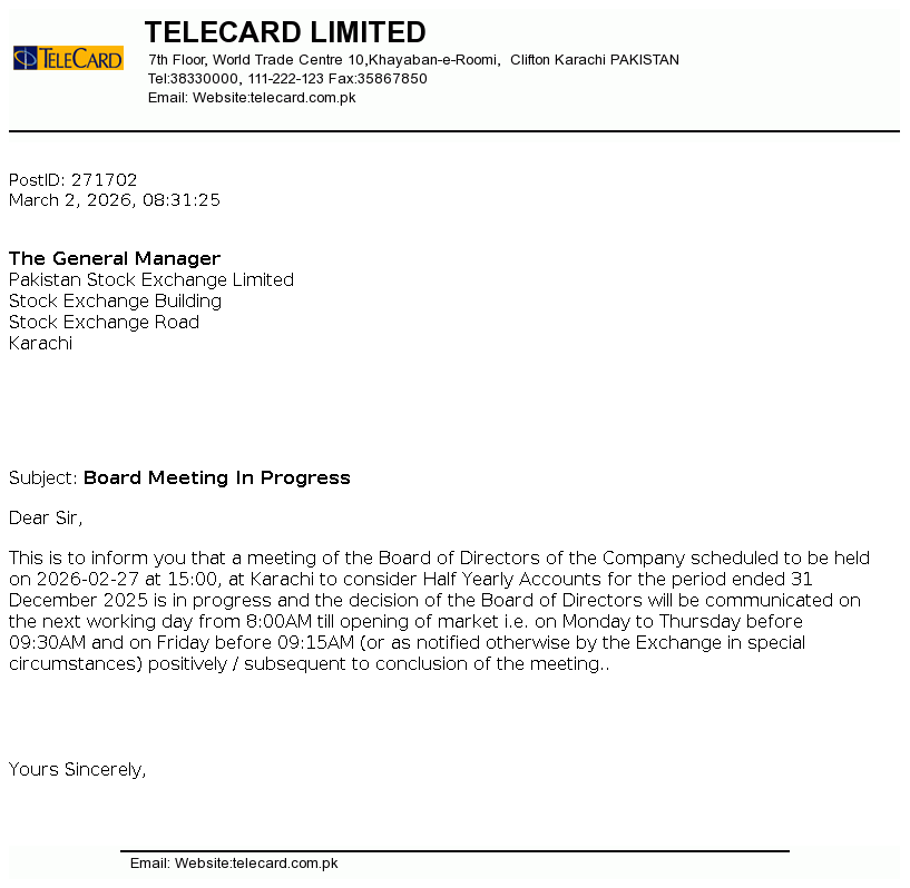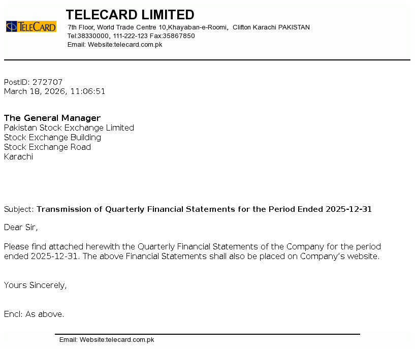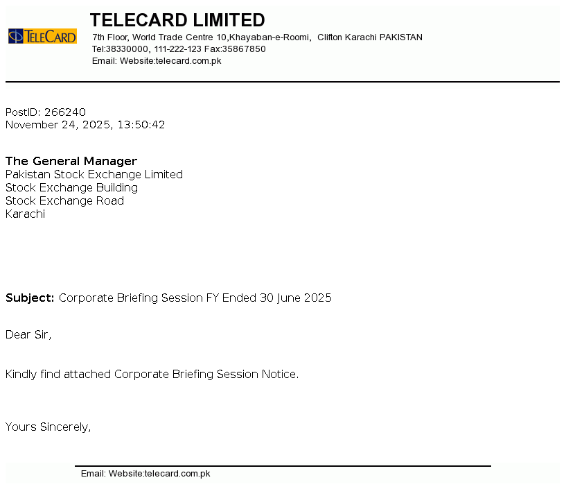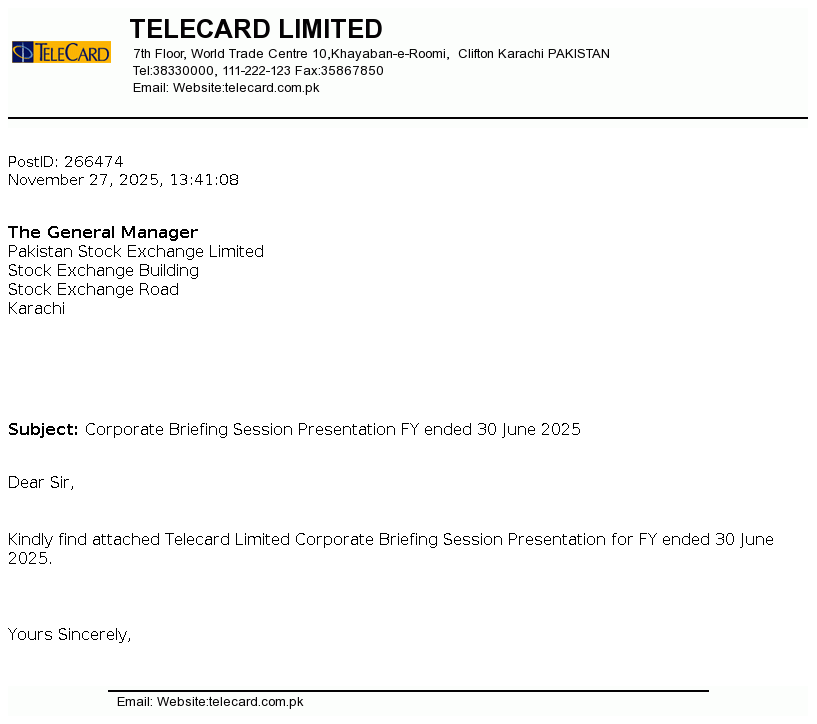 Telecard Limited Company was incorporated in Pakistan on October 29, 1992 as a public limited company under the repealed Companies Ordinance, 1984. The Company itself and through its subsidiaries is licensed to provide fully integrated telecommunications services, including basic wireless telephony, long distance and international services and payphones.