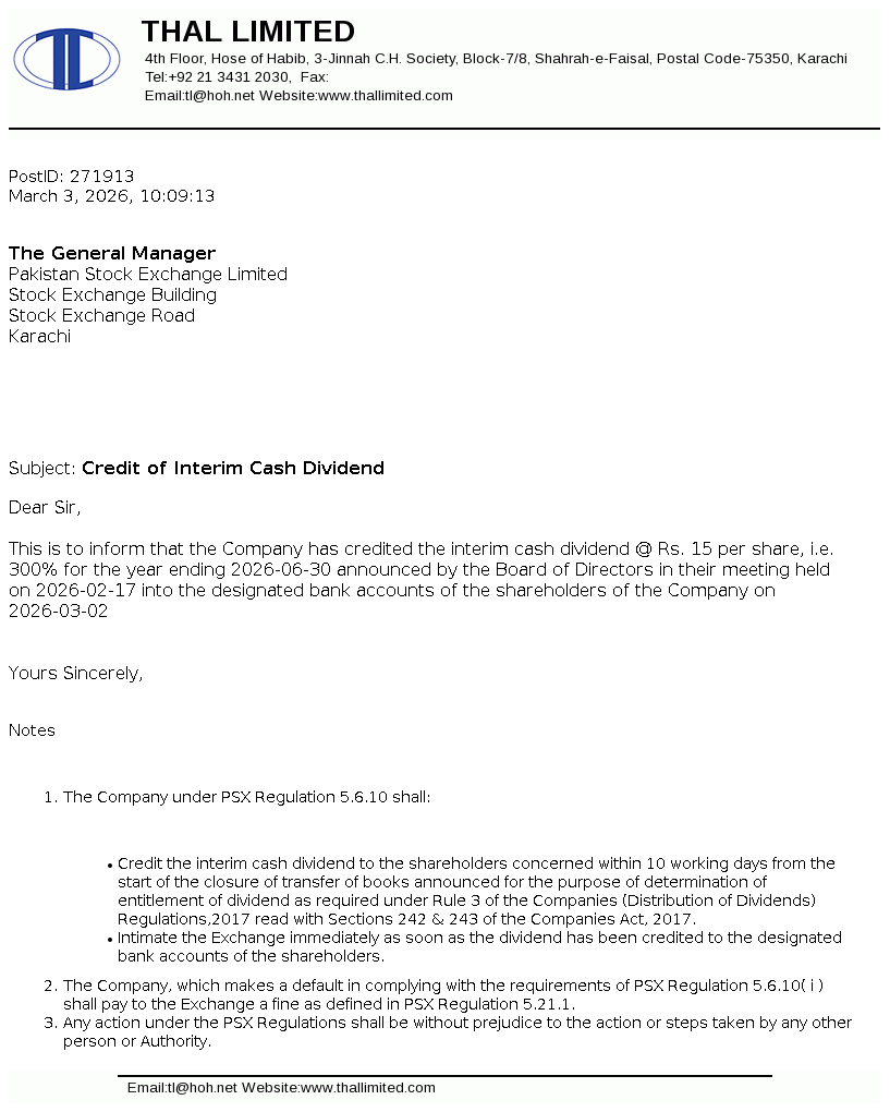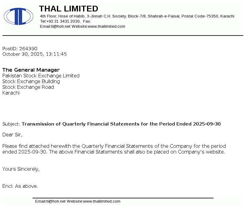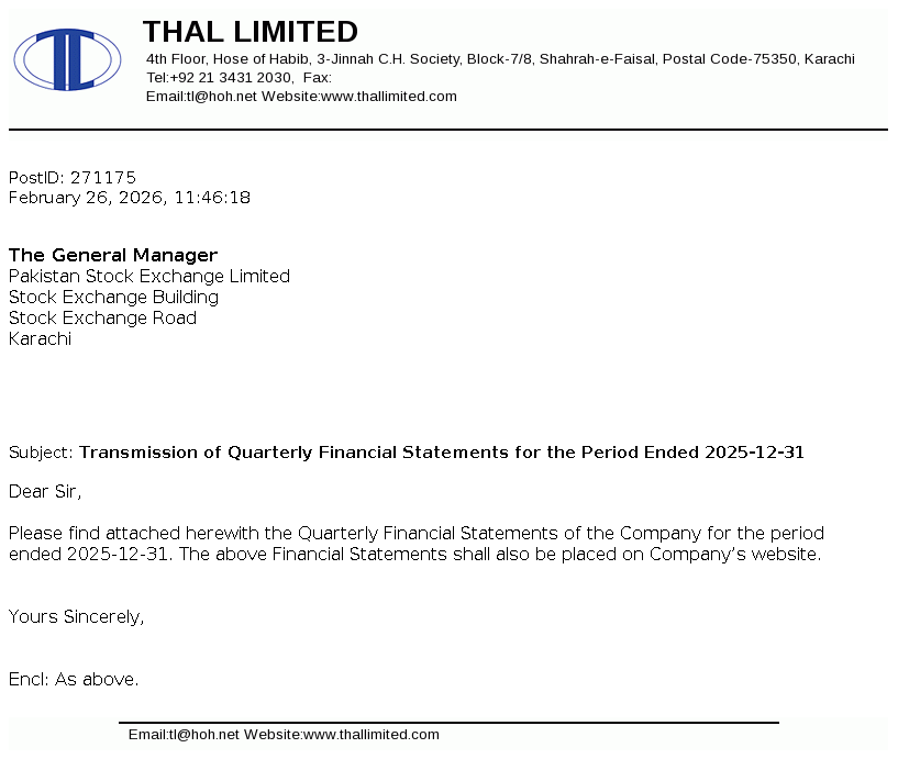 Thal Limited was incorporated on January 31, 1966 as a public company limited by shares under the Companies Act, 1913 (now the Companies Act, 2017). The Company is engaged in the manufacture of jute goods, engineering goods, papersack and laminate sheets.