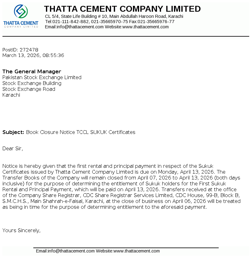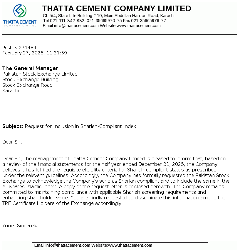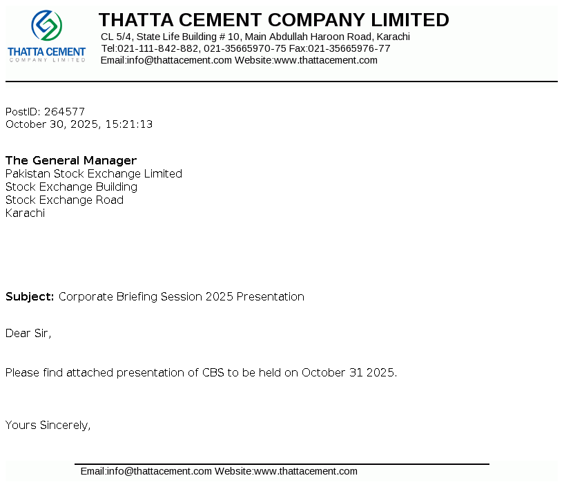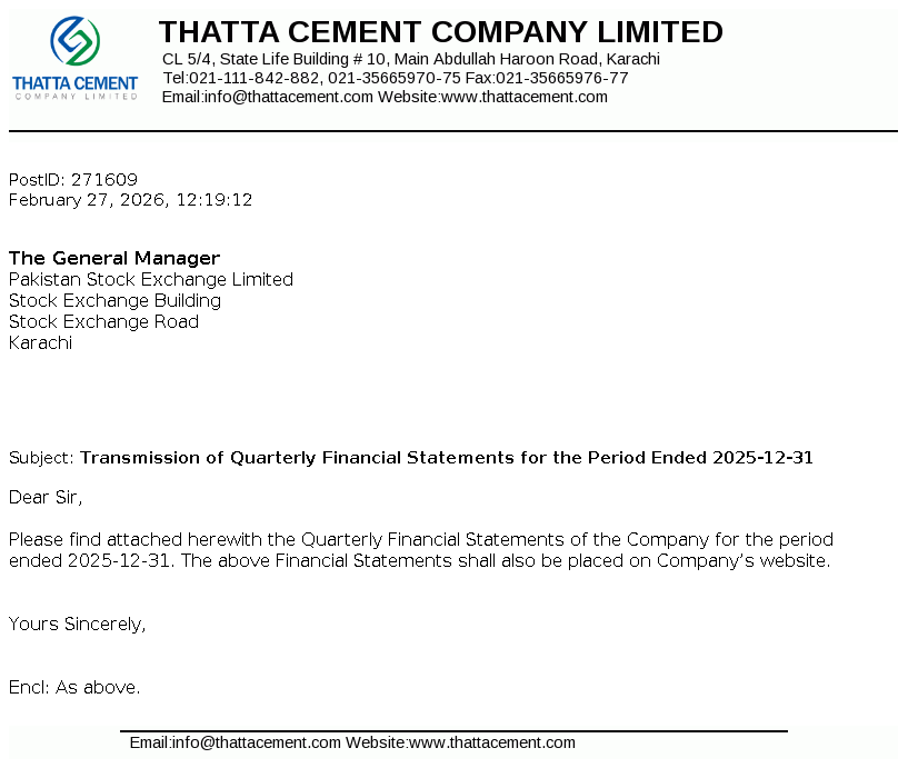 Thatta Cement Company Limited was incorporated in Pakistan in 1980 as a public limited Company. The Company's main business activity is manufacturing and marketing of cement. The Company owns shareholding of Thatta Power (Private) Limited.