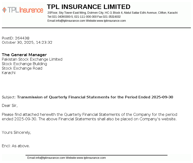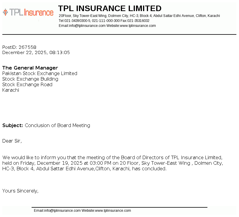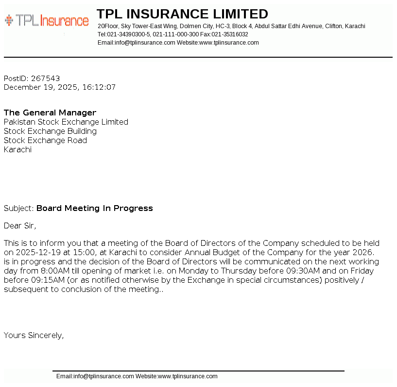 TPL Insurance Limited was incorporated in Pakistan in 1992 as a public limited company under the Companies Ordinance, 1984 (now Companies Act, 2017) to carry on general insurance business. The Company was allowed to work as Window Takaful Operator on 04 September 2014 by Securities and Exchange Commission of Pakistan (SECP) under SECP Takaful Rules, 2012 to carry on General Window Takaful Operations in Pakistan. The Company is owned 73.38% by TPL Corp Limited.