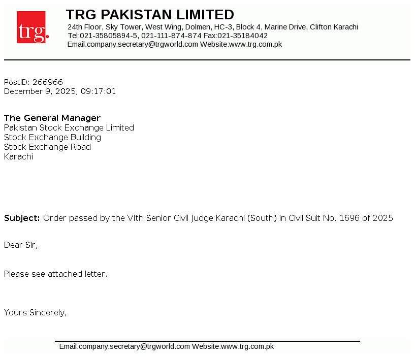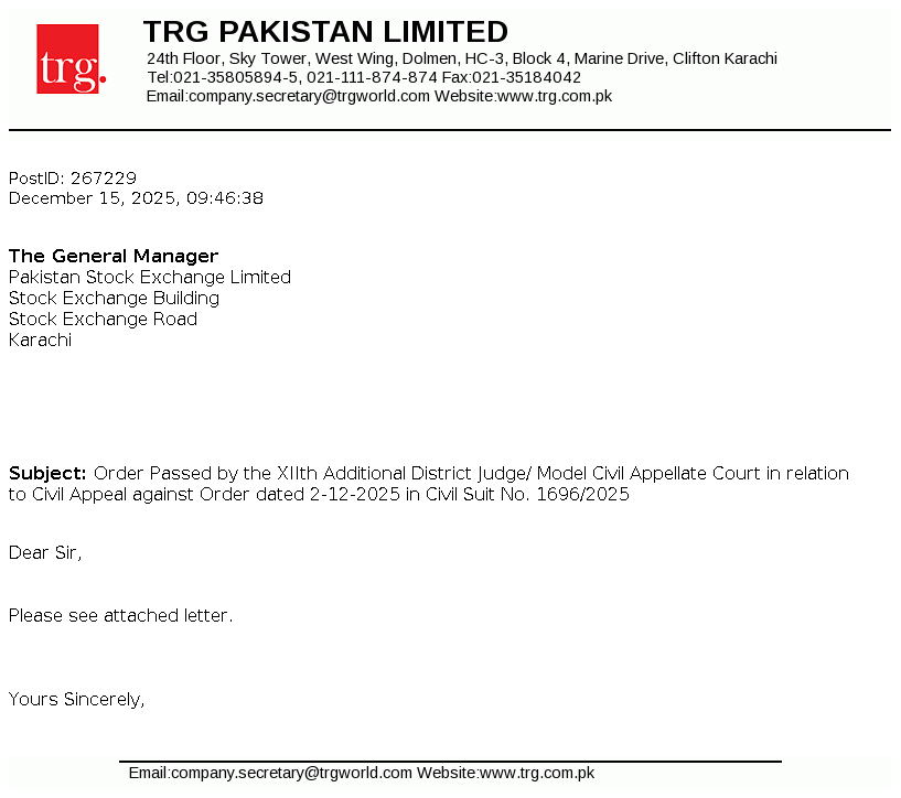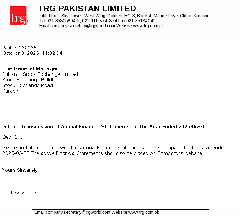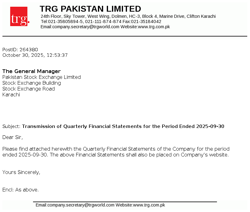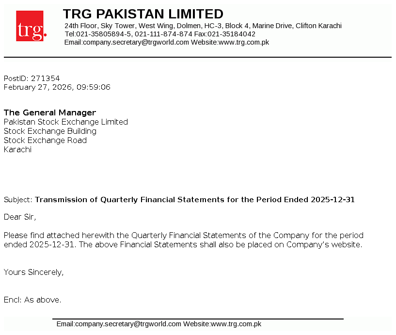 TRG Pakistan Limited was incorporated in Pakistan as a public limited company on December 2, 2002 under the repealed Companies Ordinance, 1984. On May 14, 2003 the Company obtained a license from the Securities and Exchange Commission of Pakistan ("SECP") to undertake venture capital investment as a Non-Banking Finance Company in accordance with the Non-Banking Finance Companies (Establishment and Regulation) Rules, 2003 (NBFC Rules). The principal activity of the Company, through its associate, The Resource Group International Limited (TRGIL) is to invest in a portfolio of investments primarily in the Technology, IT enabled services and medicare insurance sectors.