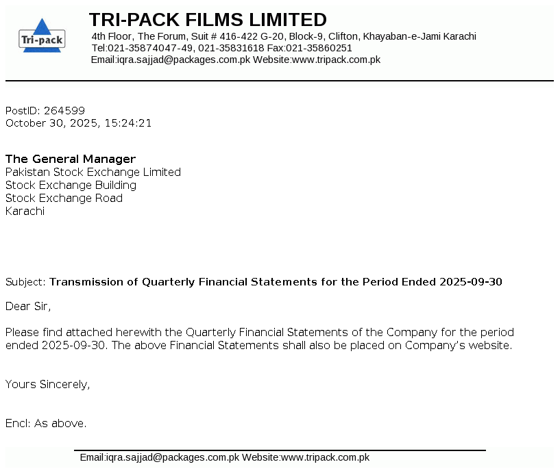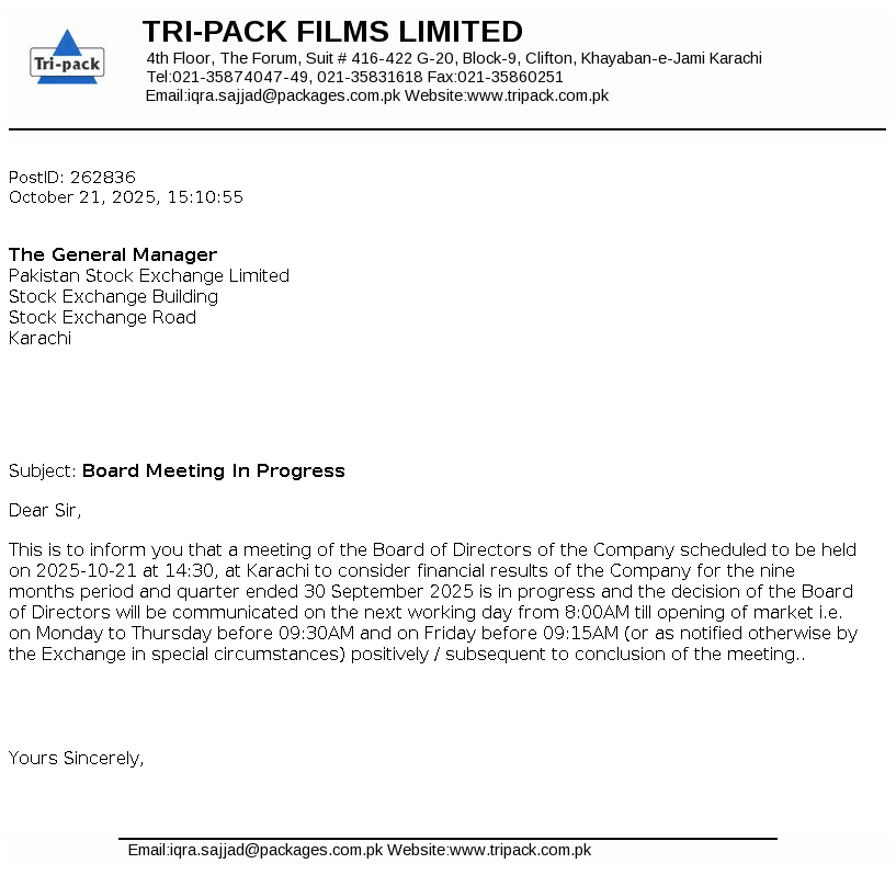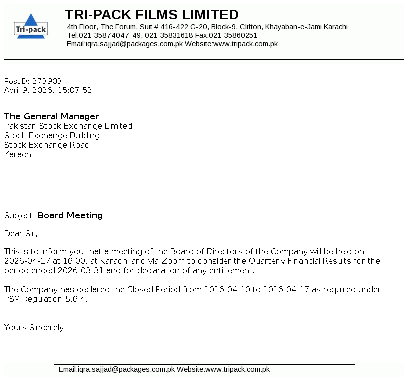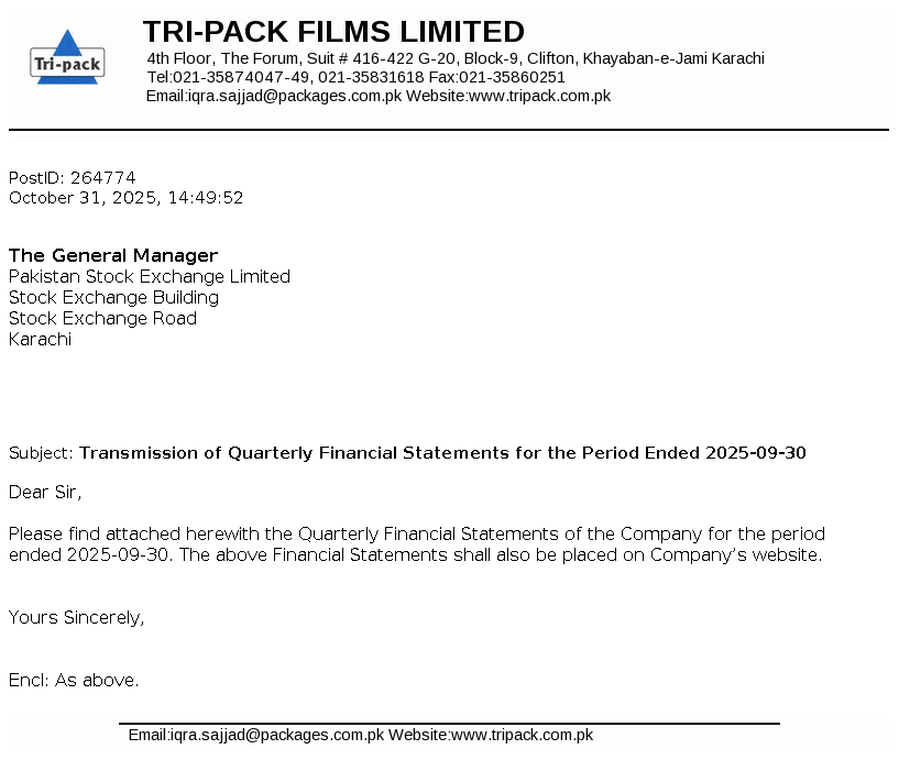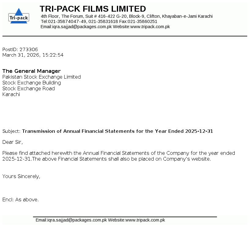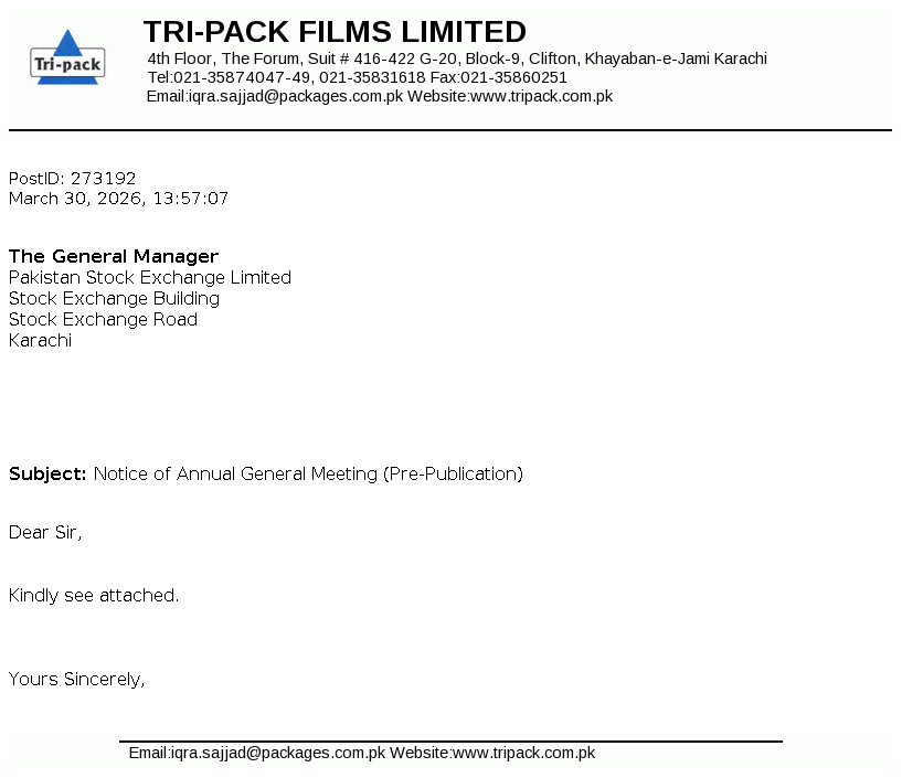 Tri-Pack Films Limited was incorporated in Pakistan on April 29, 1993 as a public limited company under the repealed Companies Ordinance, 1984. It is principally engaged in the manufacturing and sale of Biaxially Oriented Polypropylene (BOPP) film and Cast Polypropylene (CPP) film.