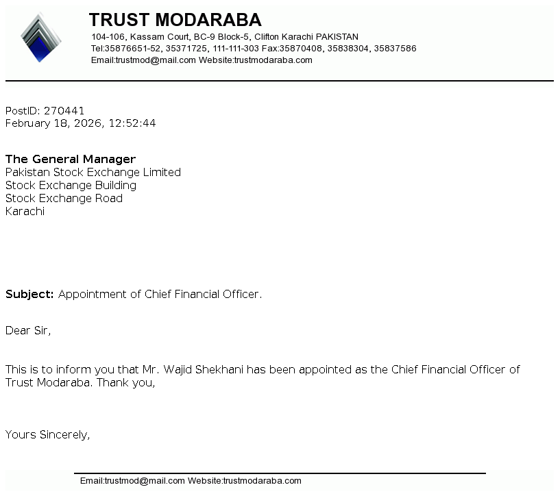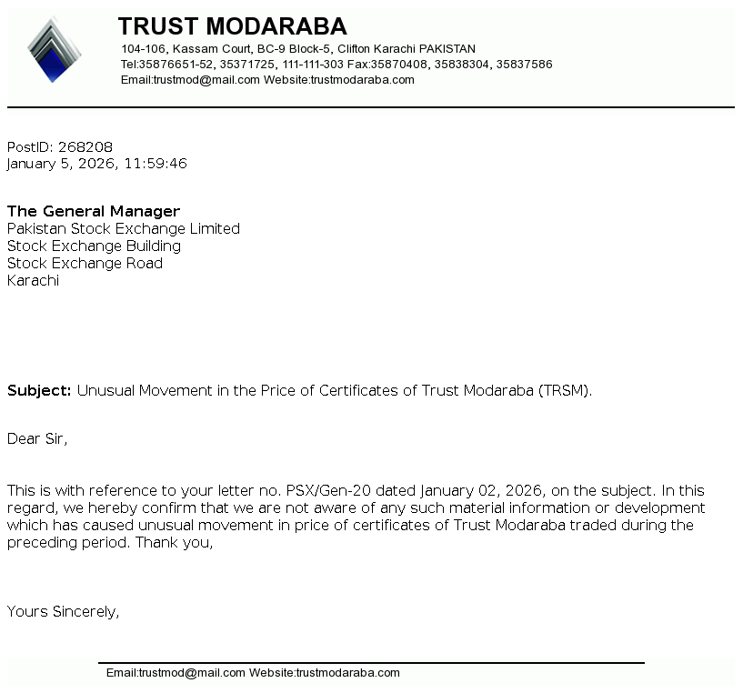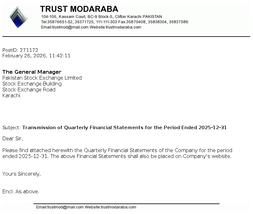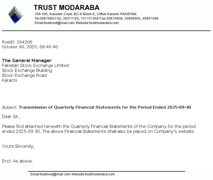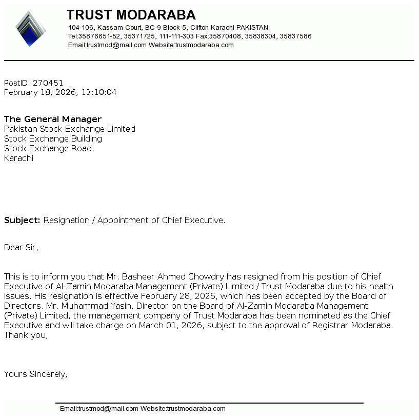 Trust Modaraba was formed in Pakistan under the Modaraba Companies and Modaraba (Floatation and Control) Ordinance, 1980 and the rules framed thereunder and is being managed by Al-Zamin Modaraba Management (Private) Limited (AZMML). The Modaraba commenced its business operations on November 12, 1991. It is listed on Pakistan Stock Exchange. The Modaraba is perpetual, multi-purpose and multi-dimensional, engaged in the business of Murabaha, Musharakah and Ijarah financing, investment in marketable securities, trading and other permissible businesses.