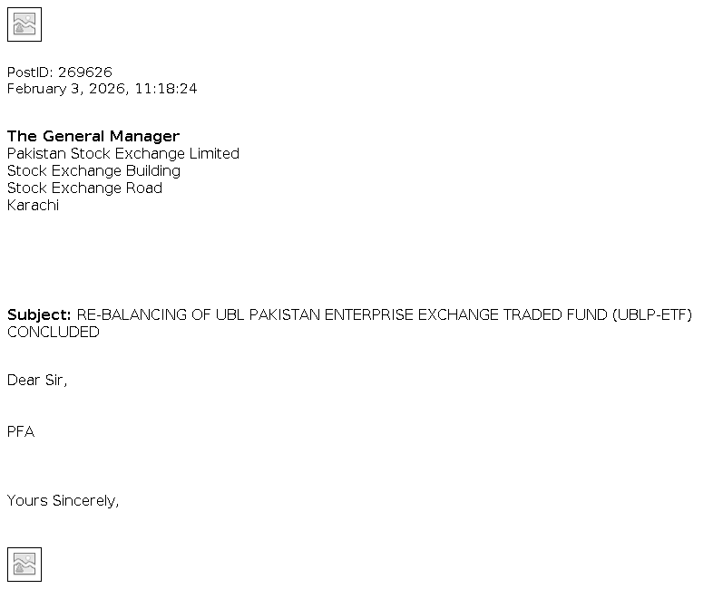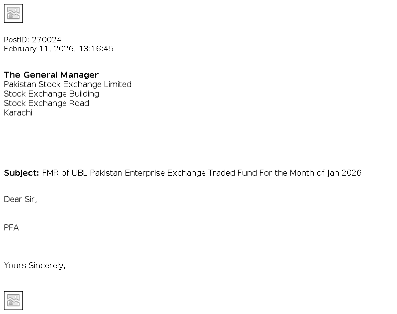 UBL Pakistan Enterprise Exchange Traded Fund (UBL PAK ETF) was established under a Trust Deed, executed between UBL Fund Managers Limited as the Management Company and Central Depository Company of Pakistan Limited as the Trustee. UBL PAK ETF aims to track the performance of the Benchmark index in order to provide long-term capital appreciation and dividends yield to the investors. The fund aims to track the performance of top 9 companies with highest free float market capitalization of KSE-100 index (excluding Oil and Gas sector companies). Click for further details.