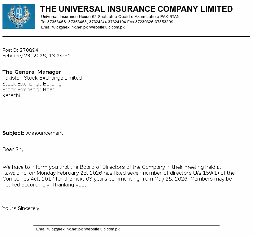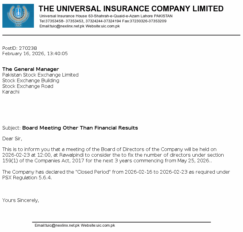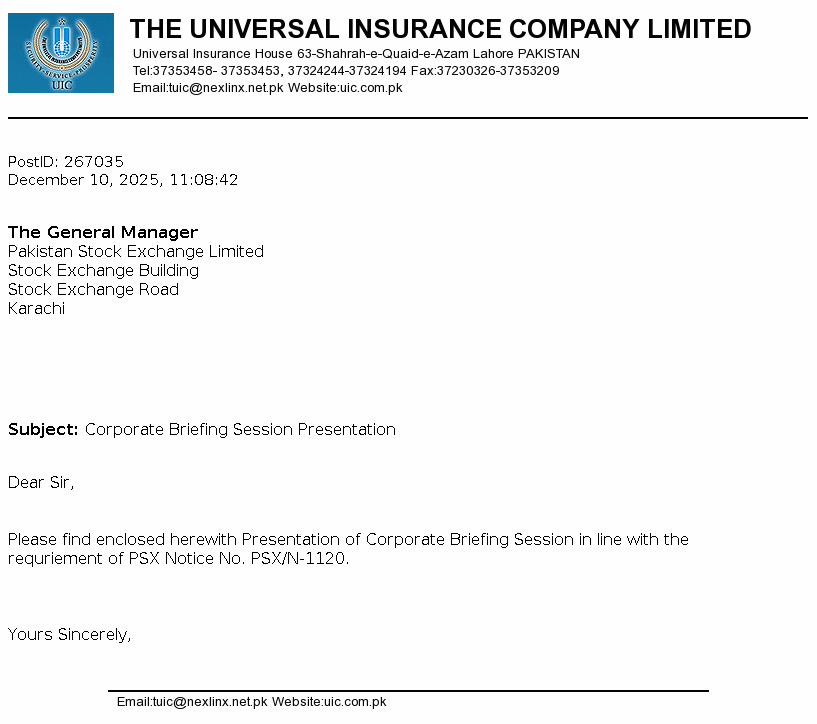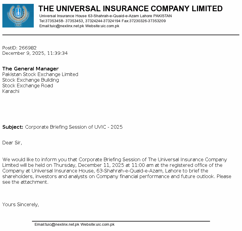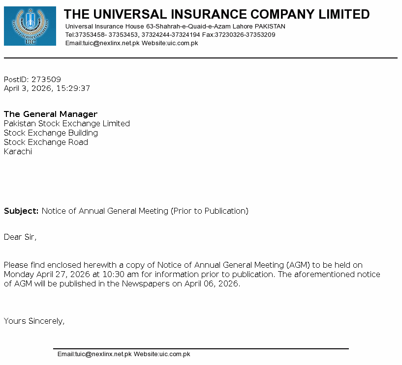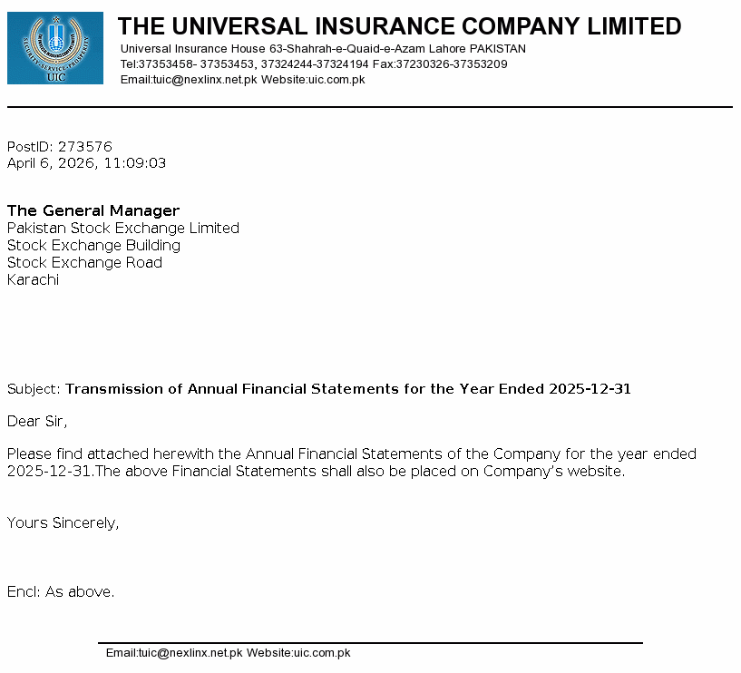 The Universal Insurance Company Limited is a public limited company incorporated in Pakistan on May 09, 1958 under the Companies Act, 1913 (now the Companies Act, 2017). The Company is engaged in non-life insurance business. The Company is a Subsidiary of Bibojee Services (Pvt.) Limited.