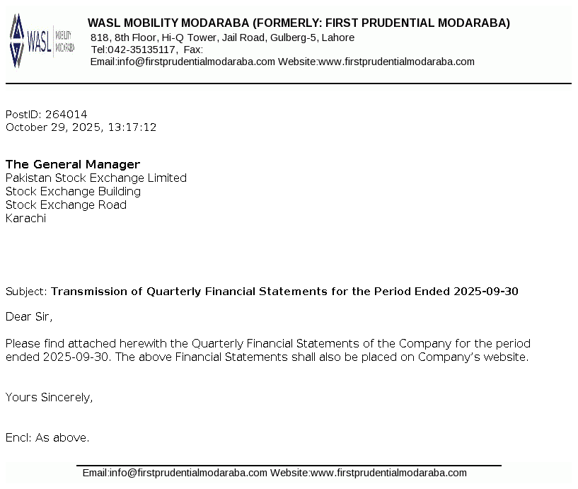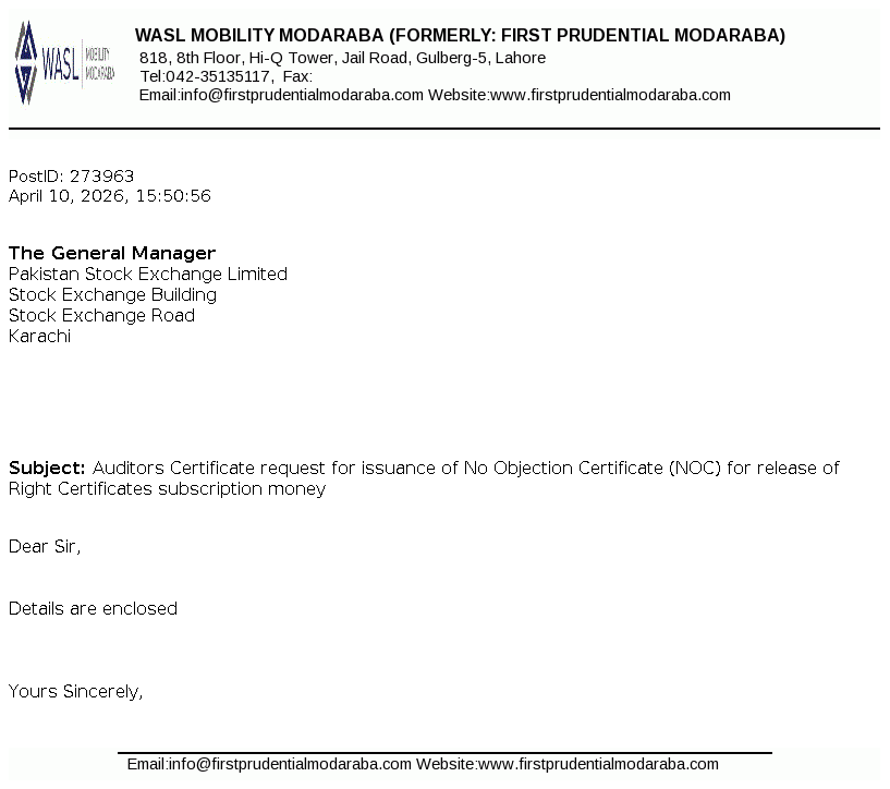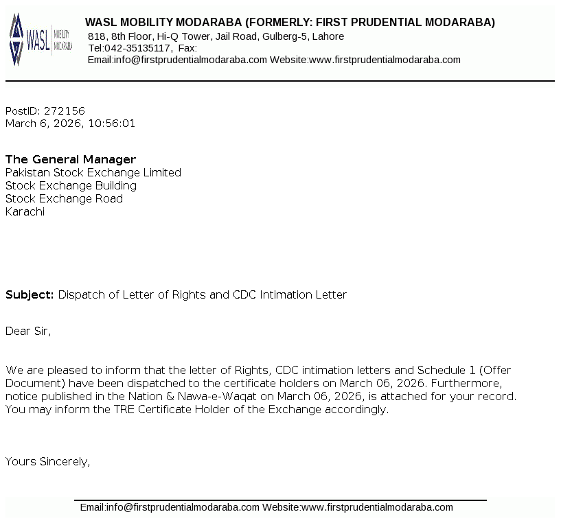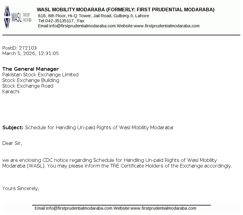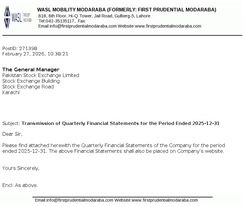 Wasl Mobility Modaraba (Formerly First Prudential Modaraba) is a multipurpose, perpetual Modaraba. The Modaraba is registered under the Modaraba Companies and Modaraba (Floatation and Control) Ordinance, 1980. The Modaraba is engaged in various modes of Islamic funding's and businesses which include ijarah financing, deployment of fund in musharika, morabaha and investment in securities.