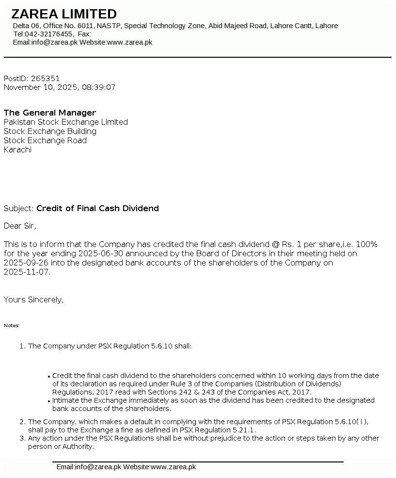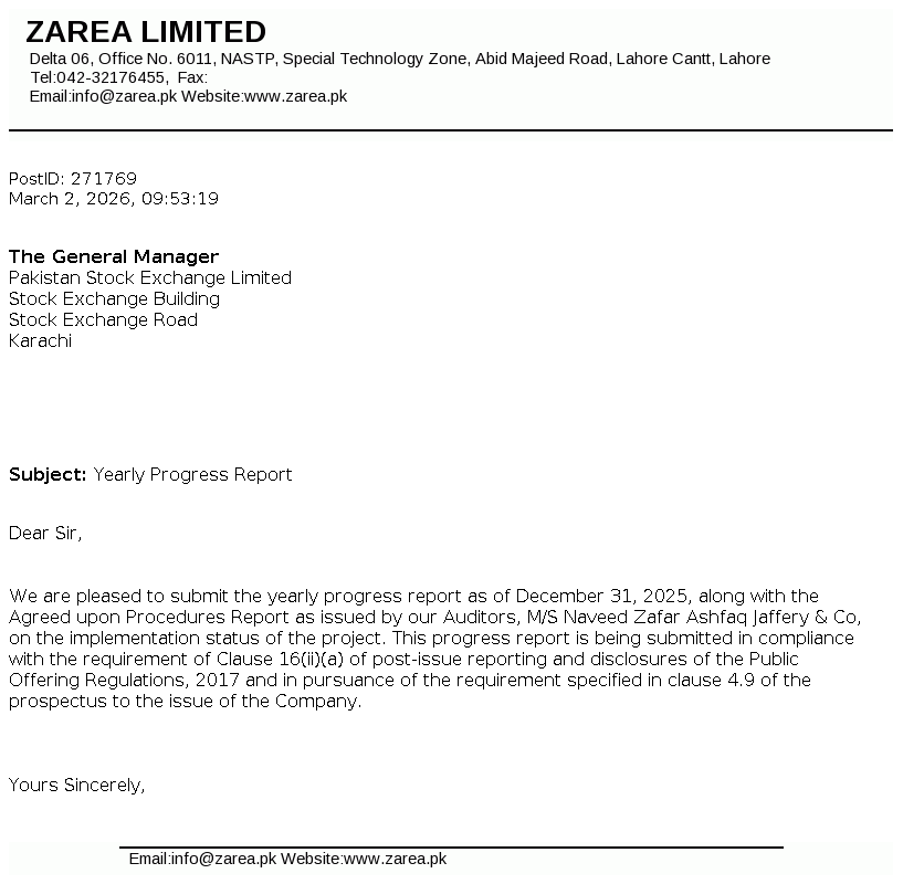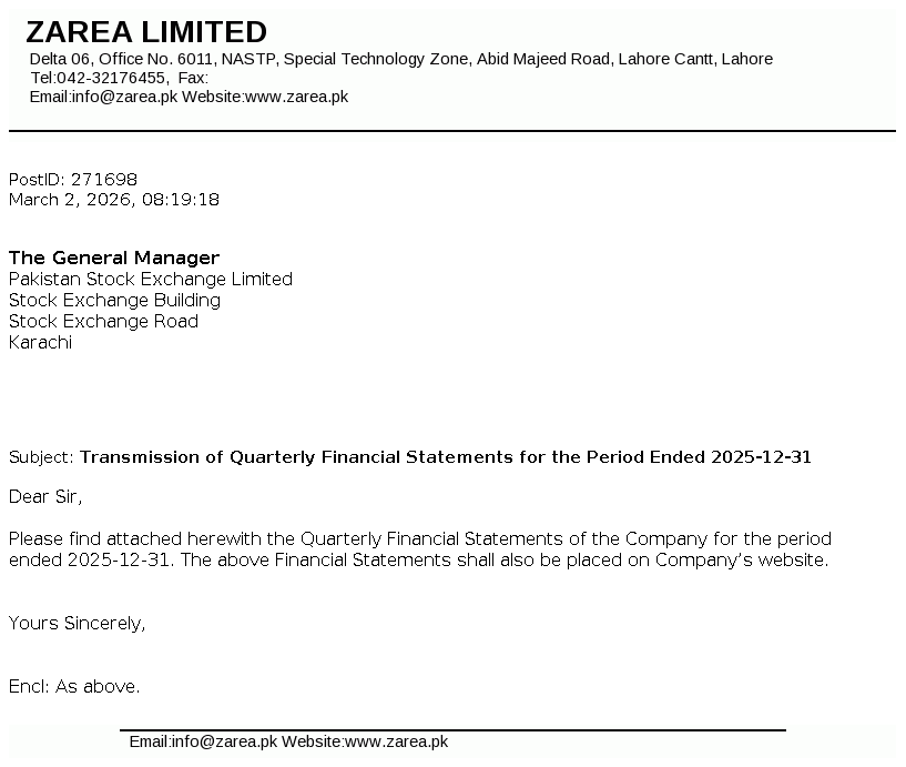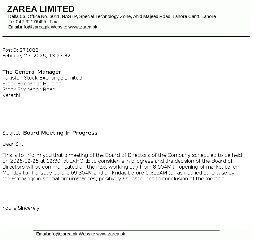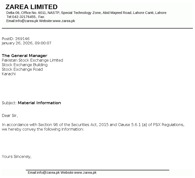 Zarea Limited is registered as a public limited company in Pakistan. The company was incorporated on 16 September 2020 under the Companies Act, 2017. It operates as a B2B e-commerce marketplace, streamlining commodity trade with technology. The company is transforming procurement in key industries, driving efficiency and growth in Pakistan’s digital economy.
