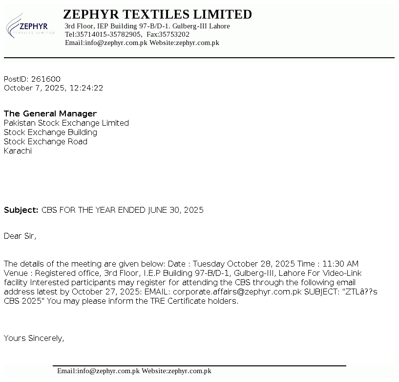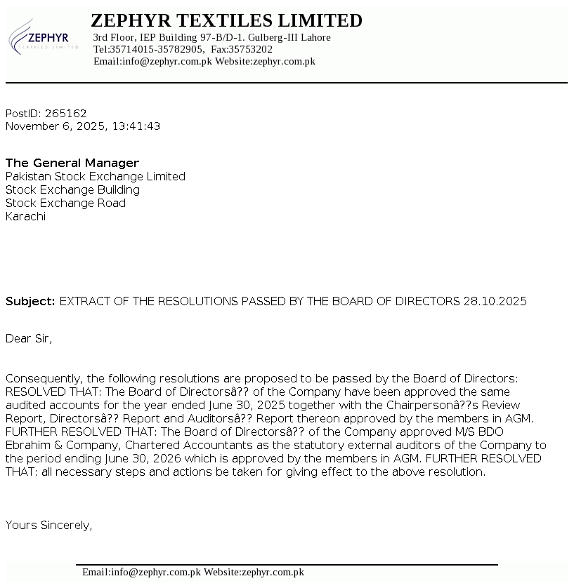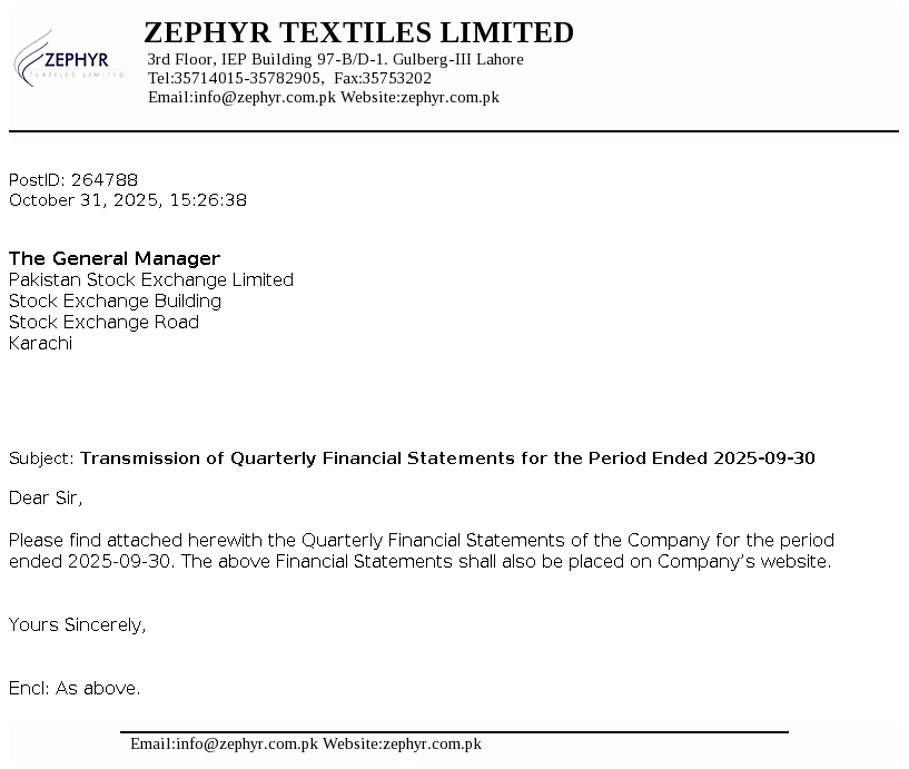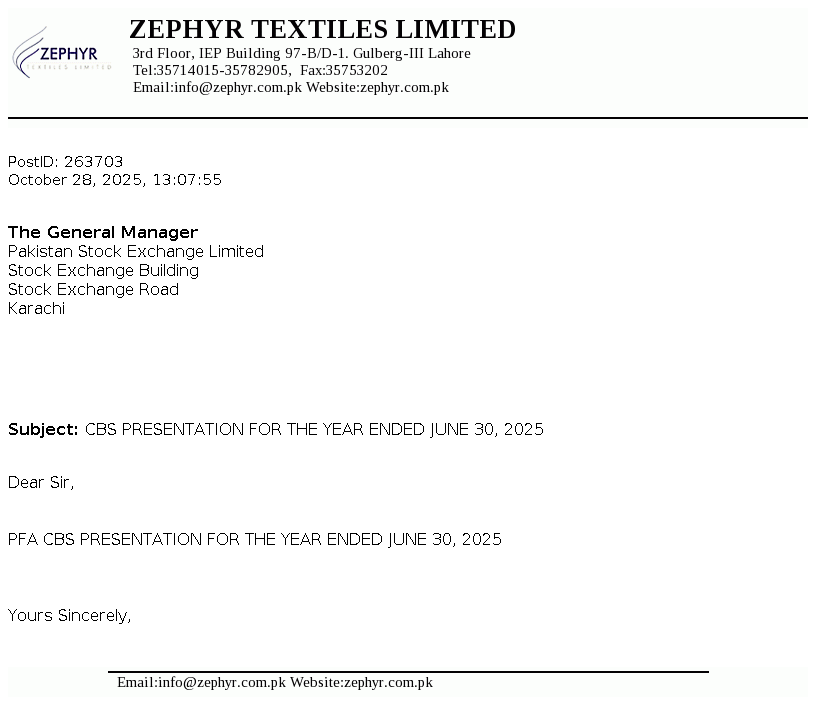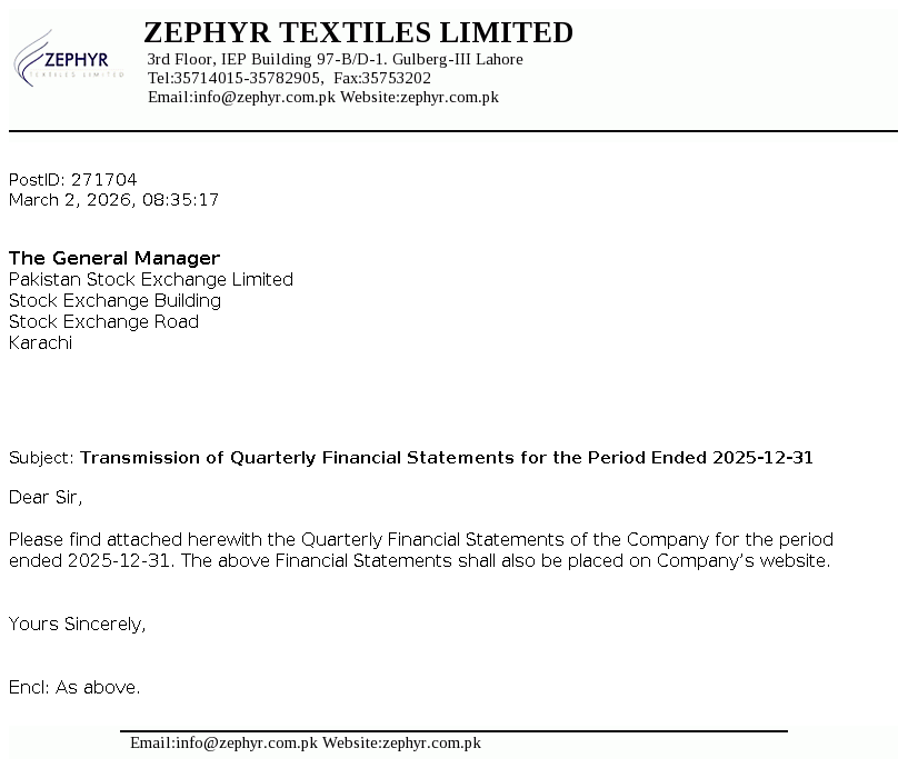 Zephyr Textiles Limited was incorporated in Pakistan on February 26, 1999 as a private limited Company under the Companies Ordinance, 1984. Subsequently on October 04, 2004 it was converted into a public limited Company. The Company is principally engaged in the manufacturing, dying and trading of woven cloth which also includes towels.